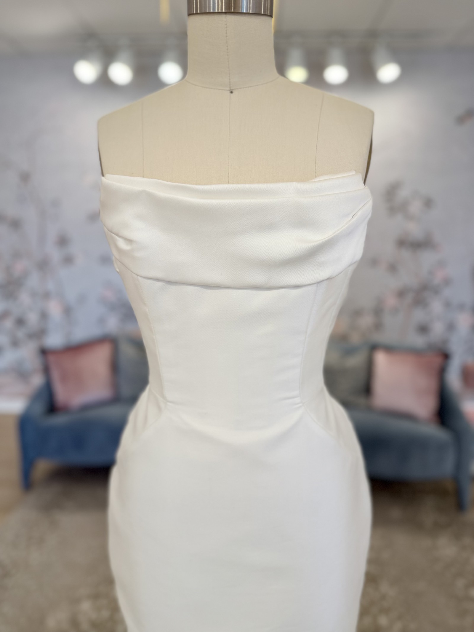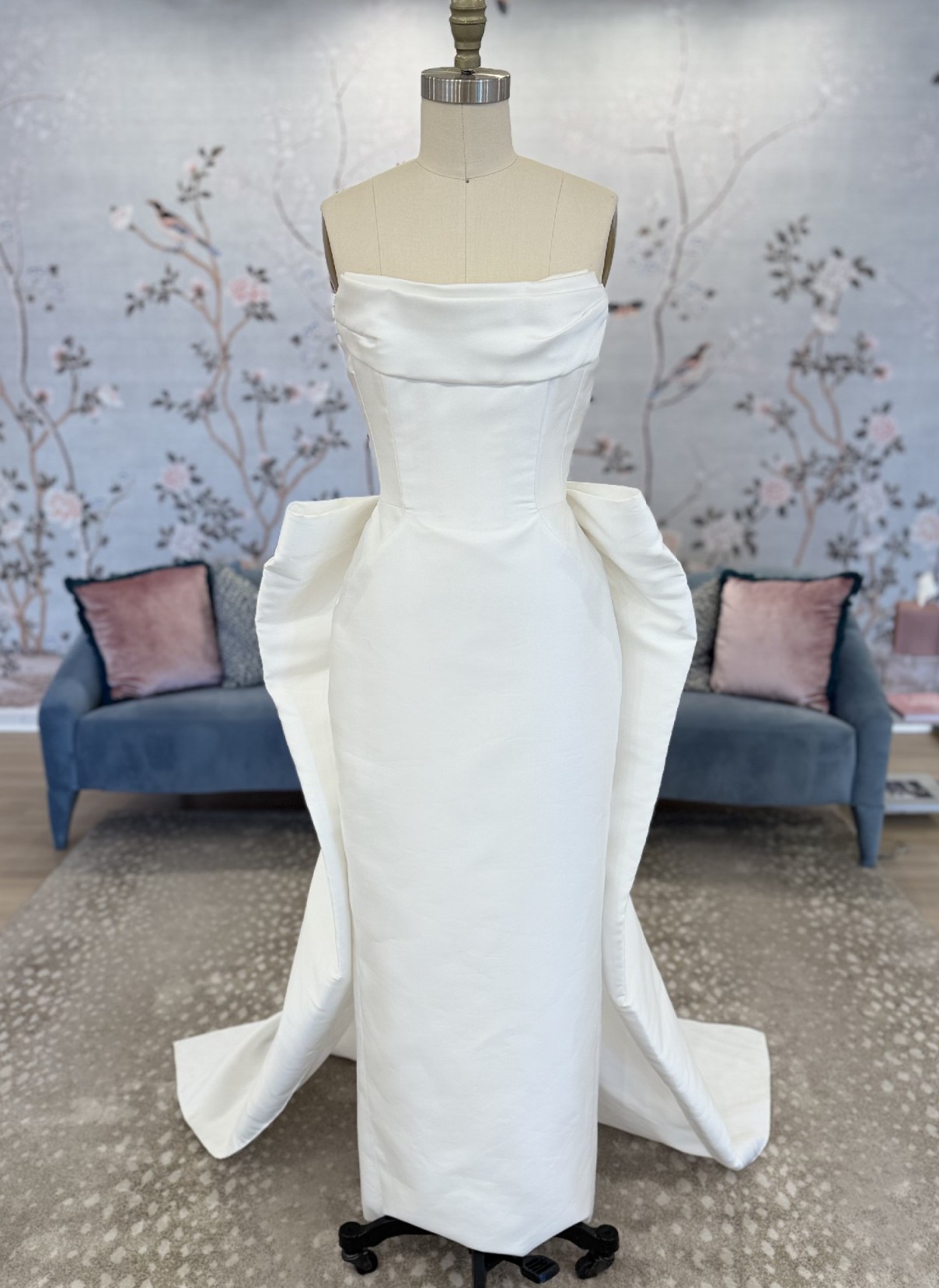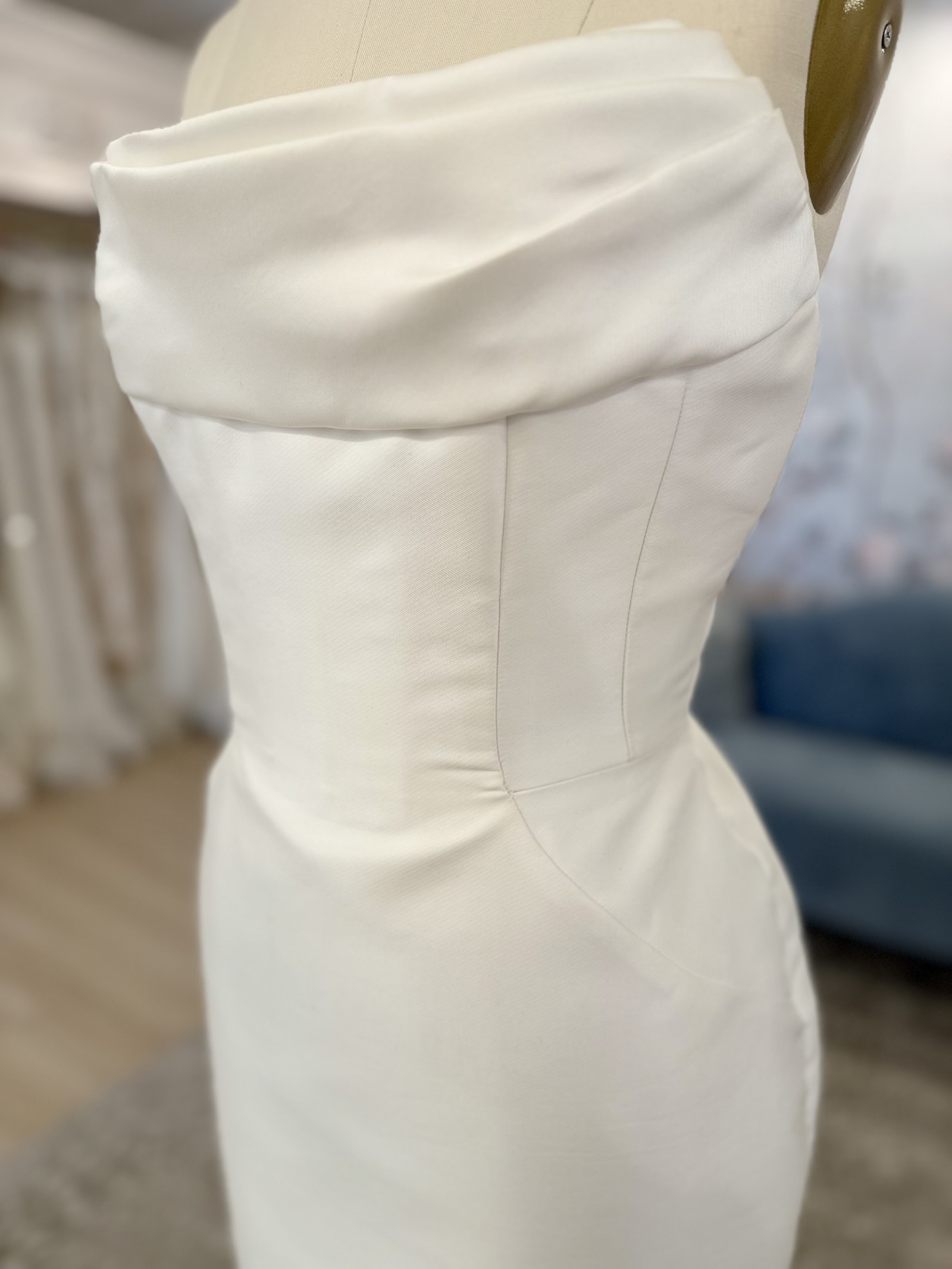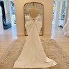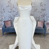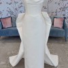 Peaked strapless columnar gown of Mikado Scuba with soft pleating along the neckline. The sample comes with the detachable bow.
