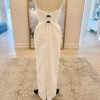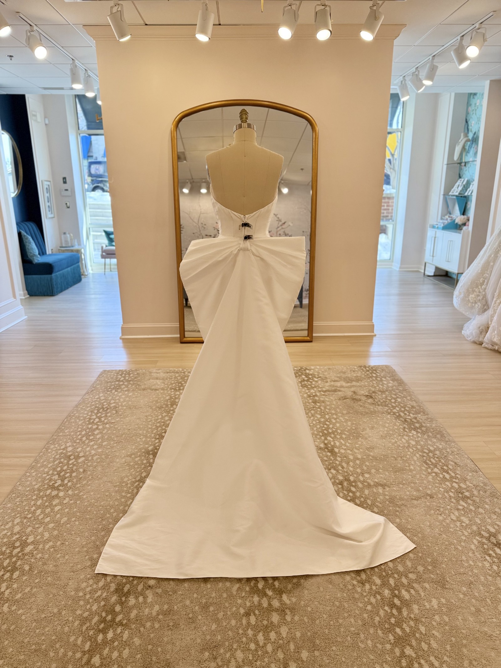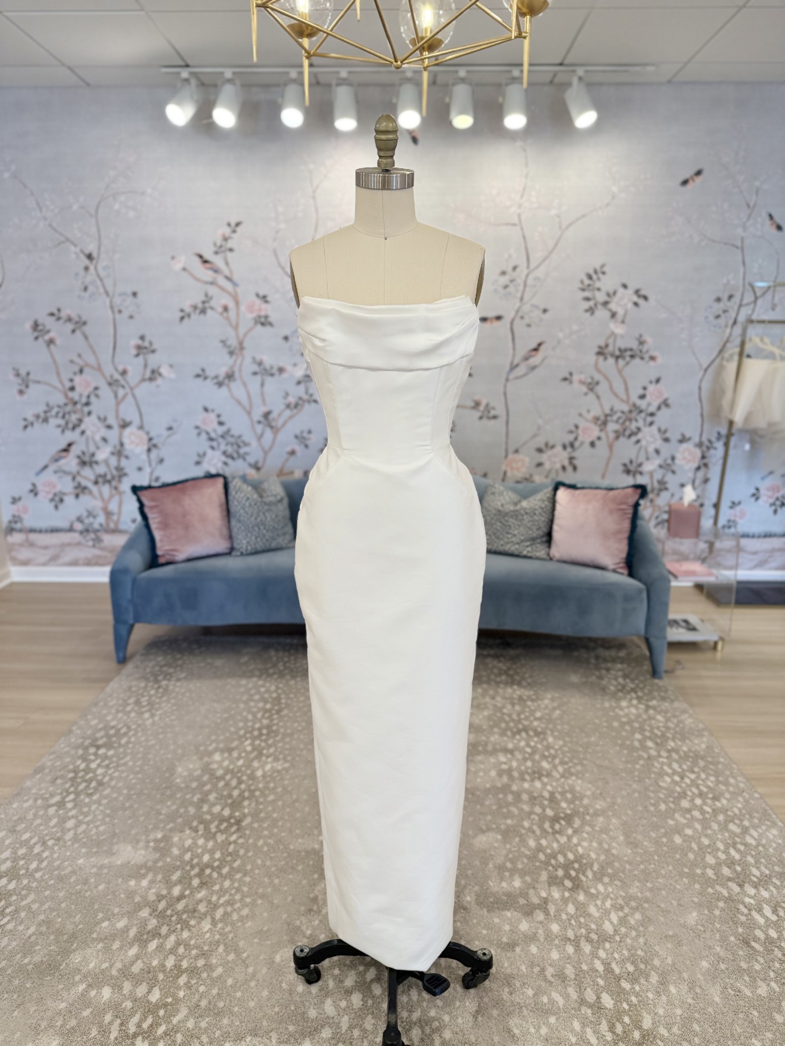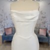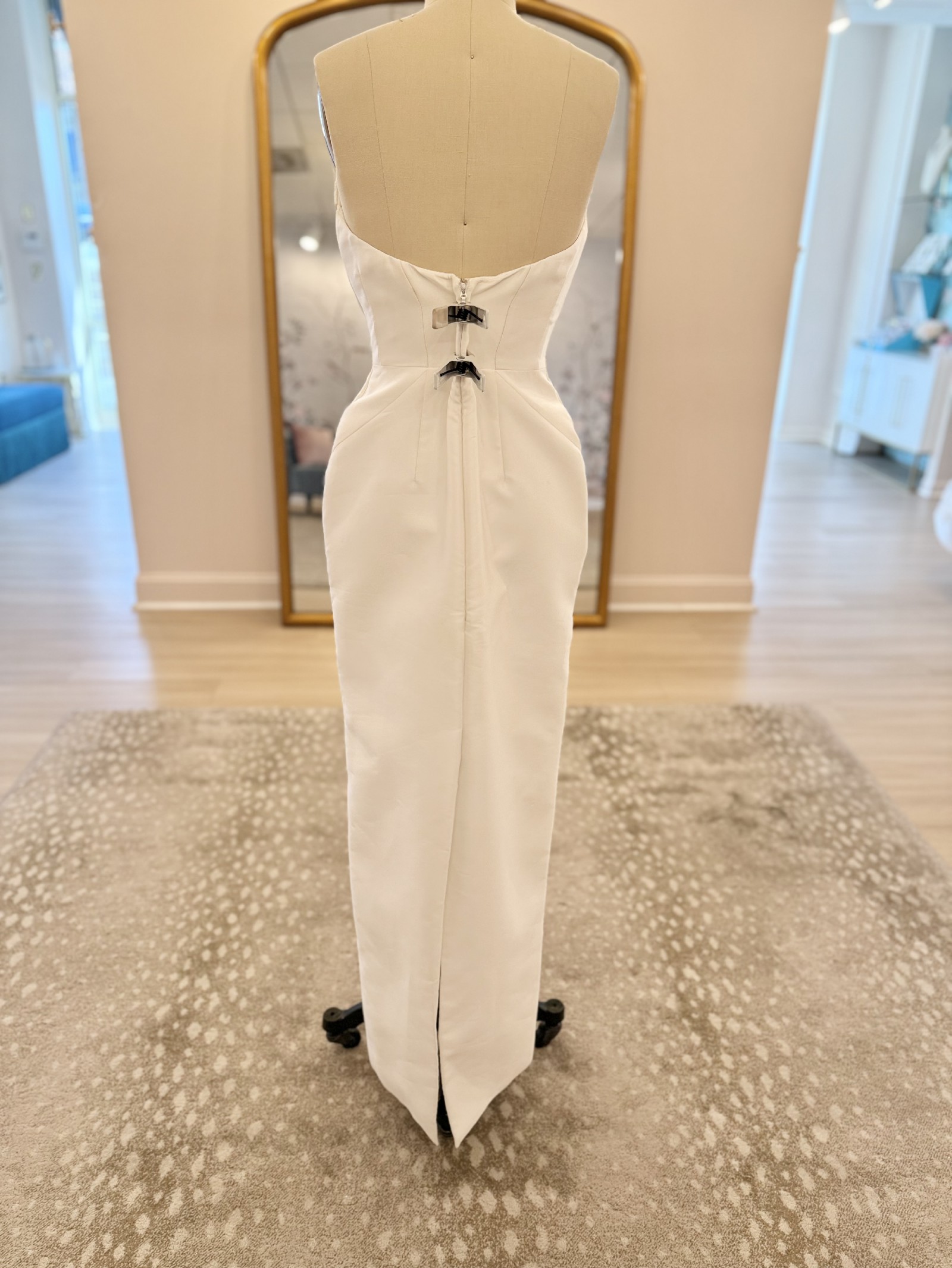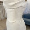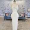 Peaked strapless columnar gown of Mikado Scuba with soft pleating along the neckline. The sample comes with the detachable bow.