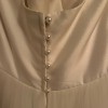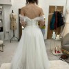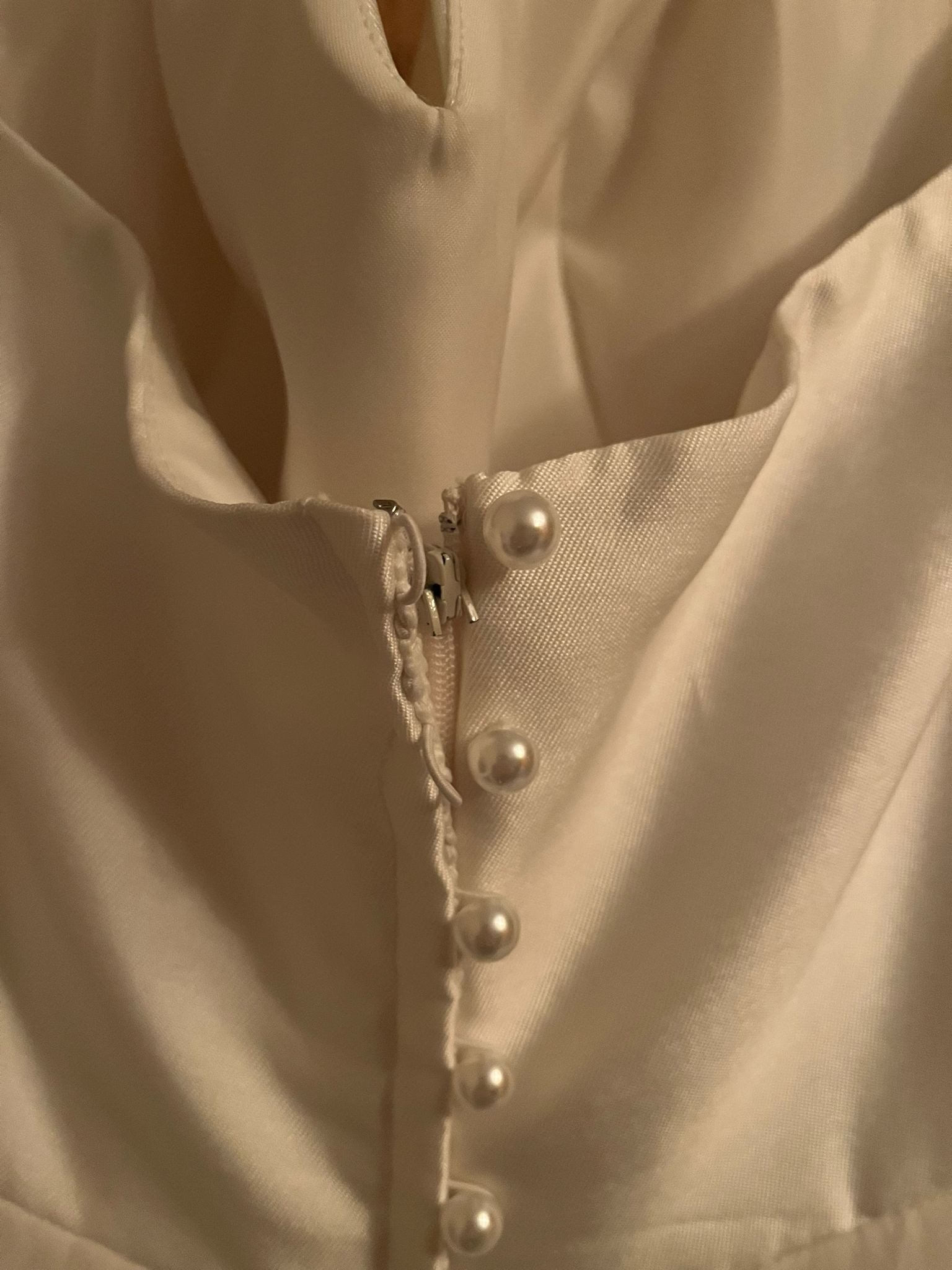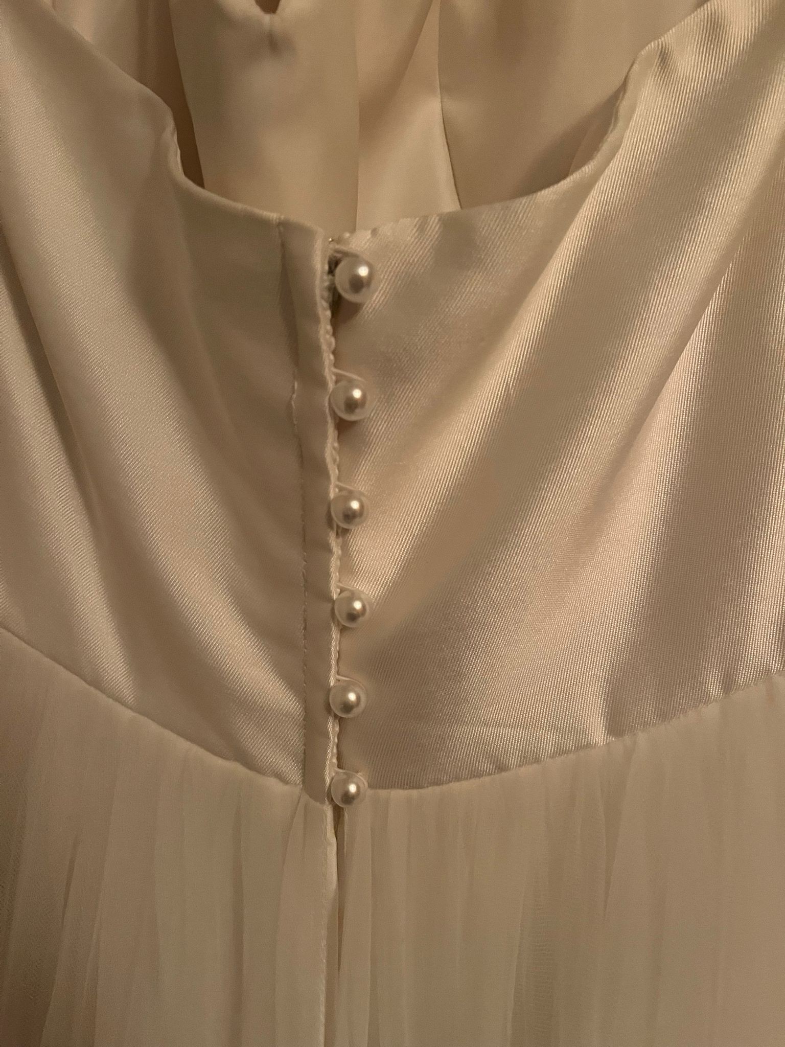 Pearl buttons on the back of the bodice, over a zip closure. The A-line skirt is made from tulle and is underlined. Does not come with sleeves in second photo.