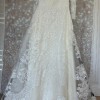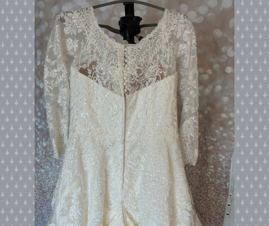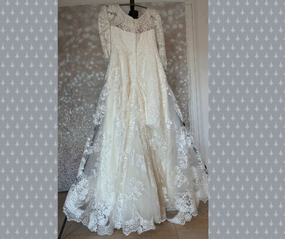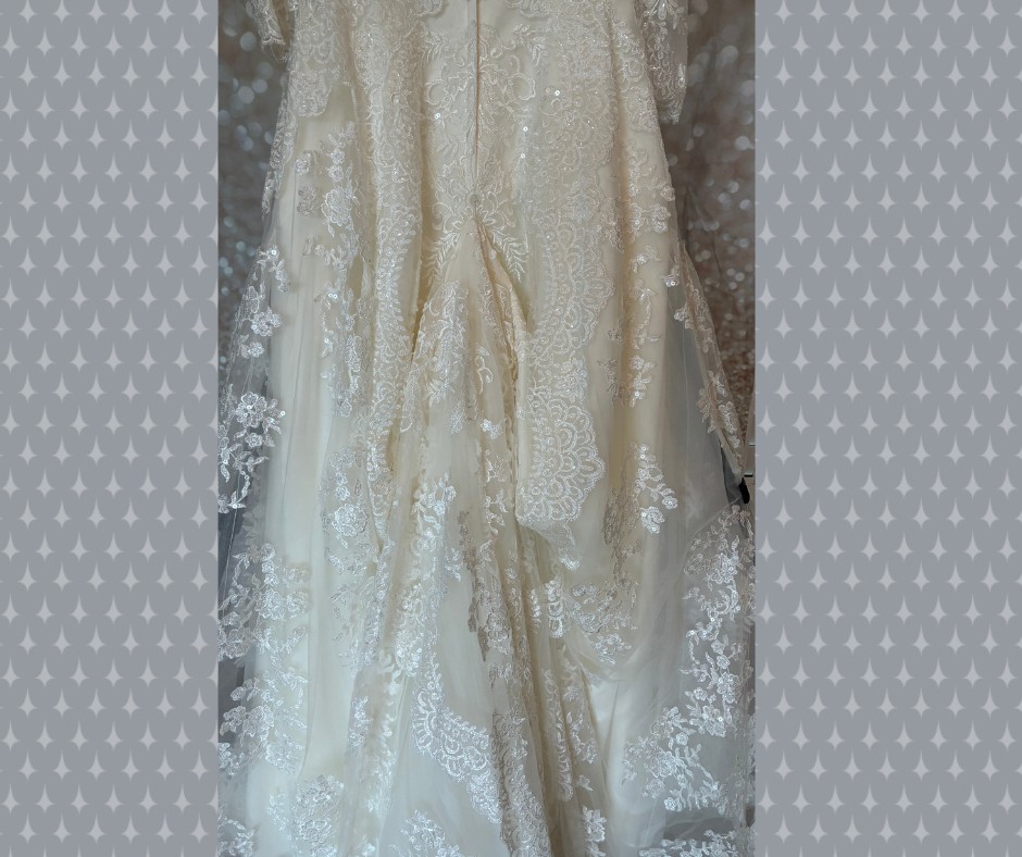 The flowing A-line skirt moves effortlessly and is finished with an intricately detailed lace hem, adding depth and luxury to every step and photo. The back features an illusion lace panel with classic covered buttons, creating a romantic and sophisticated finish.