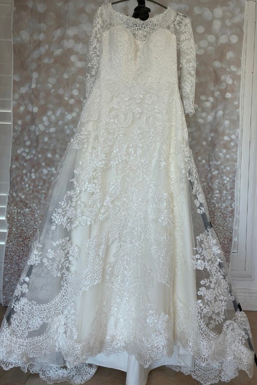 This stunning Oleg Cassini ivory A-line wedding dress is a romantic, timeless gown designed with exquisite lace detail and a beautifully flattering silhouette. Originally purchased for $3,500, it was worn once and professionally kept in excellent condition.