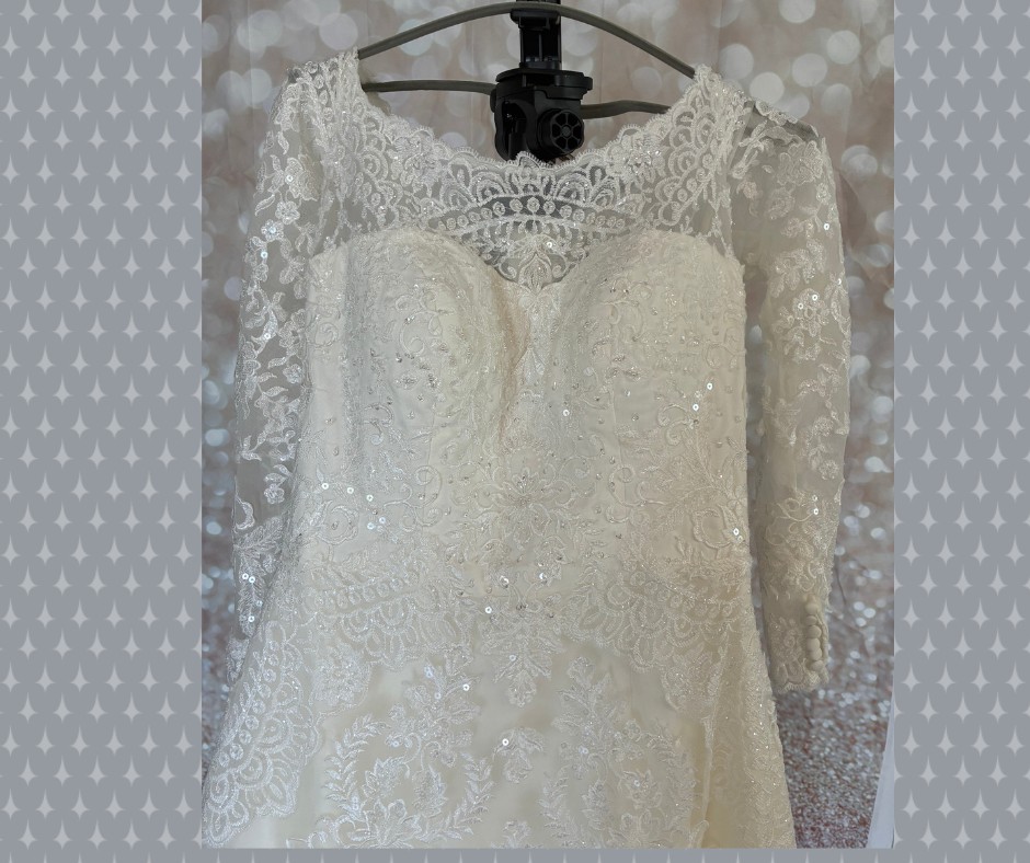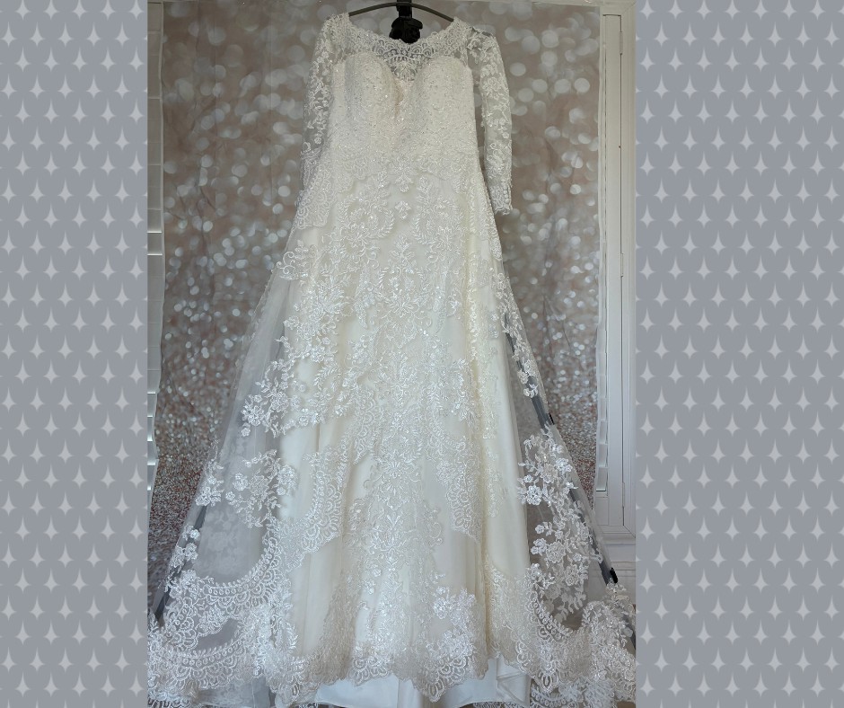 The gown features a soft sweetheart bodice layered under a delicate illusion lace neckline, creating a graceful, feminine look that photographs beautifully. The long sheer lace sleeves add elegance and coverage while still feeling light and comfortable. The entire dress is adorned with lace appliqué, subtle beading, and sequins that shimmer softly in the light.