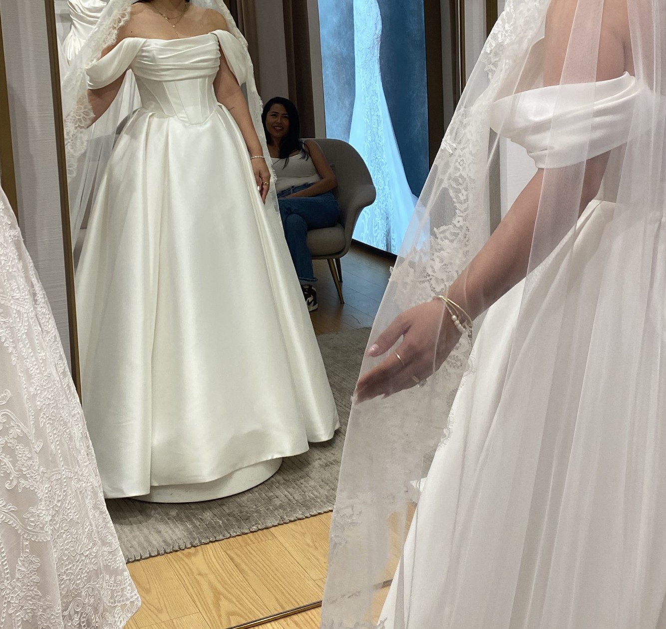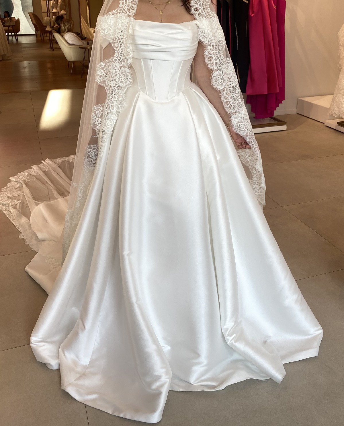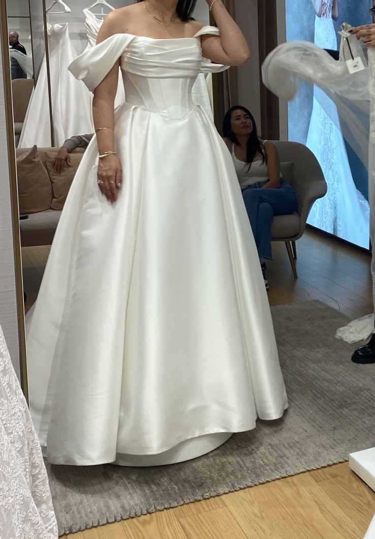 I bought this dress in February 2026 at Pronovias in Beverly Hills. I unfortunately have had to postpone my wedding until further notice and have decided to sell this gorgeous dress. It's so incredibly beautiful in person. The dress is a size 12, I ordered it larger to accommodate for the alterations I planned to make. This dress has not been altered in any way.