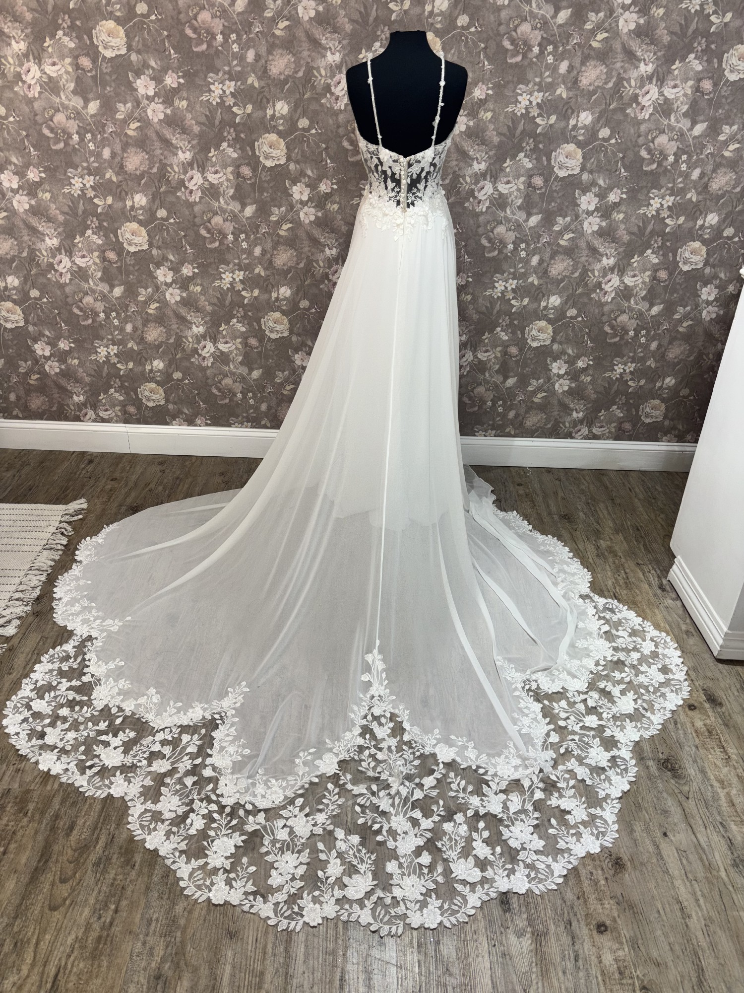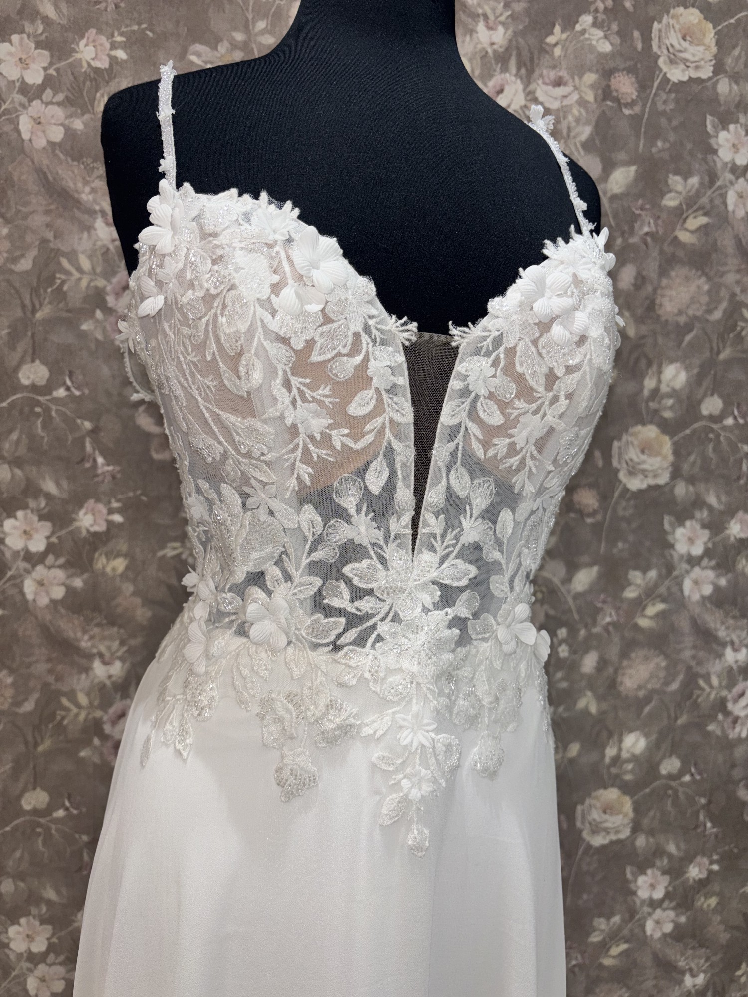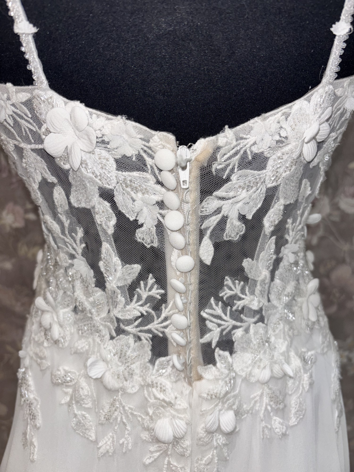 Our gowns have not been worn for a wedding, though they may have been tried on during appointments. While we maintain high standards for our samples, small imperfections—like loose buttons, missing beads, or zipper issues—can happen. These easy-to-fix details with the help of a seamstress mean amazing discounts! Interested in this gown? Chat or email us anytime for more info or extra photos.