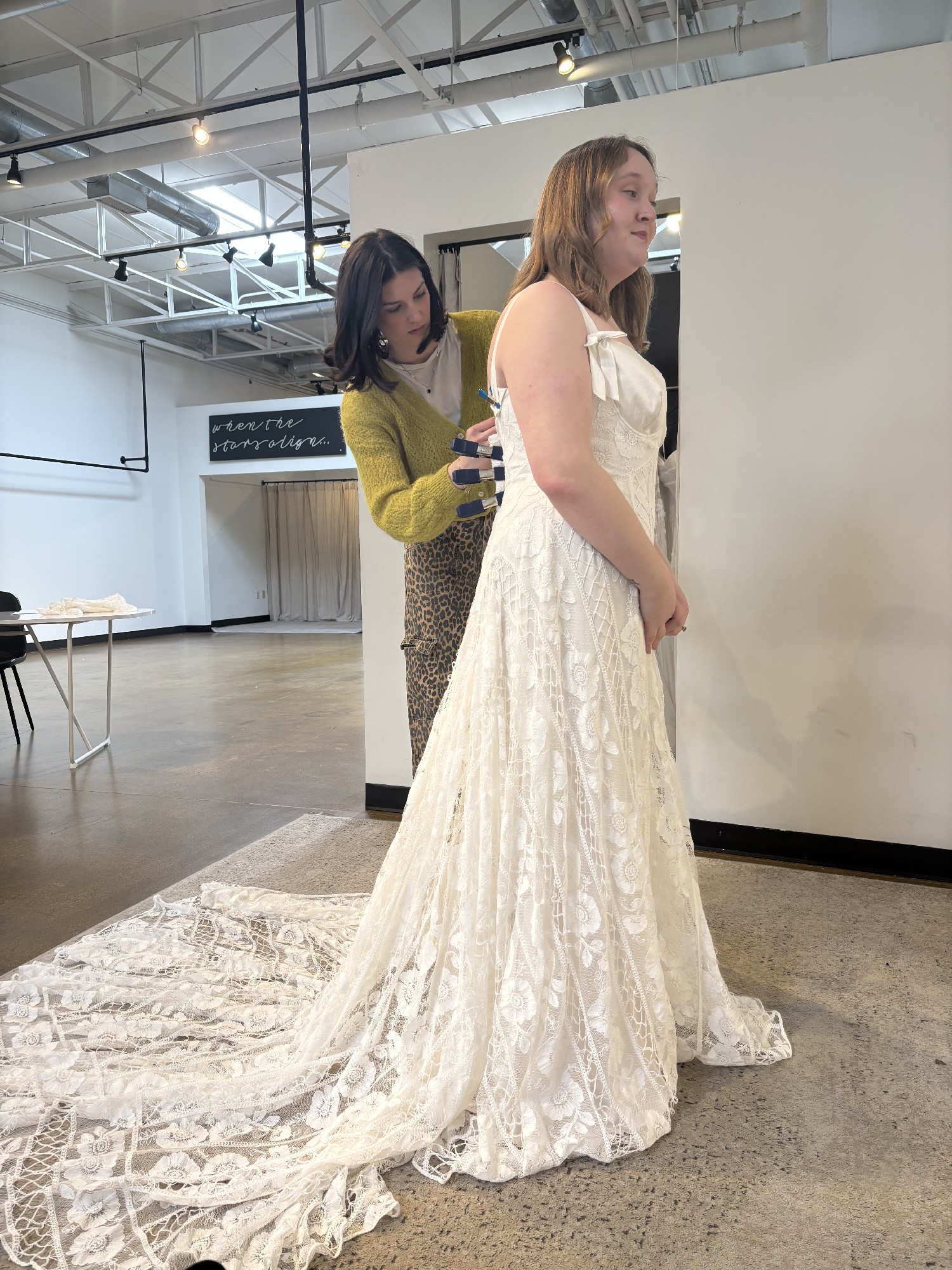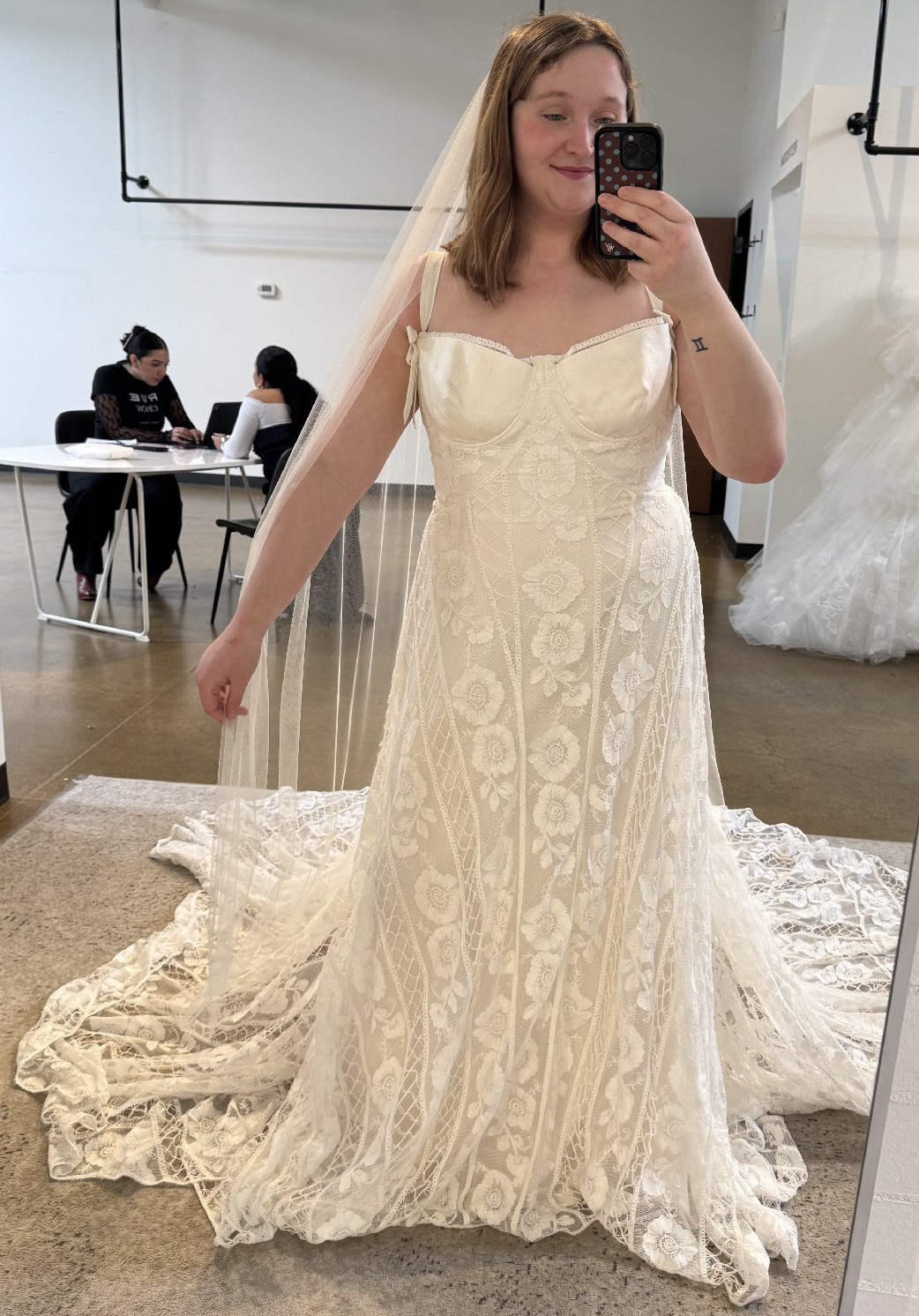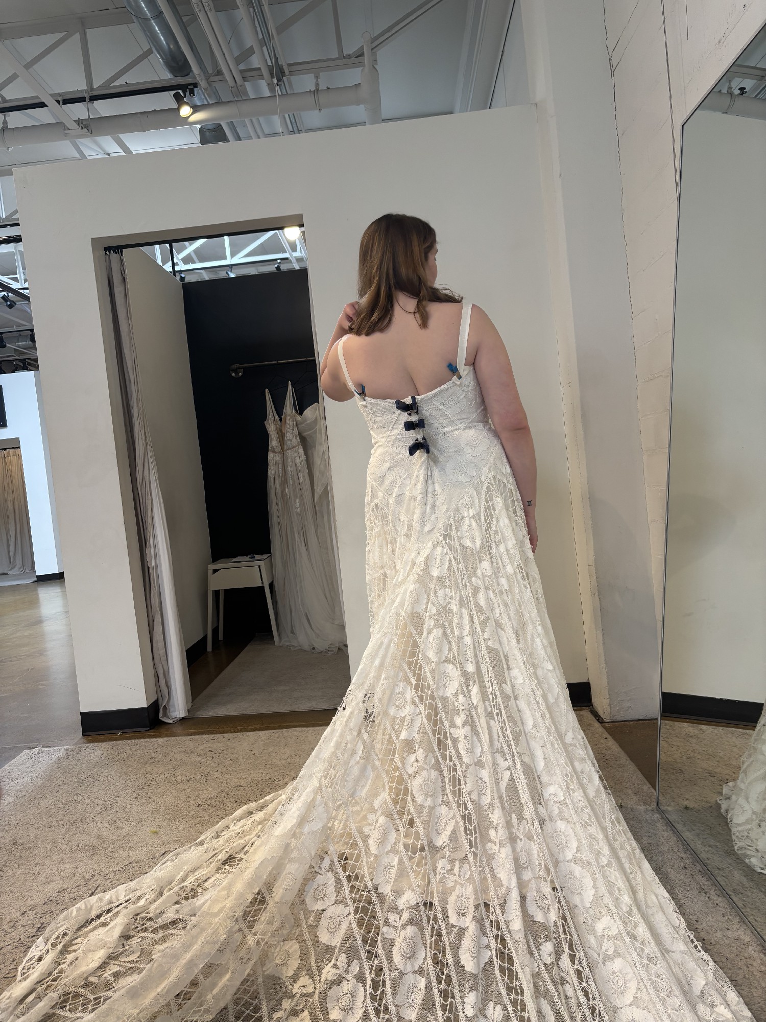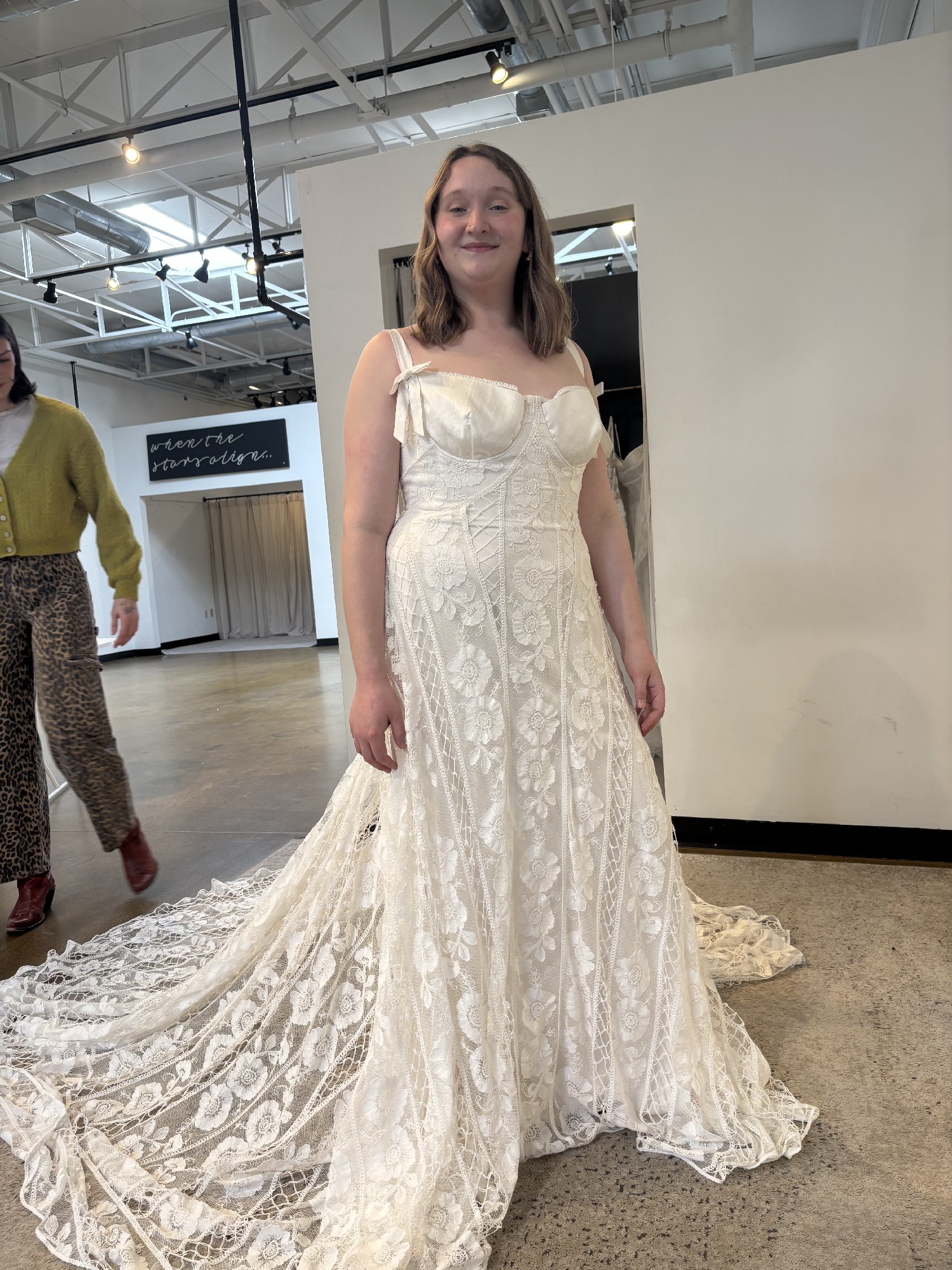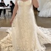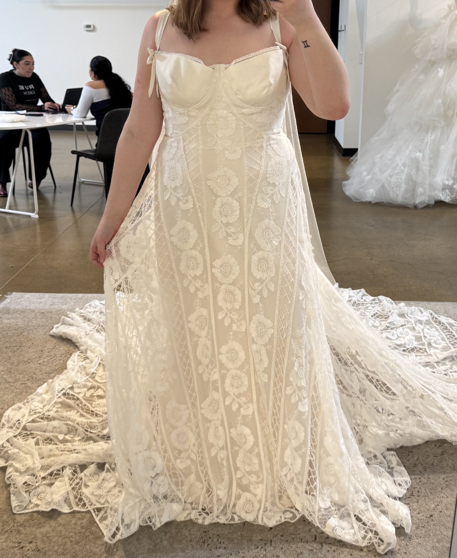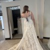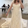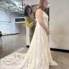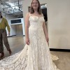 I purchased this gown at a sample sale in February 2026. The dress is in impressively good condition! We searched the gown numerous times prior to purchasing to find any damage to the lace and we could not find any damage. Absolutely NO alterations have made to the dress as I decided to purchase a new gown. The dress has remained in the garment bag in a home with no pets or smoking. I had a change in wedding plans and wanted something more flowy and moveable for a mountain elopement. This beautiful gown was on a great deal and I'd love to give a bride an opportunity to have a designer gown that is in excellent condition for a good price. The sleeves can be worn on or off the shoulders. It comes with detachable long sleeves (not pictured) that will be included. The gown is still being produced and a matching veil can be purchased through Rue de Seine.