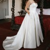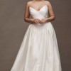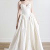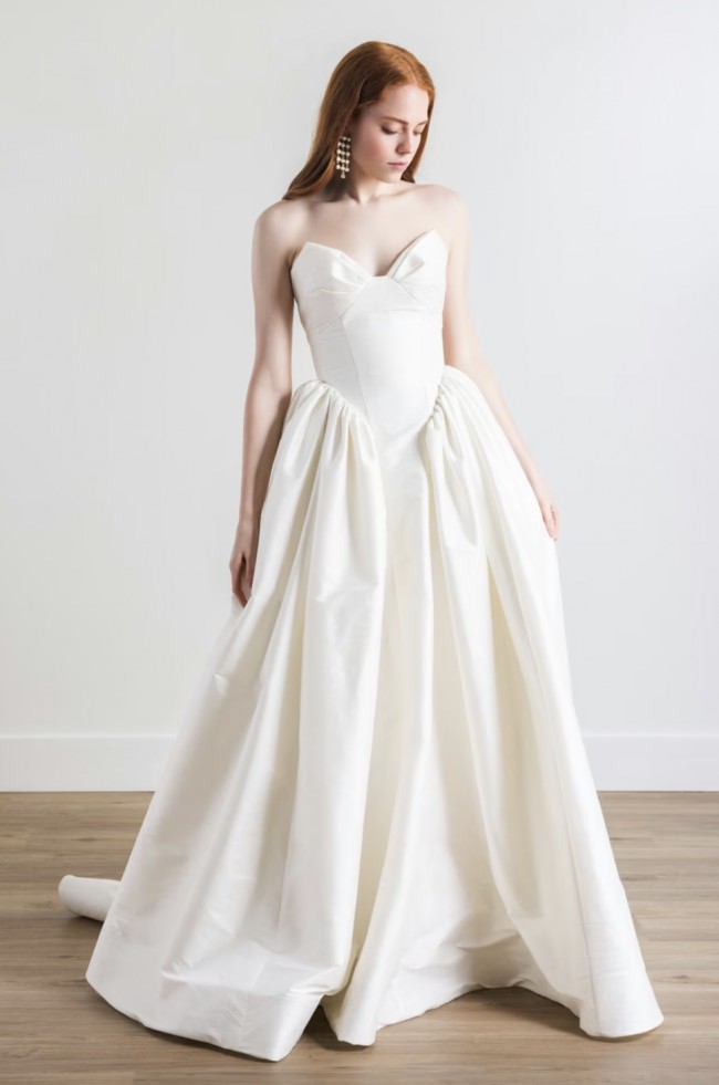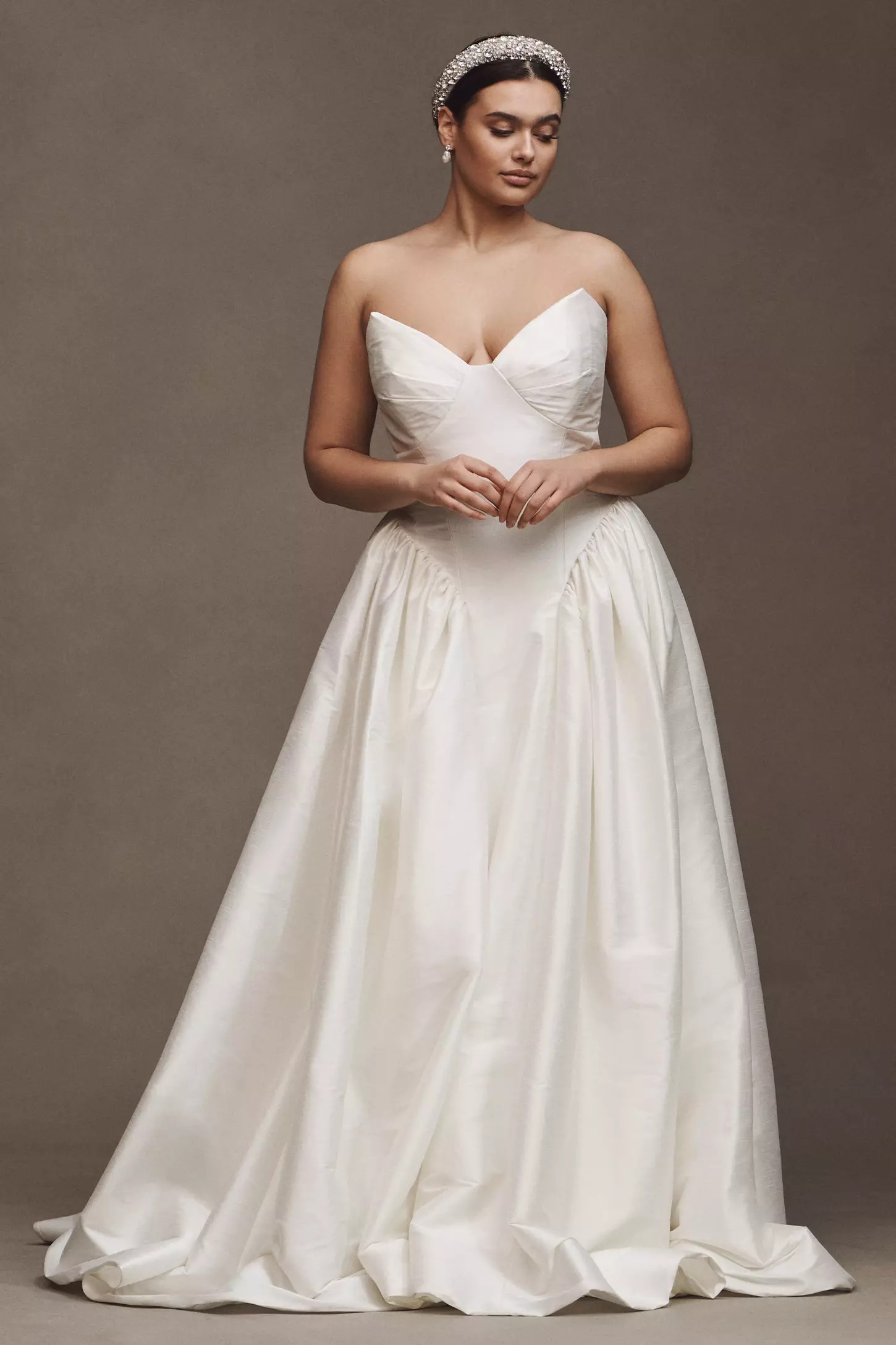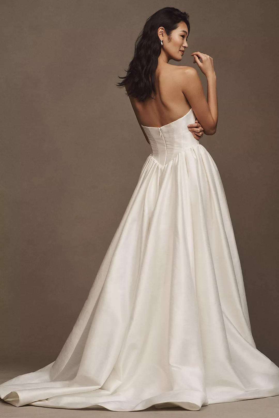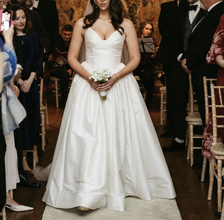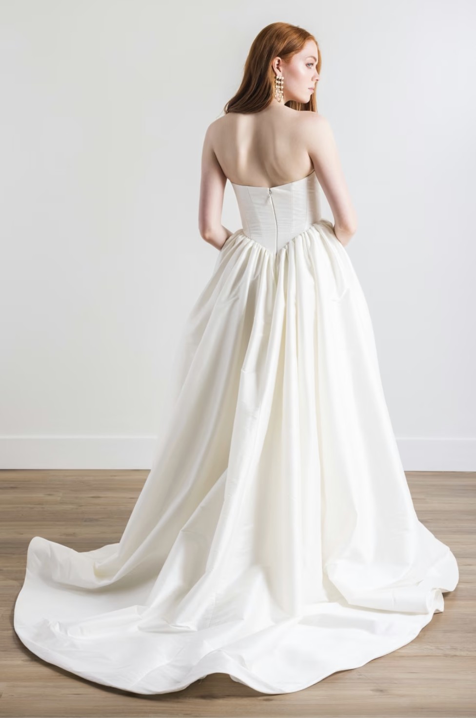 Gorgeous drop waist / basque waist ball gown. Incredibly flattering, looks more expensive than it is. Well-weighted fabric than hangs beautifully and creates an elegant silhouette. Had a french bustle put in (with buttons) to pick up the train for the reception. Would fit a street size 6/8 (or smaller, with alterations). It was hemmed to fit a 5'7" bride wearing kitten heels.
