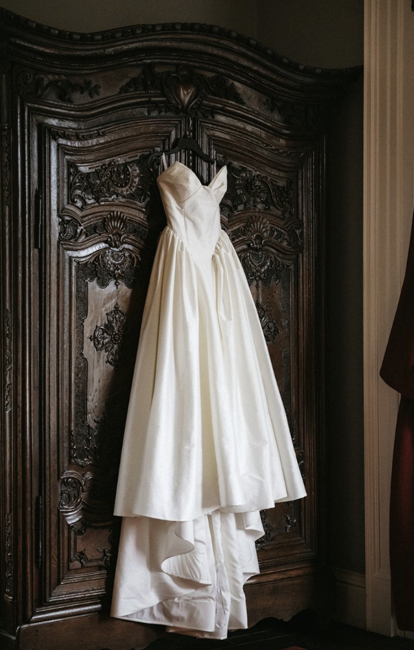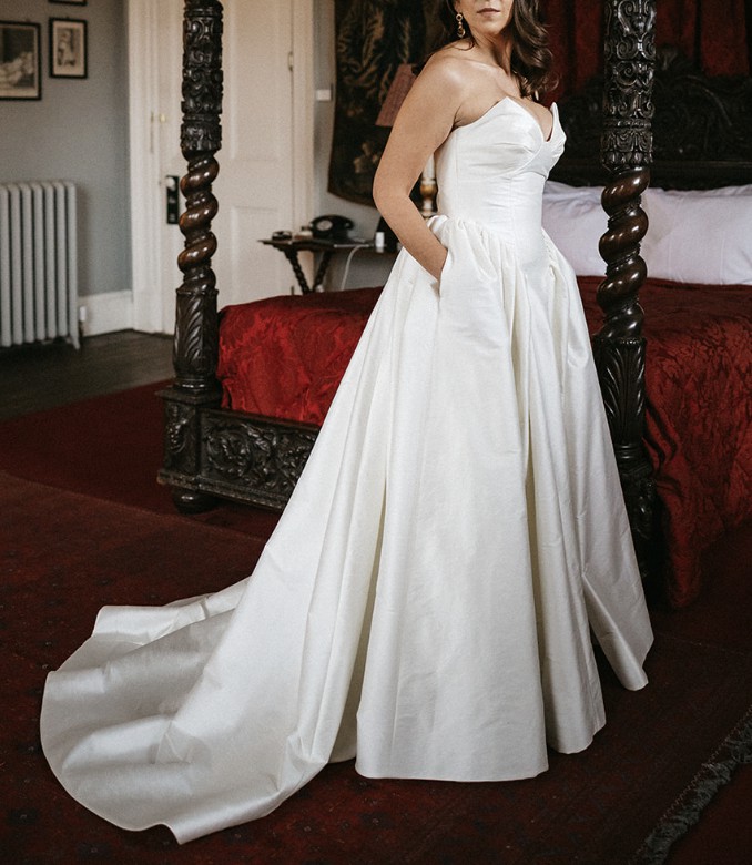 - waist taken in from size 8 to a 6 (leaving the cups a size 8); hemmed; convertible french bustle (can be fastened up in various ways)