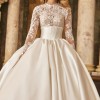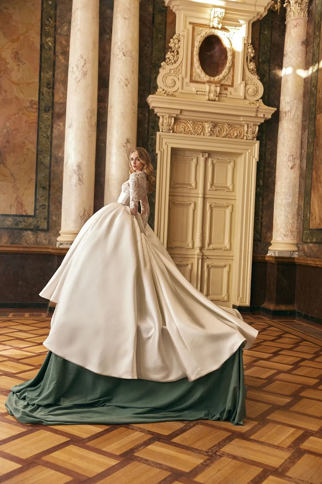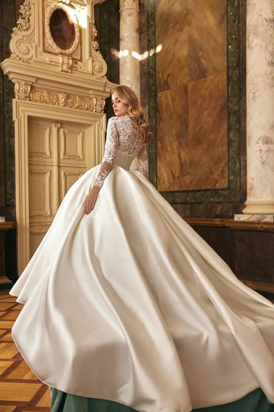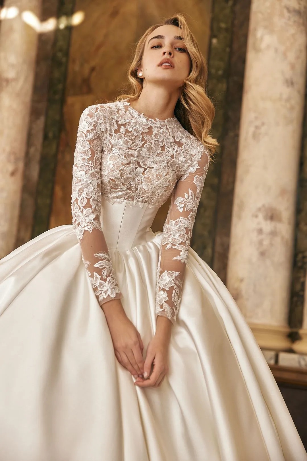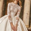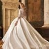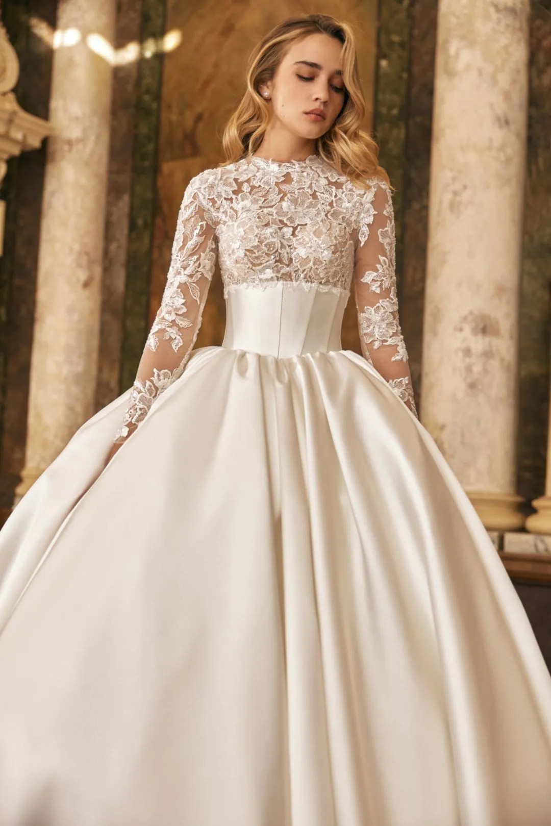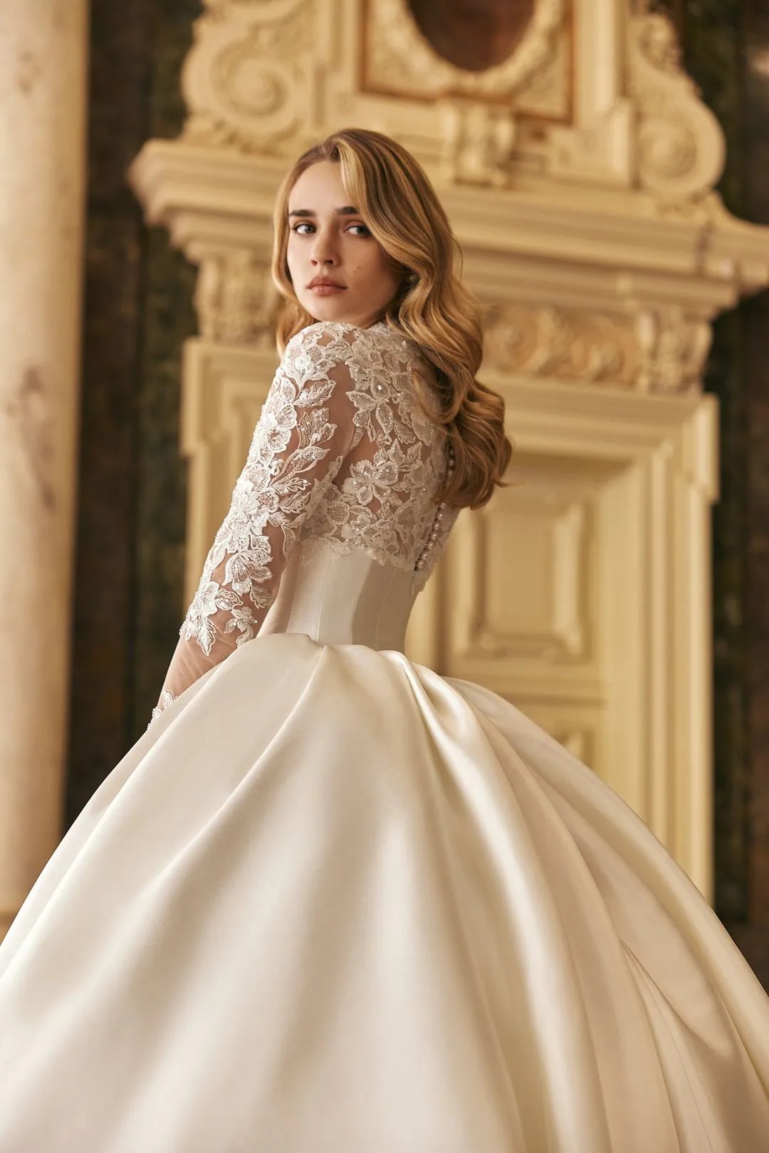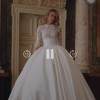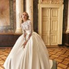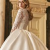 The dress comes with a veil fit for a queen. This ball gown features a luxurious Mikado corset that perfectly shapes the figure, while delicate lace adorns the bust and sleeves, adding a touch of romance and sophistication. The voluminous skirt creates a regal silhouette, making this gown ideal for a bride who desires to make a grand statement on her special day. A timeless piece, designed to blend modern elegance with classic beauty.