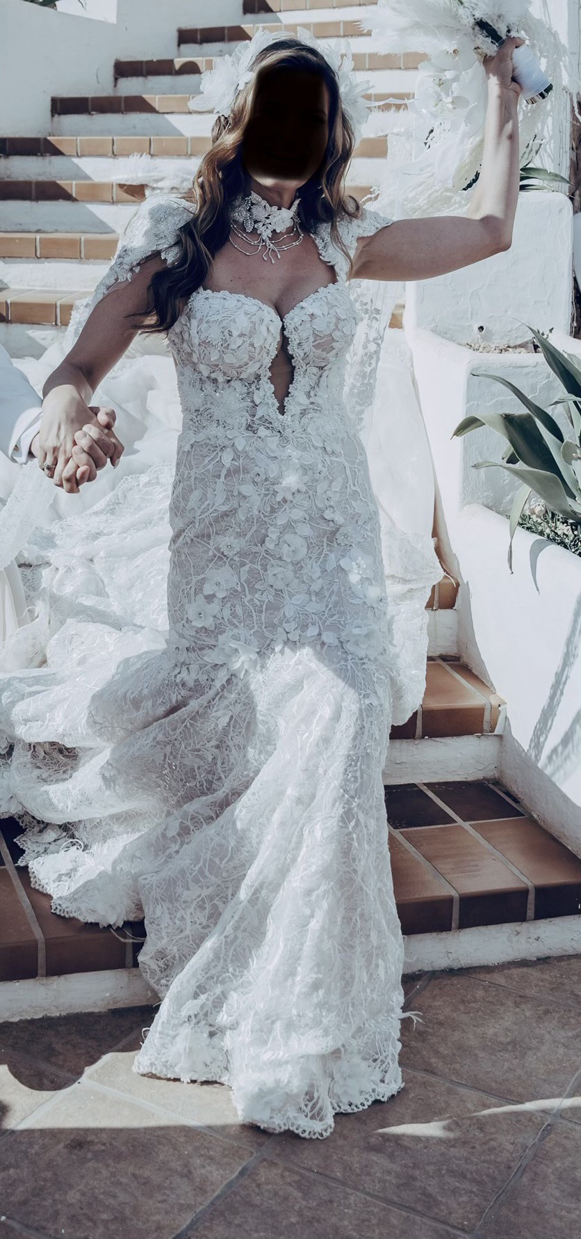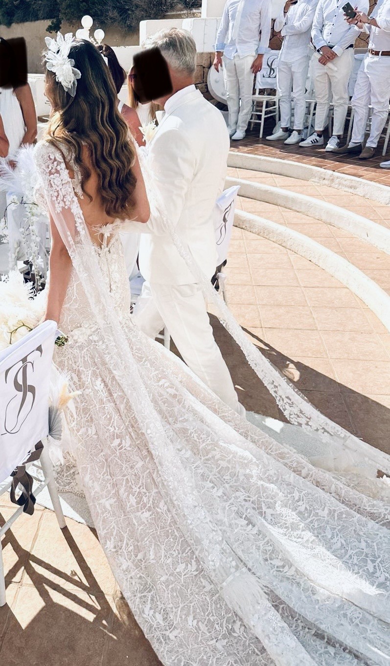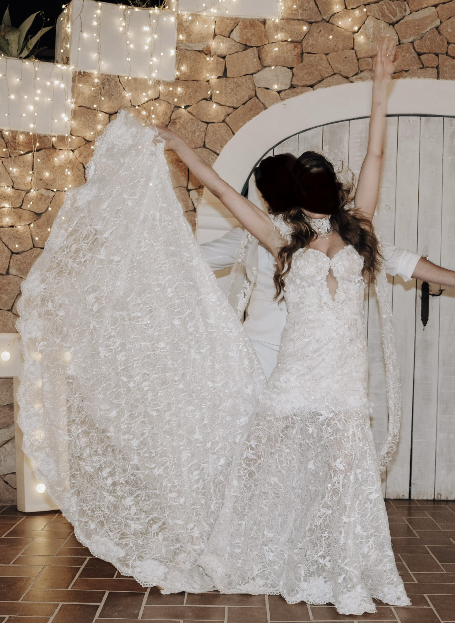 The absolute highlight is the spectacular 3-meter detachable shoulder/arm train adorned with real feathers. It can be shortened to floor length during the evening for comfortable dancing. The underskirt can also be easily removed at the designated seam — transforming the gown into a second look. Without the voluminous ruffled underskirt, the dress becomes a stunning lace design with subtle transparency from mid-thigh down.
