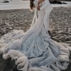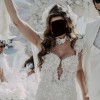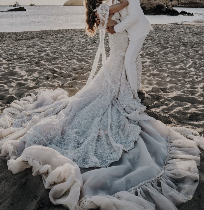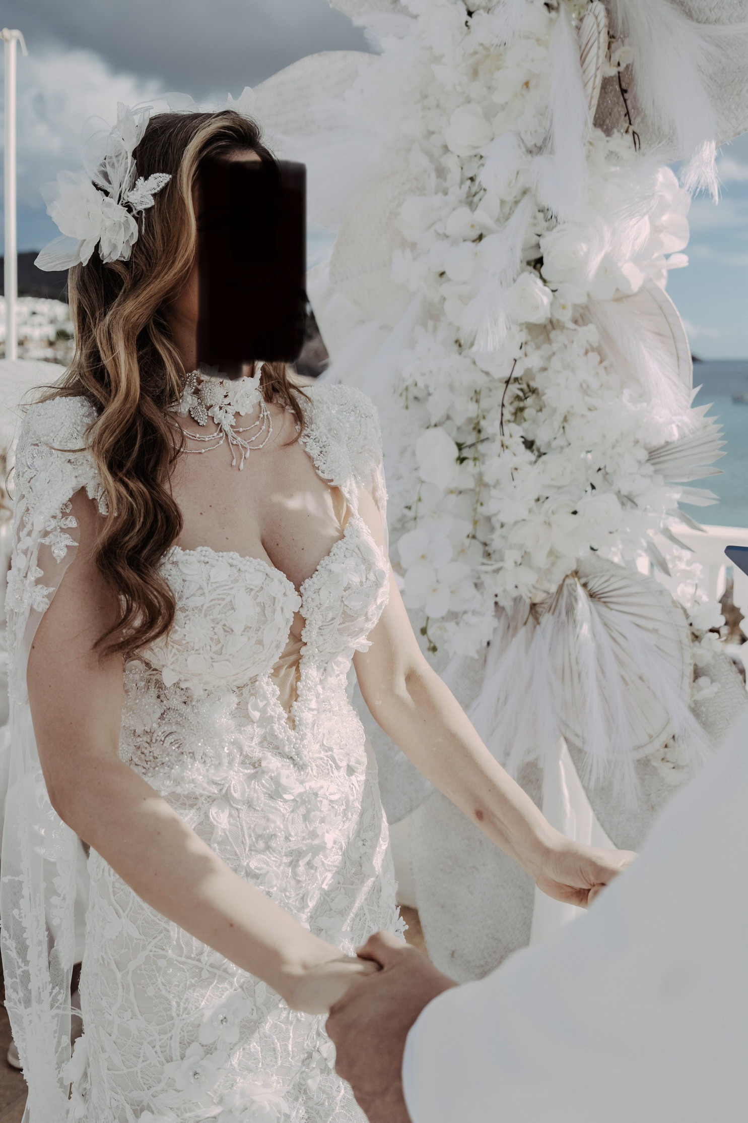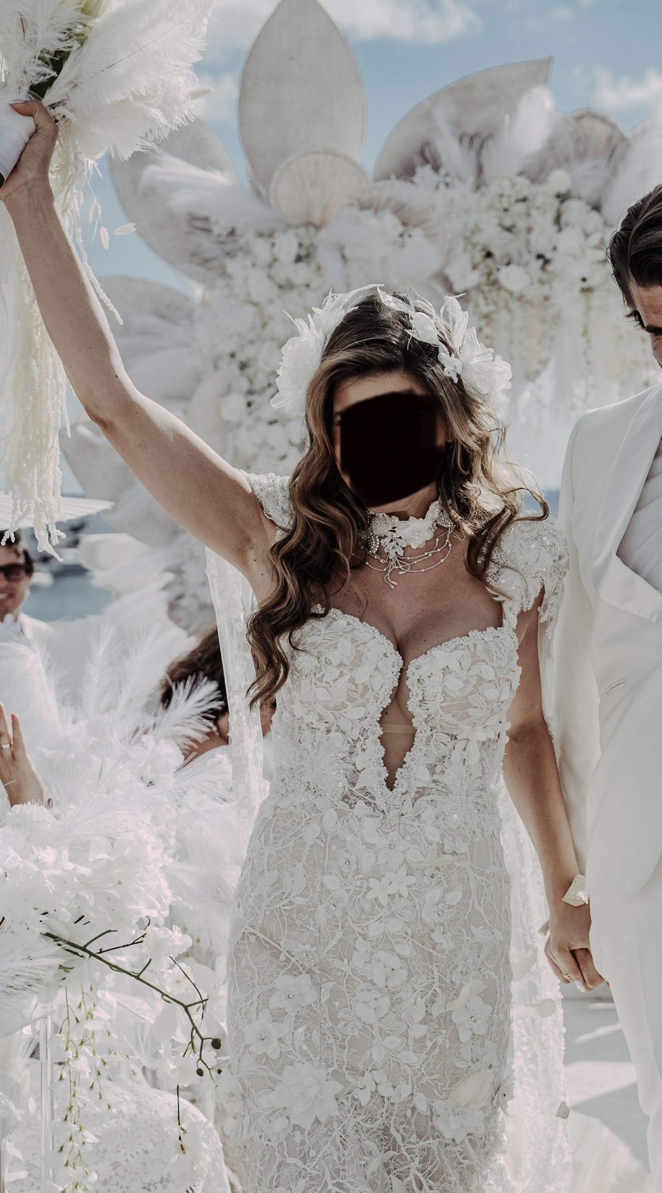The absolute highlight is the spectacular 3-meter detachable shoulder/arm train adorned with real feathers. It can be shortened to floor length during the evening for comfortable dancing. The underskirt can also be easily removed at the designated seam — transforming the gown into a second look. Without the voluminous ruffled underskirt, the dress becomes a stunning lace design with subtle transparency from mid-thigh down.
