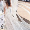 The gown was elevated using luxurious materials such as intricate glass bead patches, genuine ostrich feather appliqués, and refined transparent details. The shoulder pads are embellished with elaborate glass bead patches, the neckline is finished with a glass bead band and sheer elements, and the back features detailed glass bead applications and ornate embellishments. Additional beaded appliqués accentuate the waist and back.