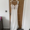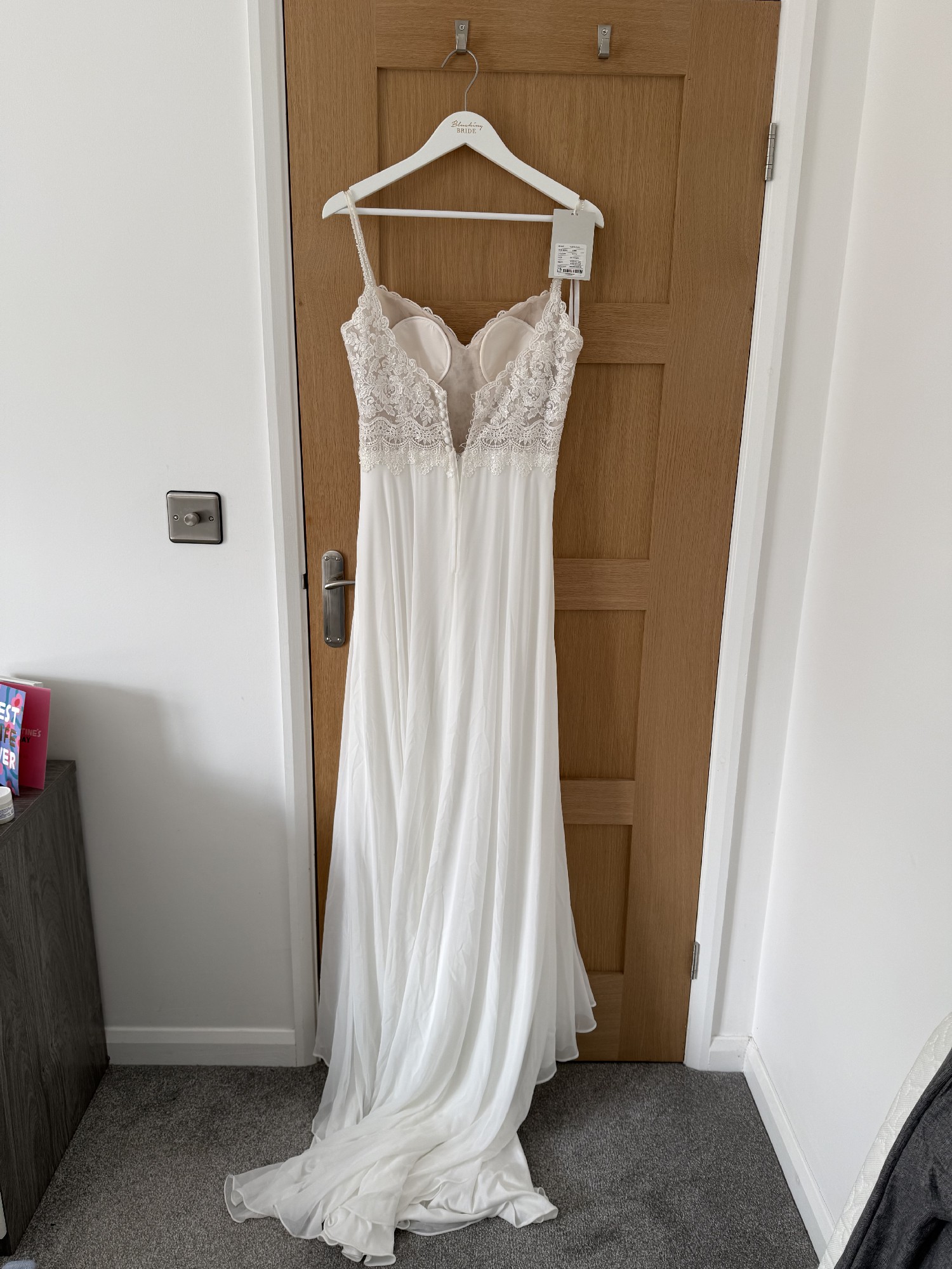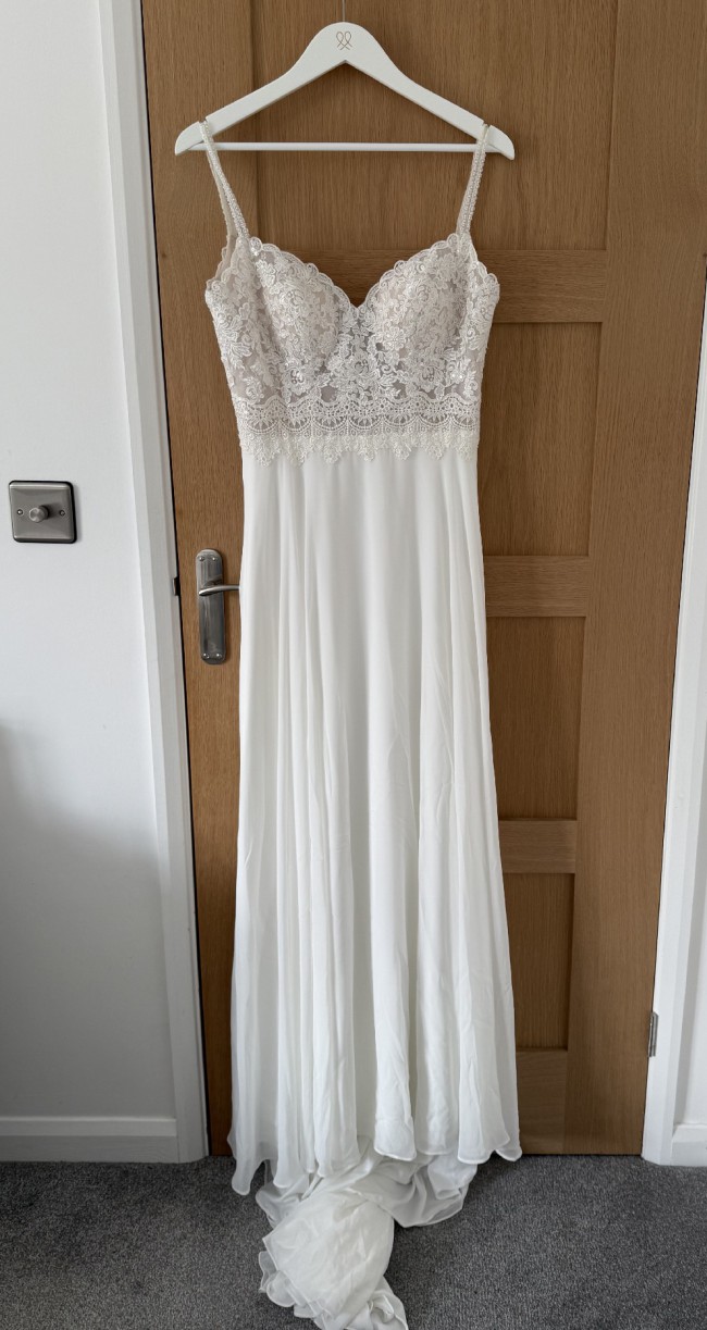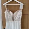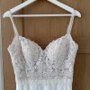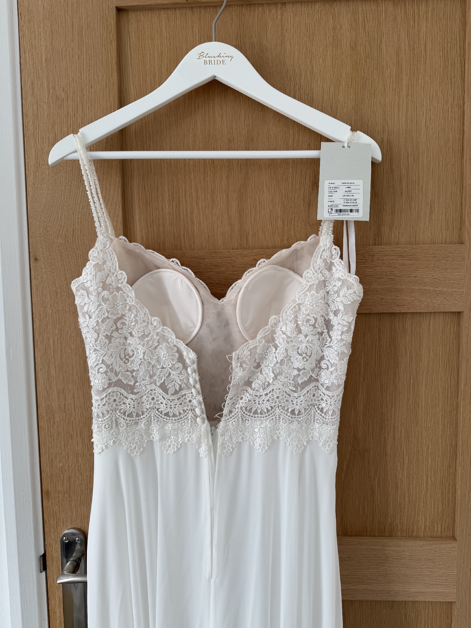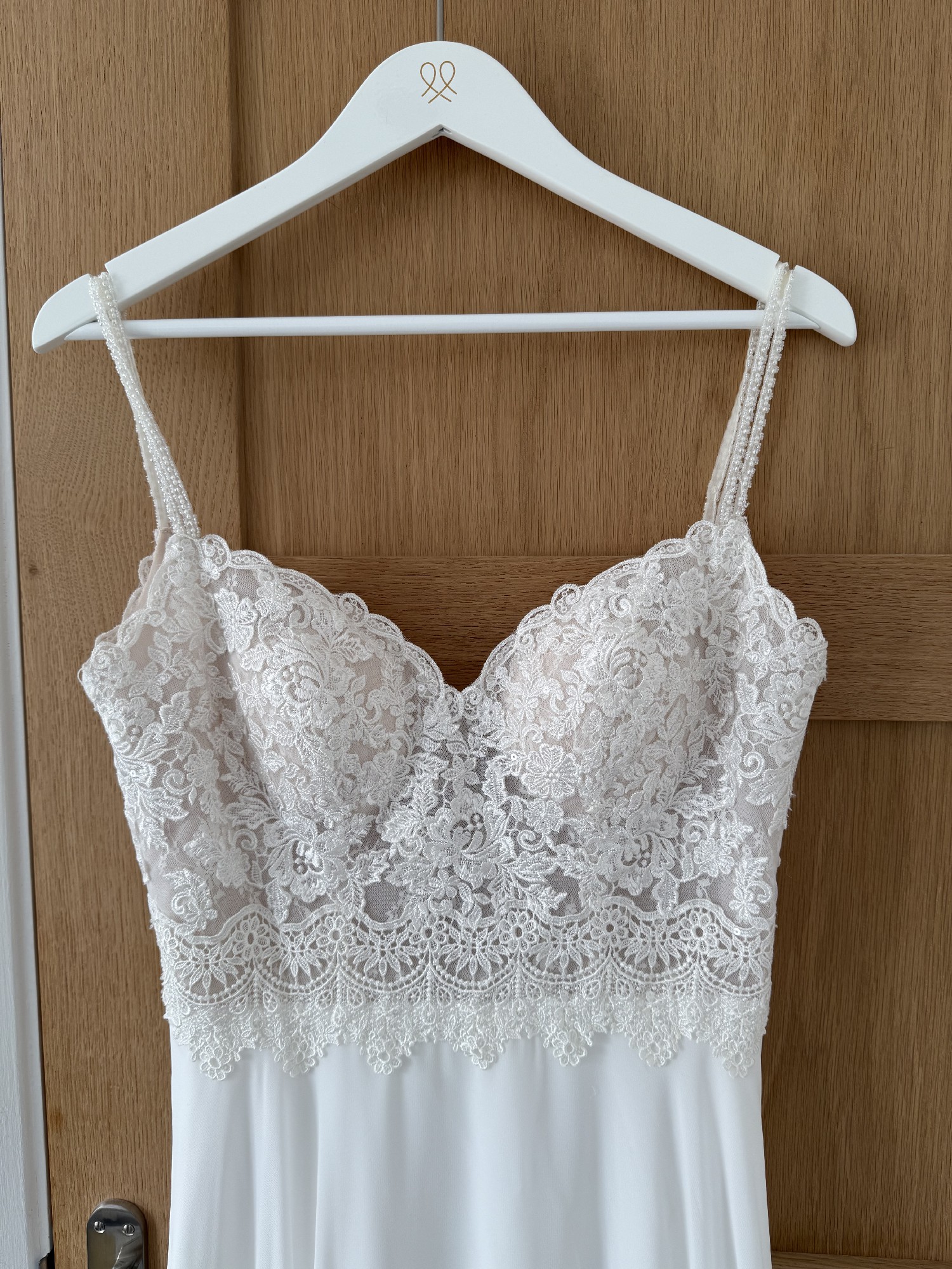 The floral embroidered lace bodice is lined with champagne organza for a translucent yet modest finish.