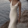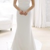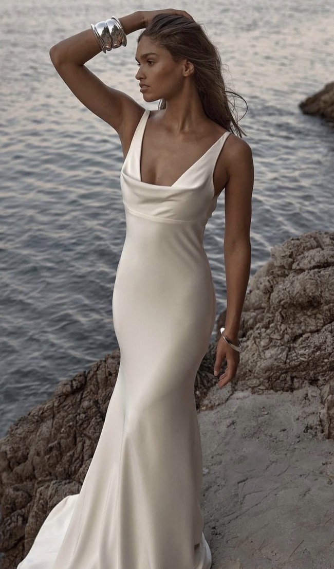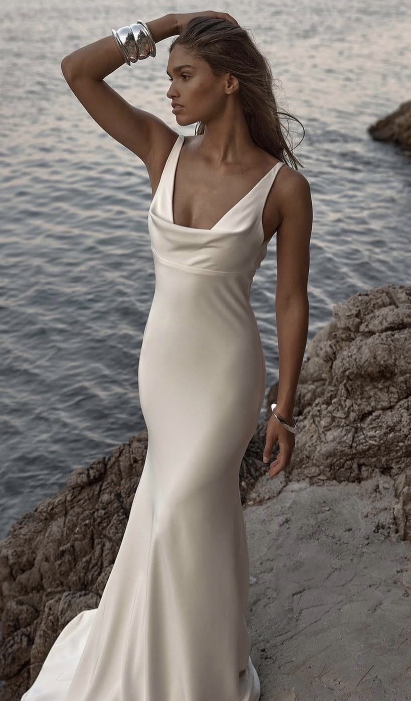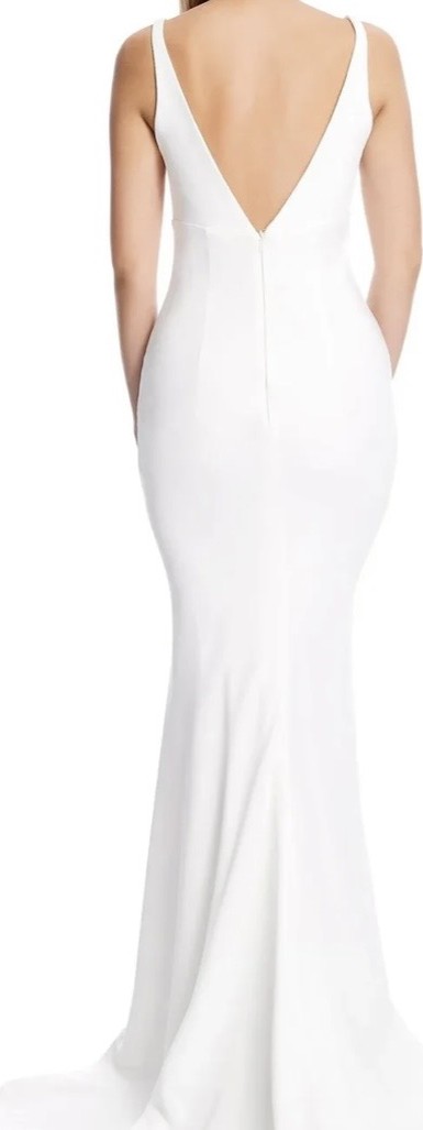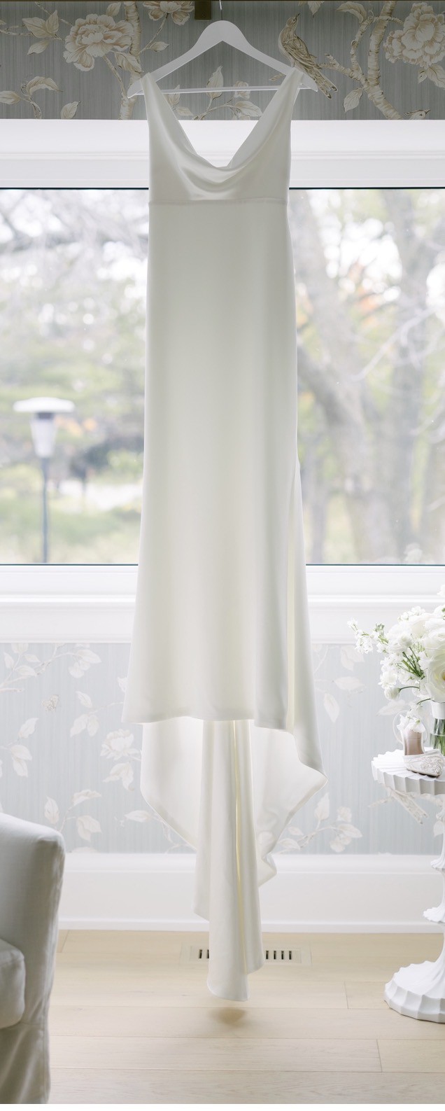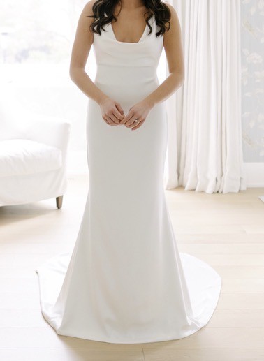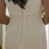 Chosen by KHYA Bacall dress in Satin Bright Ivory. KYHA covered buttons were added to the back of the dress along the zipper. French bustle was added for clean and elegant look after the ceremony.