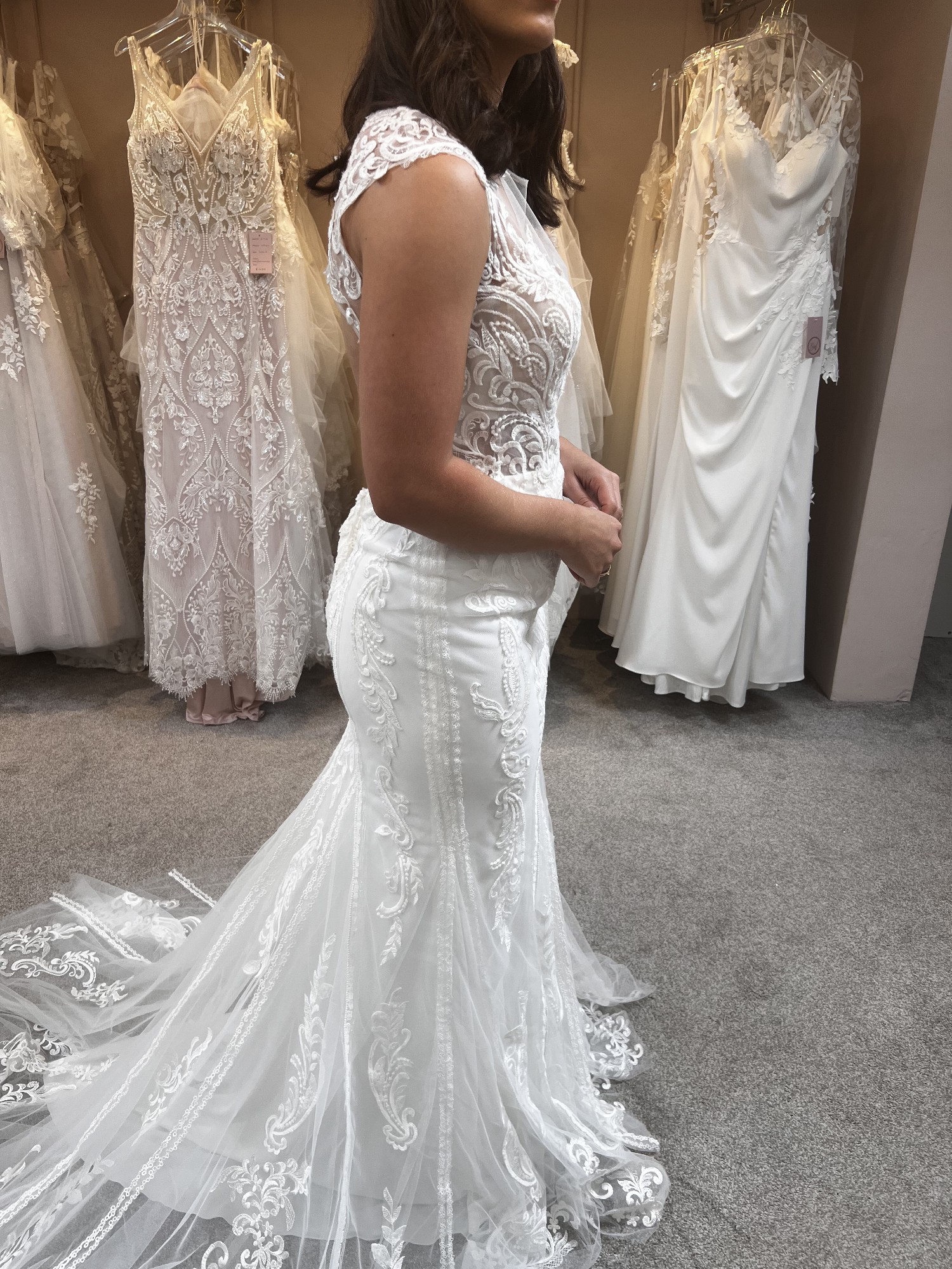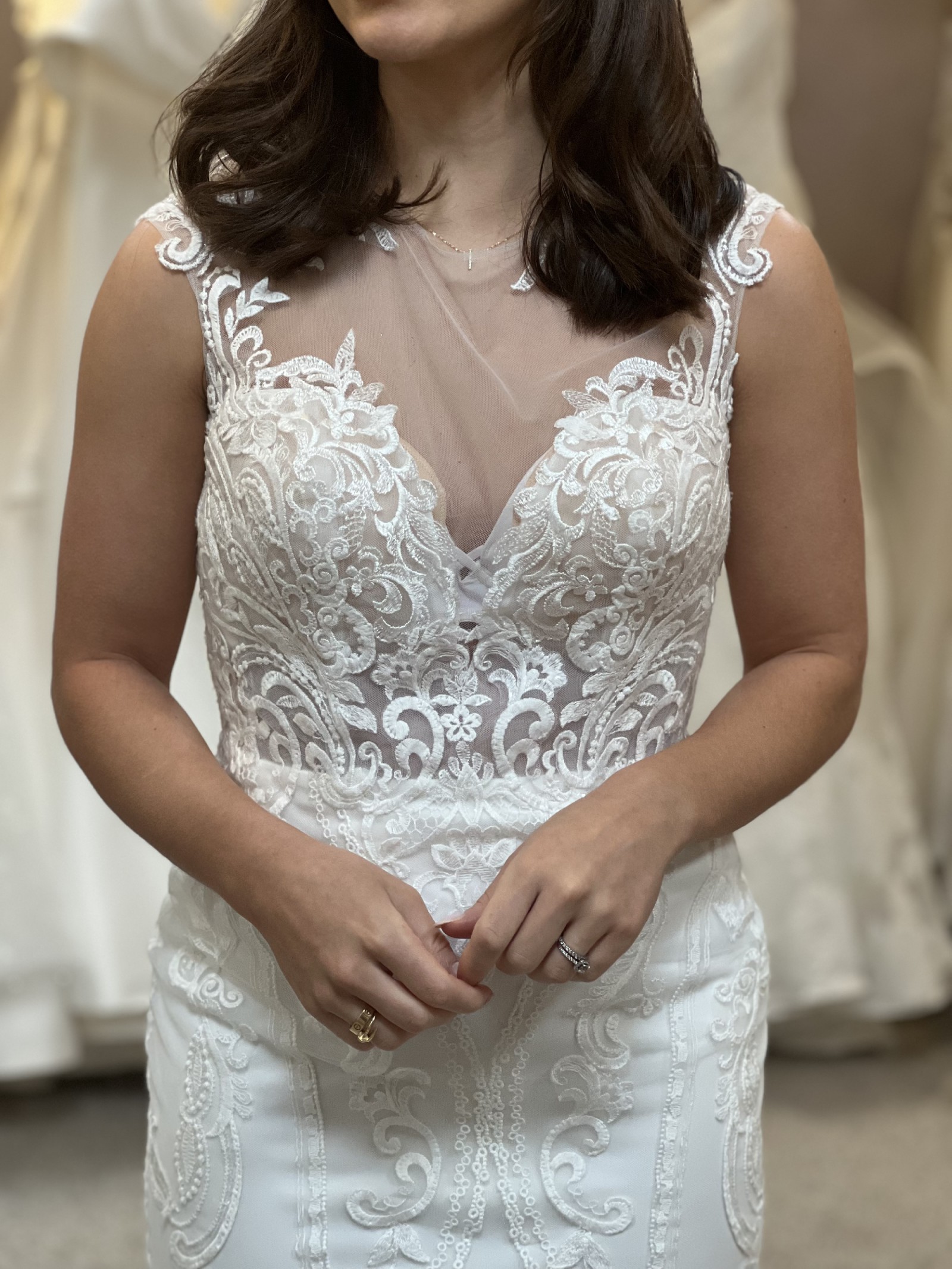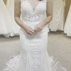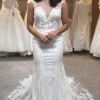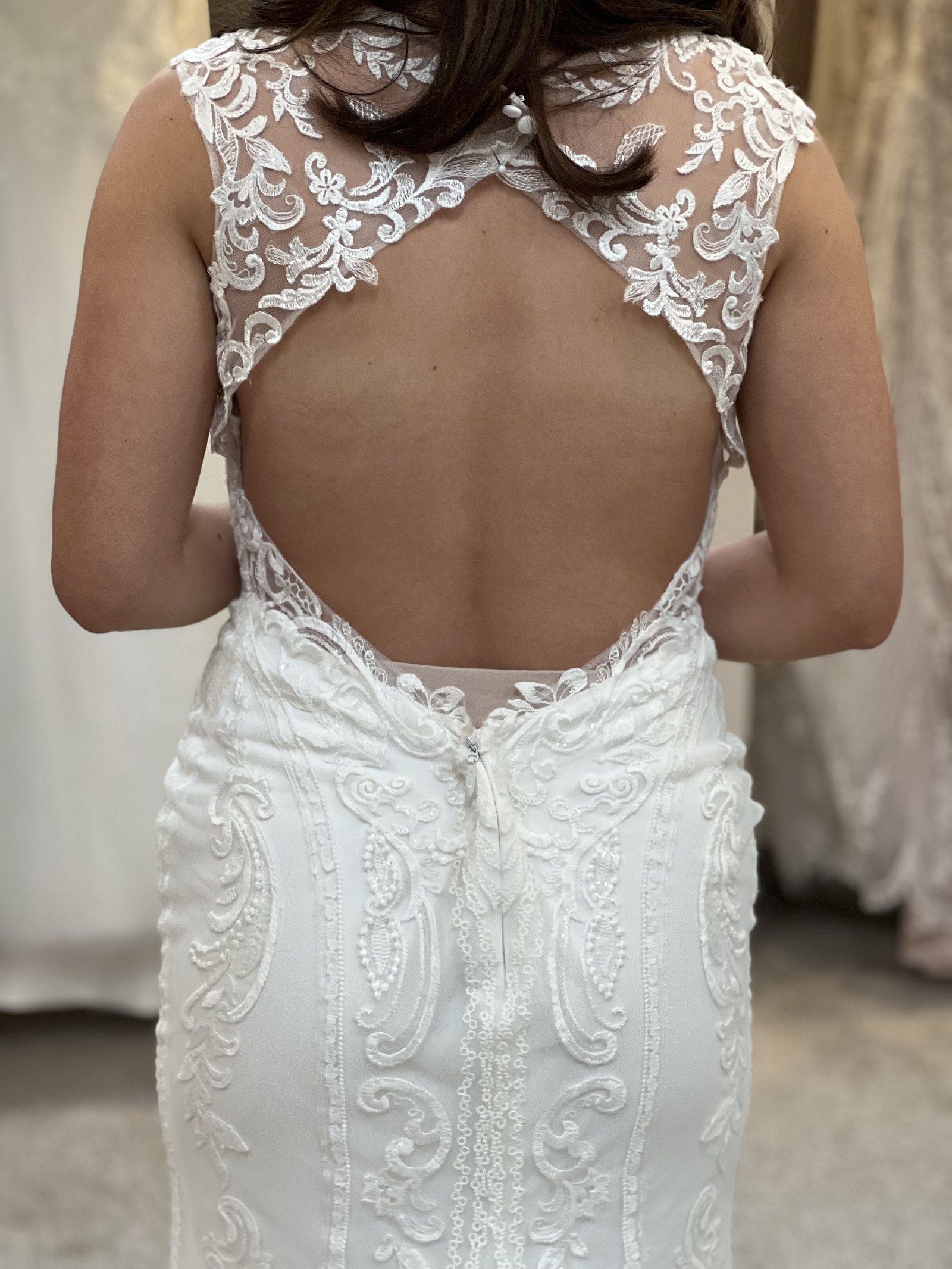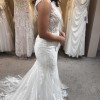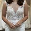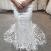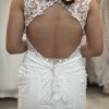 Our stunning Pronovias Retba dress has an incredible silhouette to emphasis your feminine curves. Deep keyhole back is a beautiful sexy feature of this dress. Combination of soft delicate laces creates a dreamy style, perfect for a rustic boho venue. With its sheer neckline and capped sleeves, this dress captures a delicate balance between allure and grace, while the keyhole back adds a tantalizing touch of intrigue. It's also lovely and light with unlined bodice making it just right for that beach destination wedding.