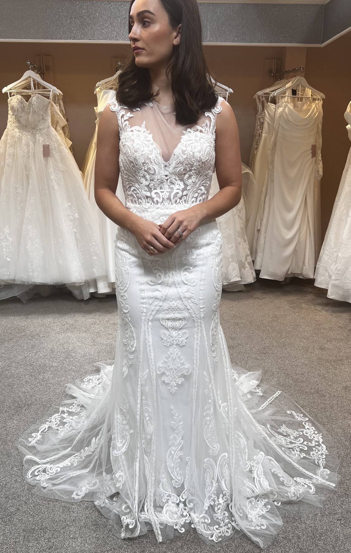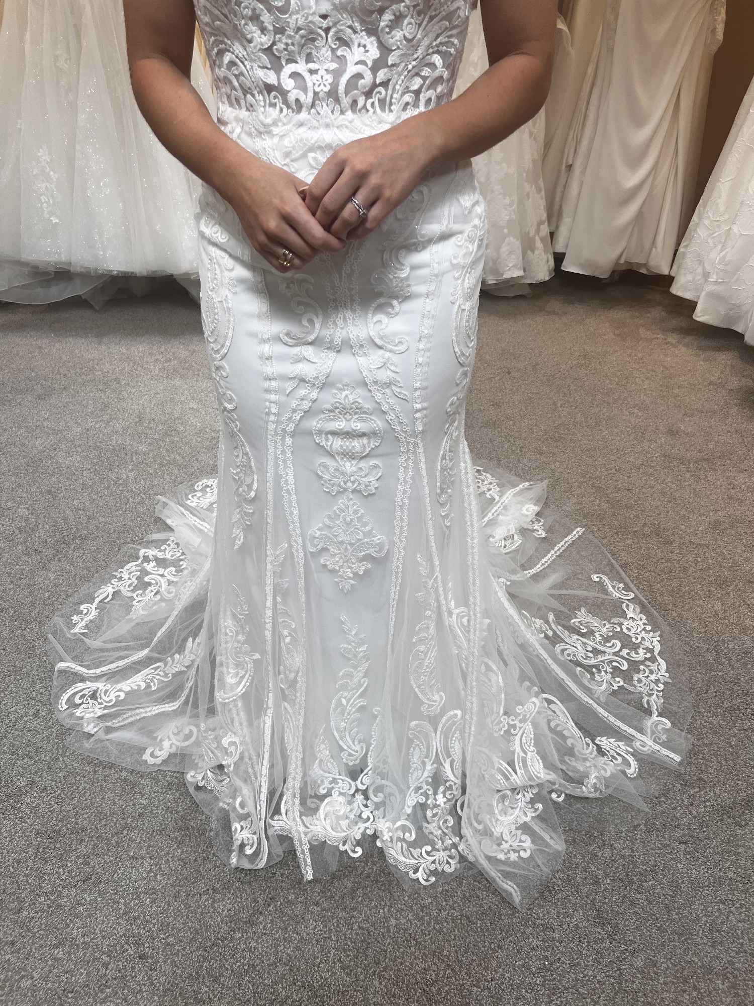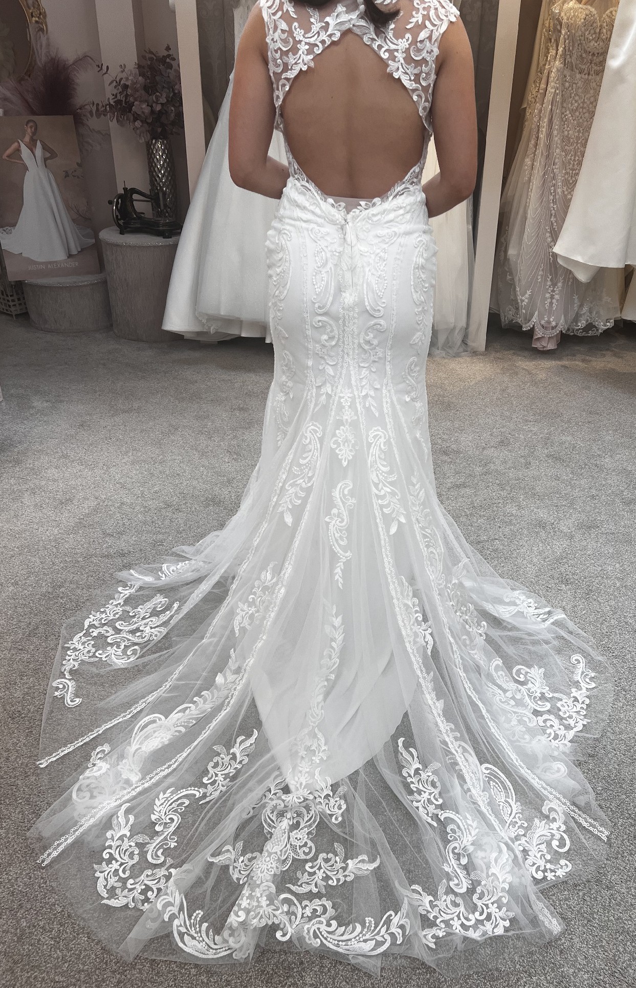 Our stunning Pronovias Retba dress has an incredible silhouette to emphasis your feminine curves. Deep keyhole back is a beautiful sexy feature of this dress. Combination of soft delicate laces creates a dreamy style, perfect for a rustic boho venue. With its sheer neckline and capped sleeves, this dress captures a delicate balance between allure and grace, while the keyhole back adds a tantalizing touch of intrigue. It's also lovely and light with unlined bodice making it just right for that beach destination wedding.