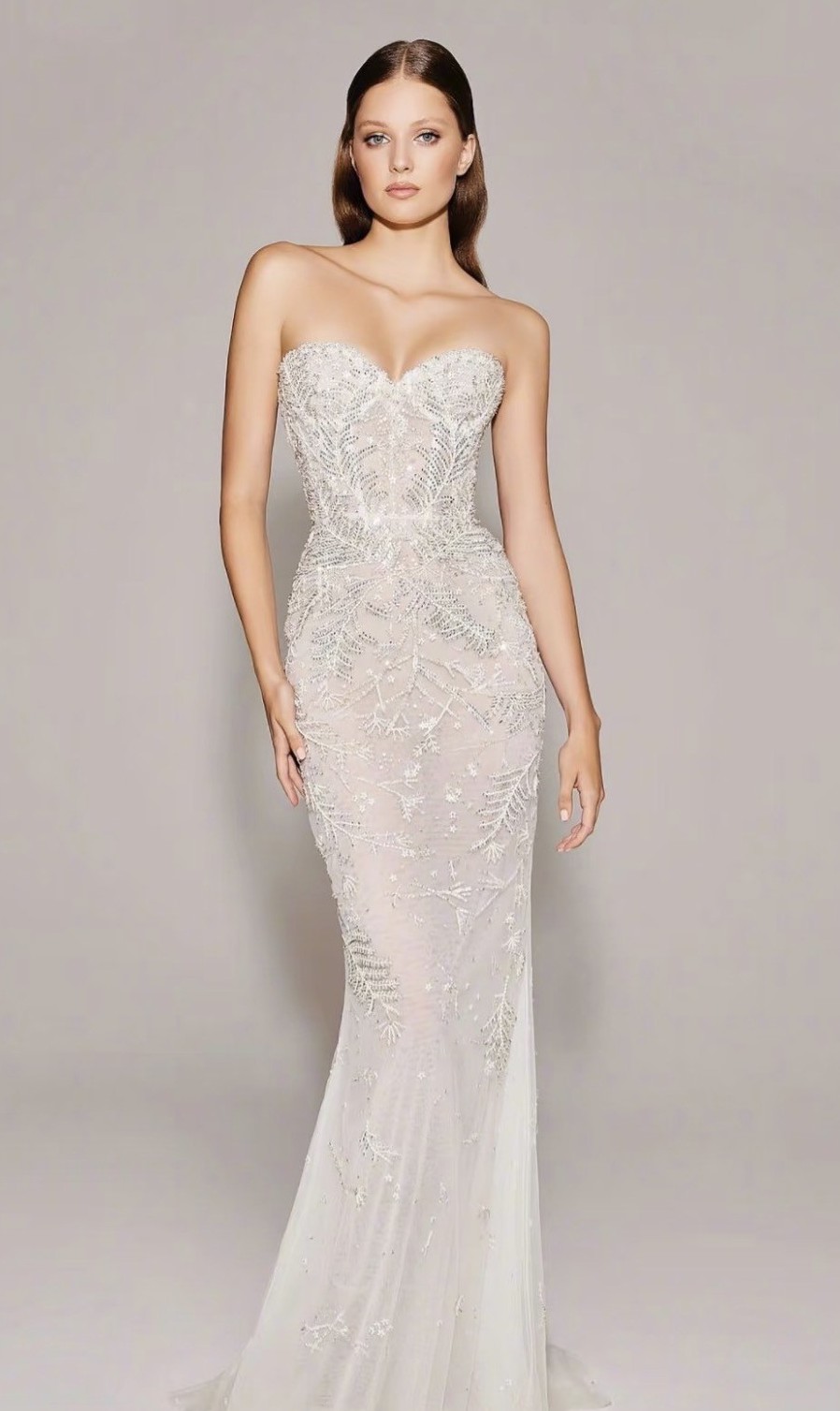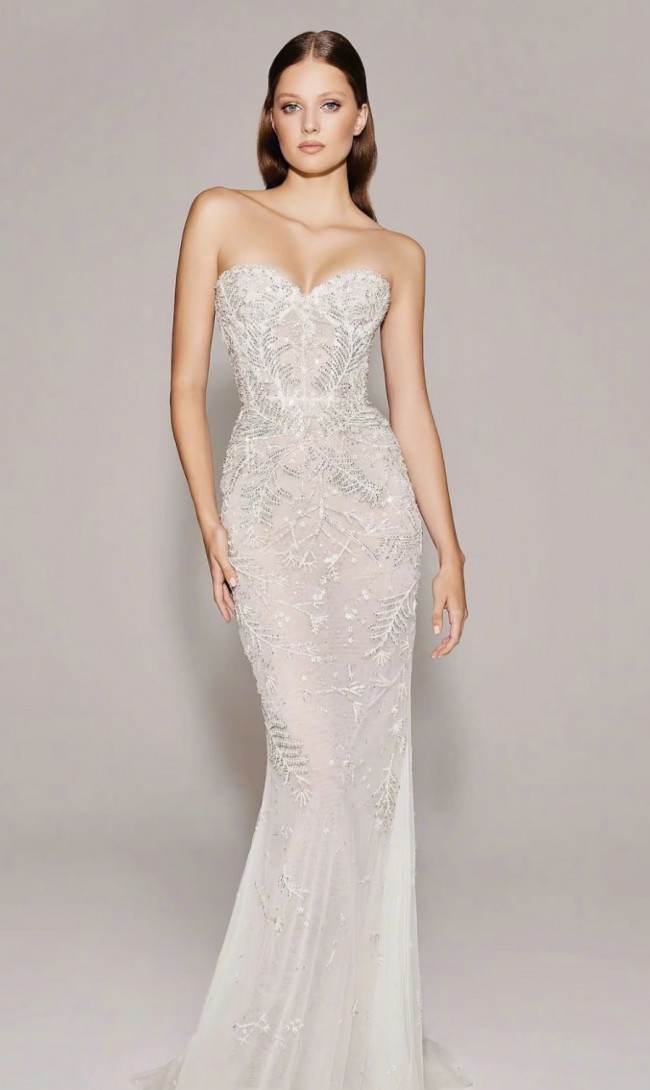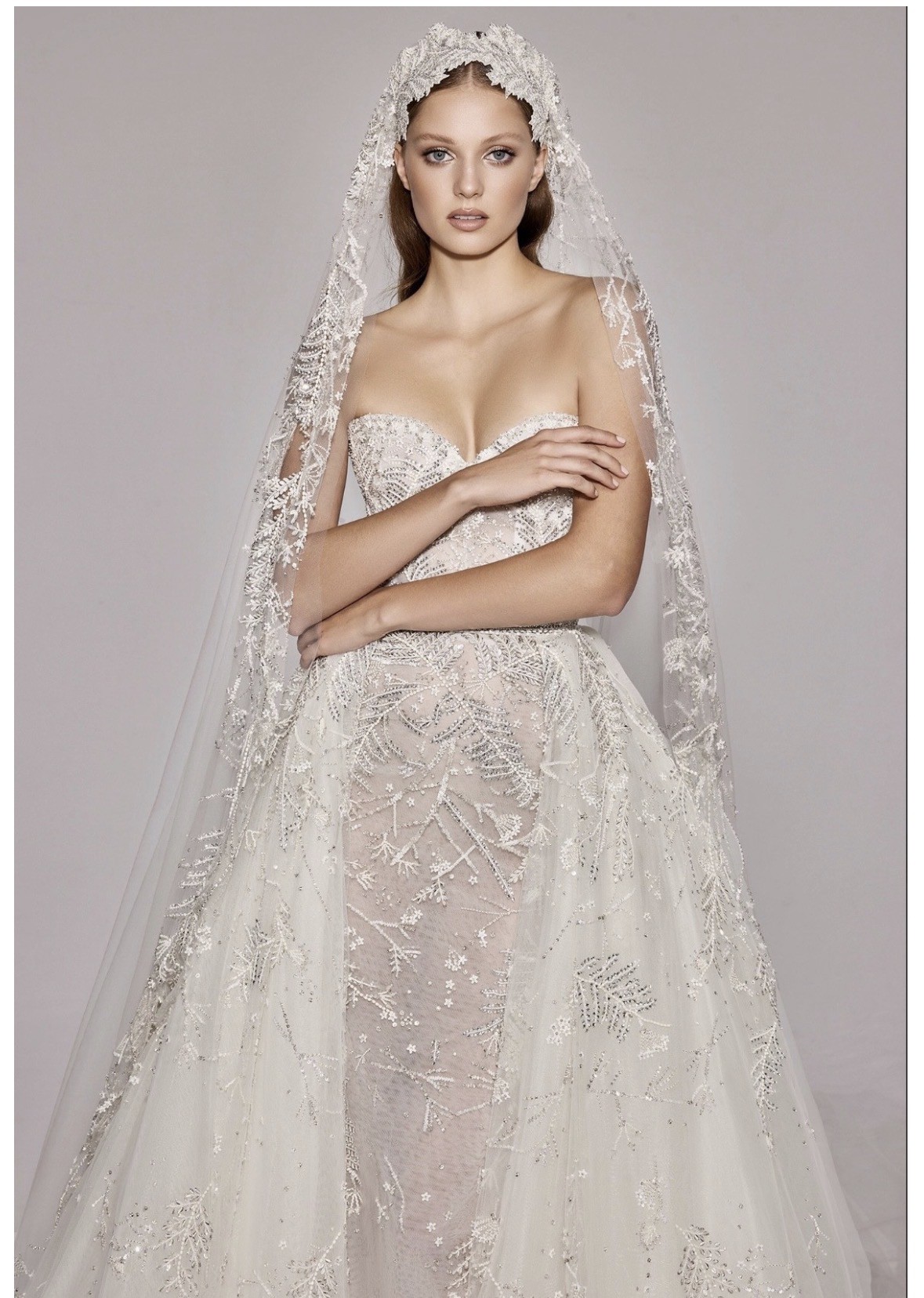 Zuhair Murad Bridal Fall 2023 couture modular set, featuring a strapless sweetheart-neckline fitted gown crafted in illusion tulle with intricate hand-embroidered beadwork throughout. The set includes a detachable embroidered overskirt with a soft train and veil. Dress is fully lined. Cups were added.
