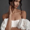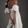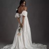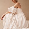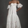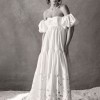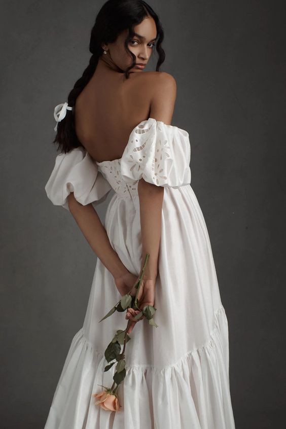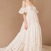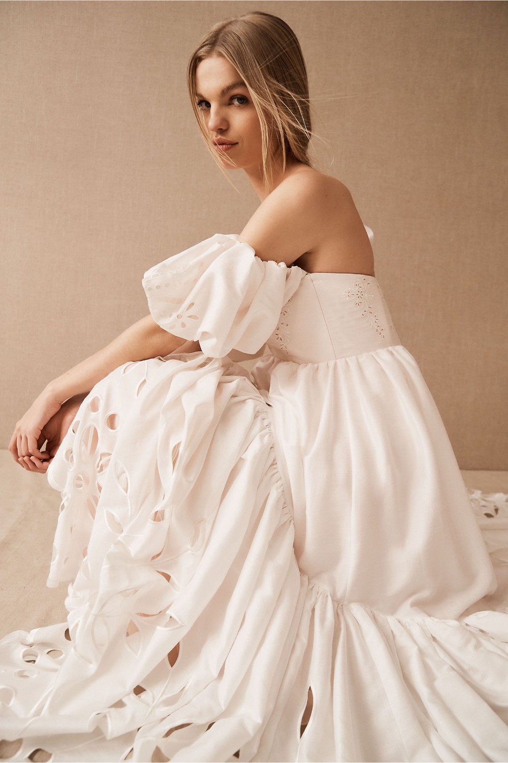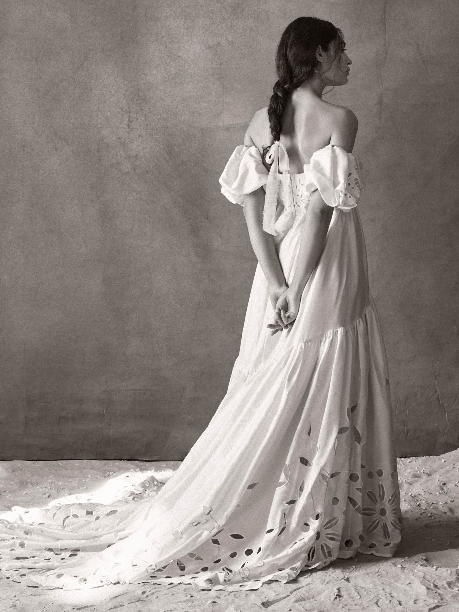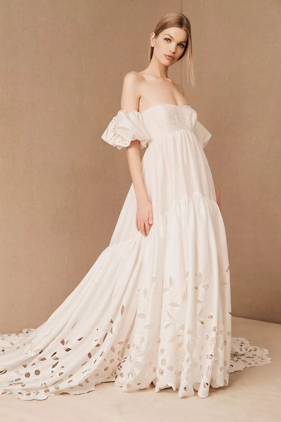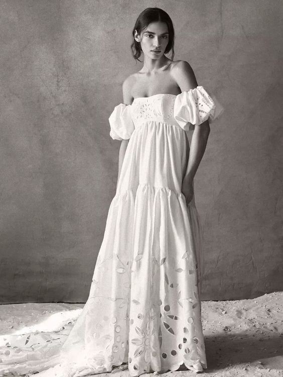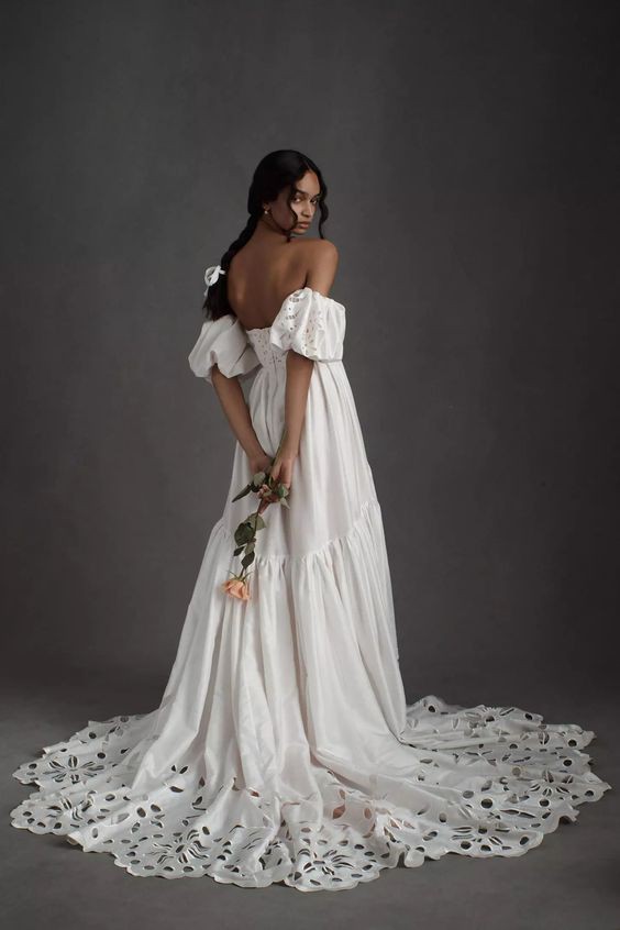 Created entirely by hand, this bohemian gown's large-scale cutwork takes its cues from French Regency design. We hunted high and low for a cotton silk taffeta with the perfect slub texture, which allows the gown's dramatic silhouette to strike a balance between nostalgia and modernity. Off-the-shoulder puff sleeves and a sweeping train complete this maximalist look.