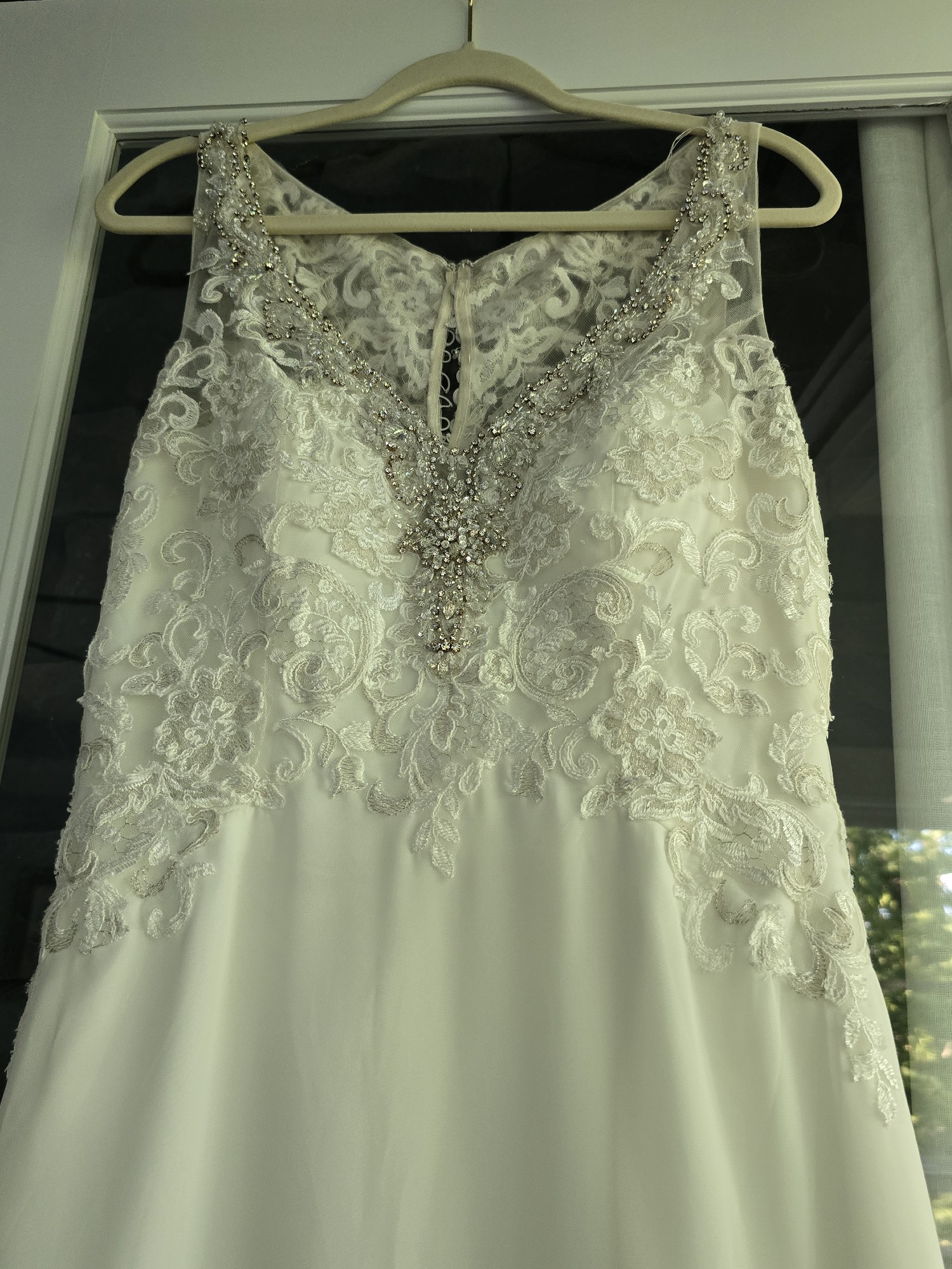 The sheer back adds a modern twist, revealing just a hint of skin while ensuring a breathtaking view from every angle. Delicate beading adorns the bodice, catching the light beautifully and creating an ethereal shimmer that radiates romance. Crafted in classic white, this floor-length gown is timeless yet contemporary, ensuring you look stunning as you walk down the aisle.