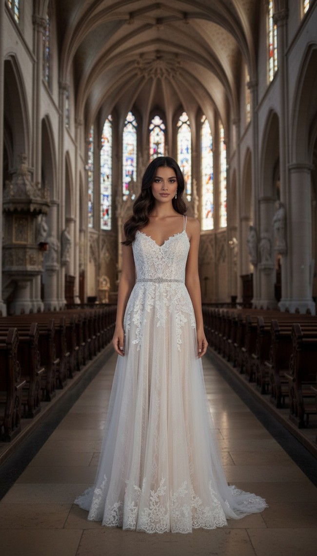 Delicate spaghetti straps (2) provide a delicate balance of support and sophistication, allowing for ease of movement throughout your special day. The floor-length design evokes a regal presence, complemented perfectly by intricate embroidery and shimmering crystals that catch the light in a mesmerizing dance. Soft ruffles adorn the skirt, adding texture and dimension that transforms the gown into a true masterpiece.