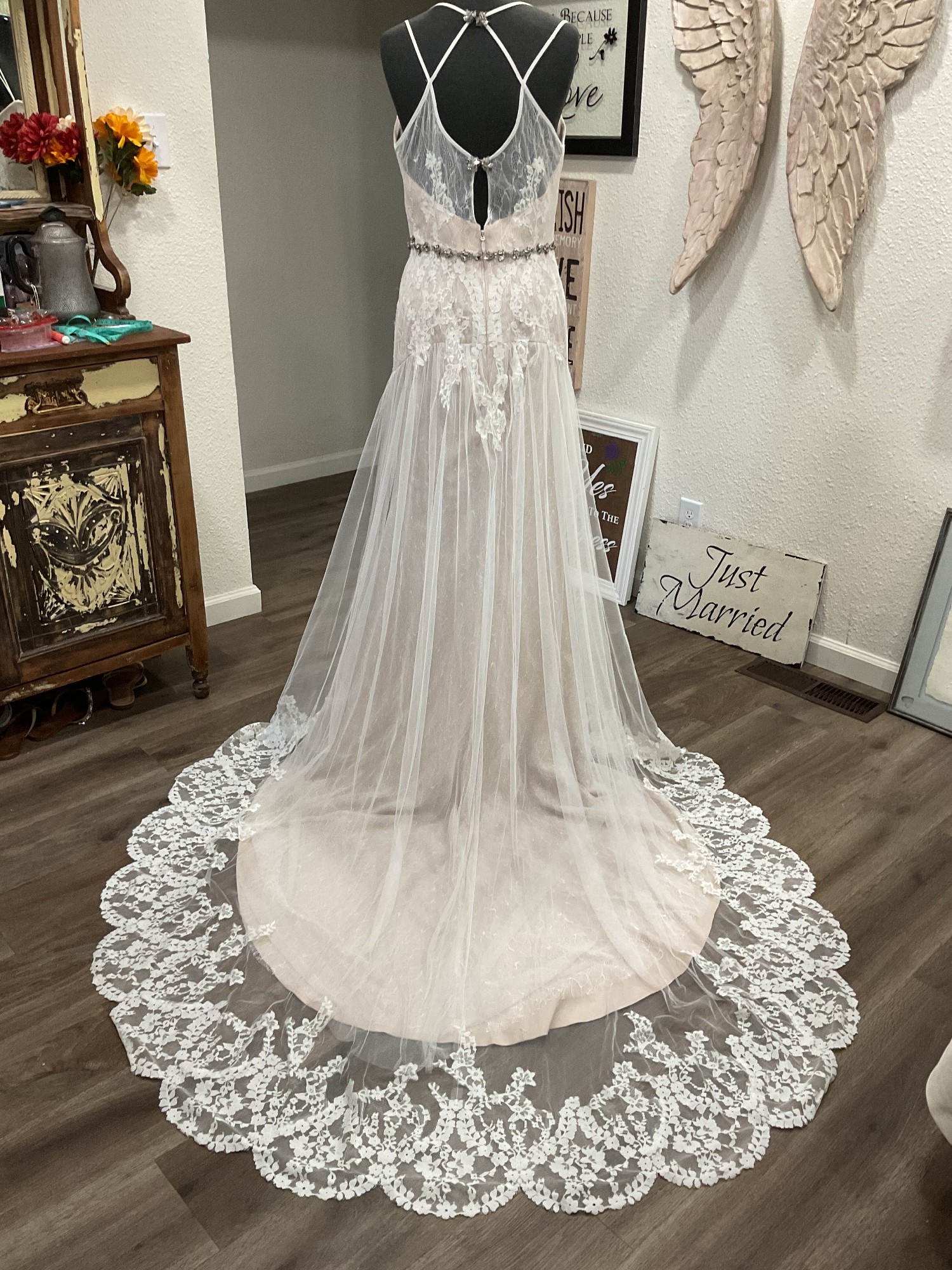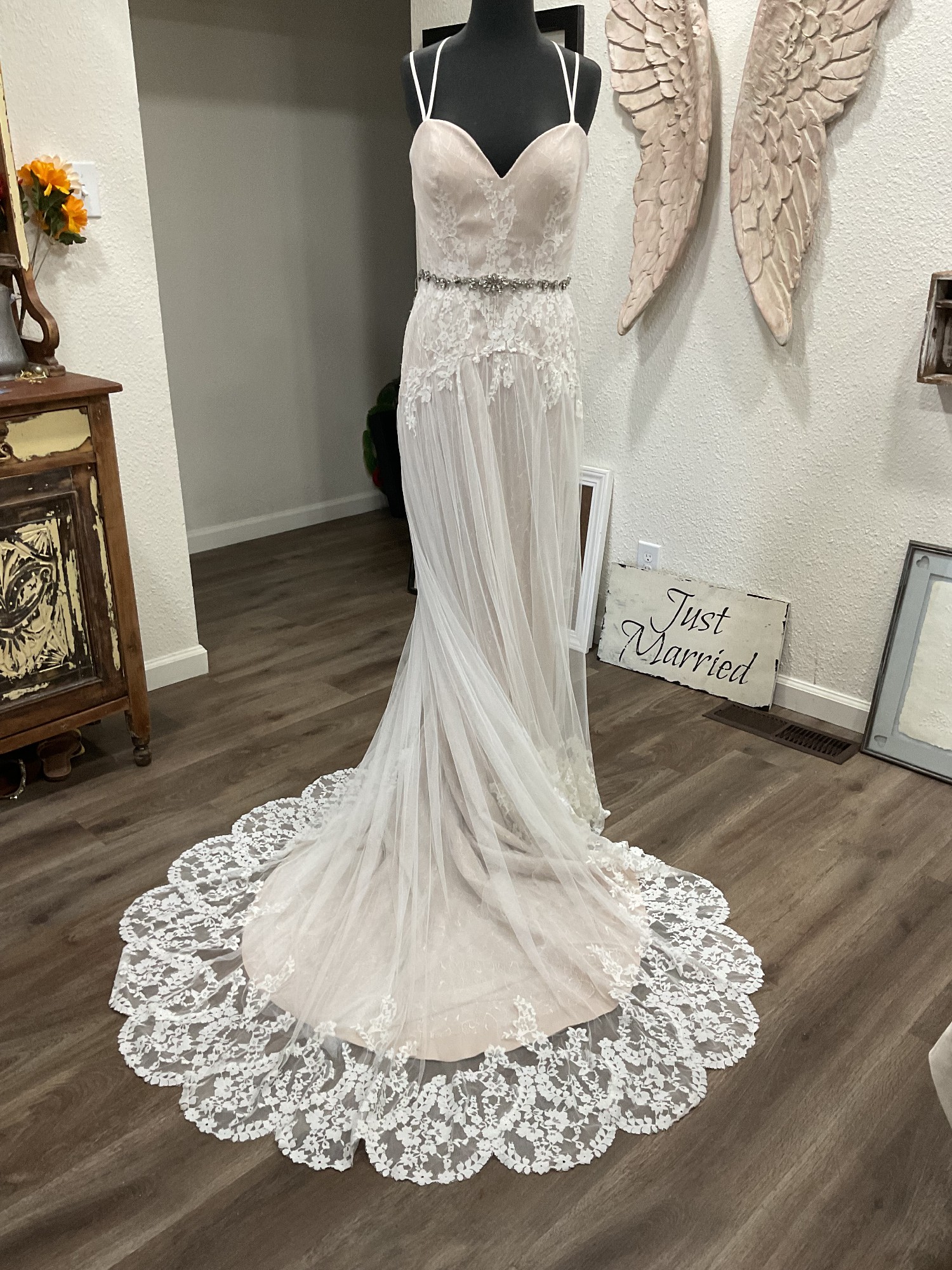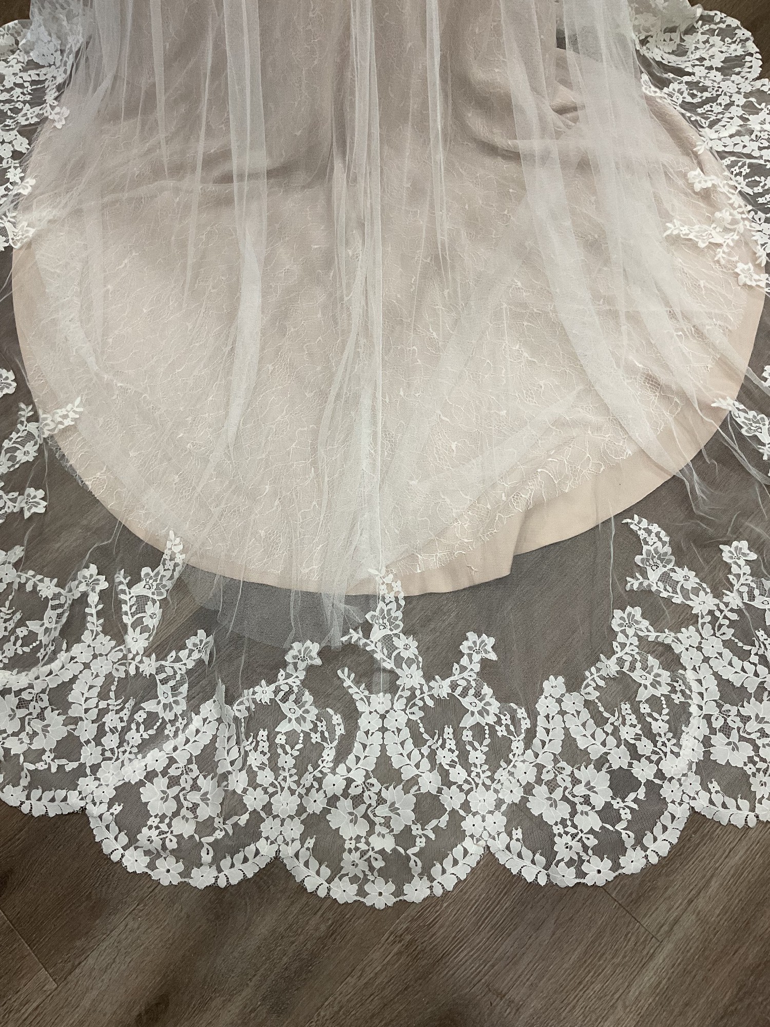 The train is so lovely and is 3 feet extending from the bottom of the gown and with tulle and lovely Spanish lace.