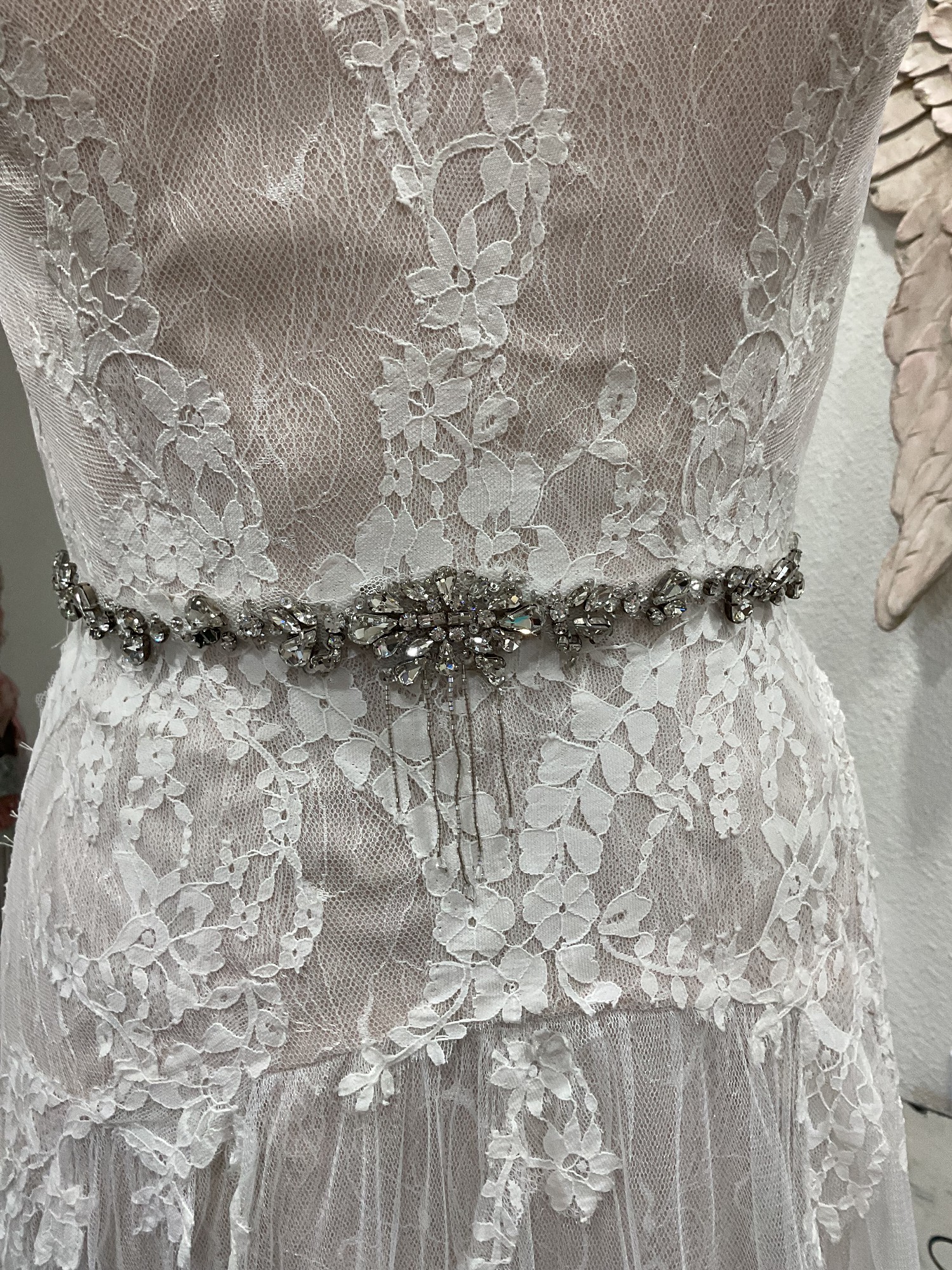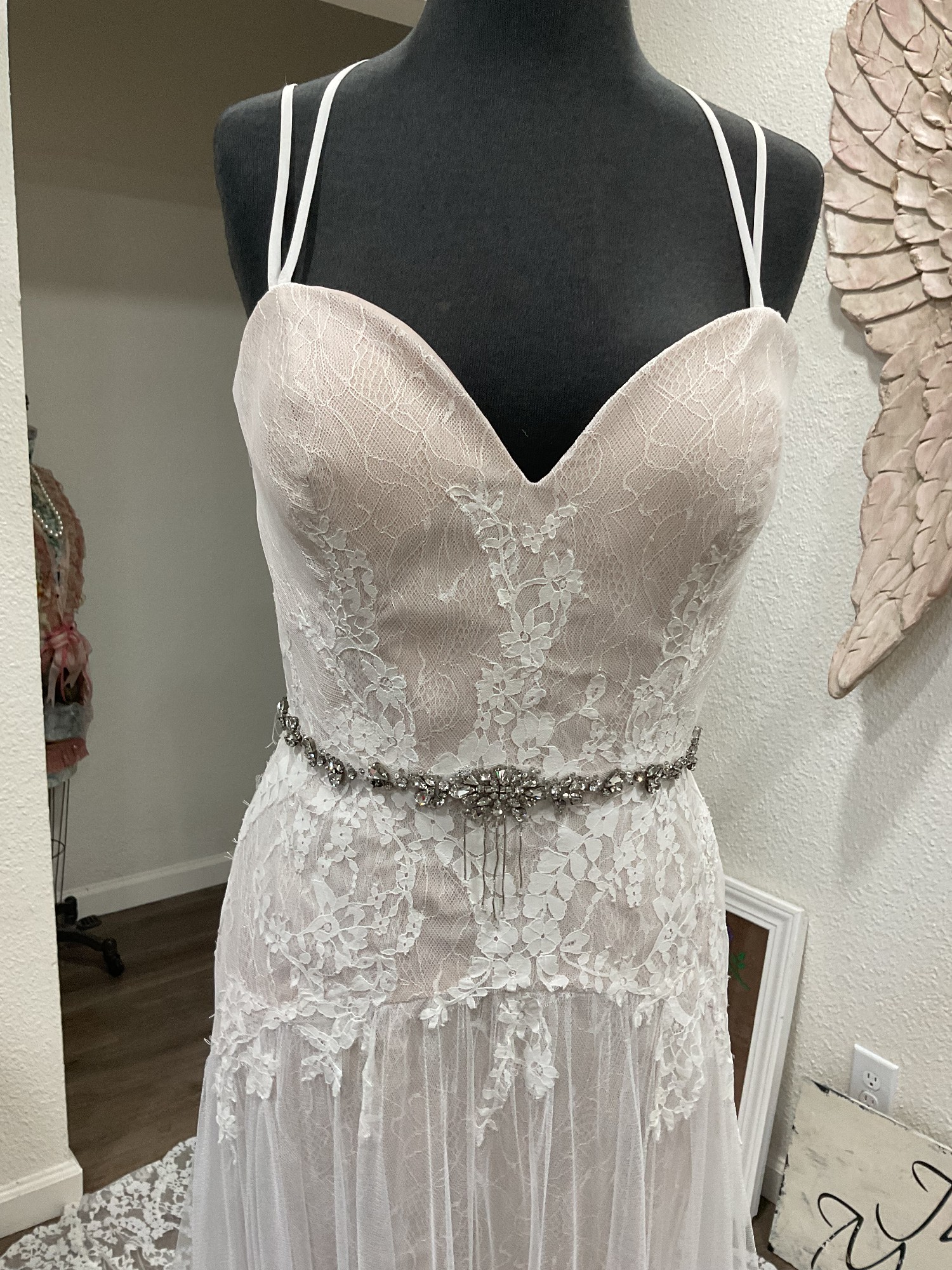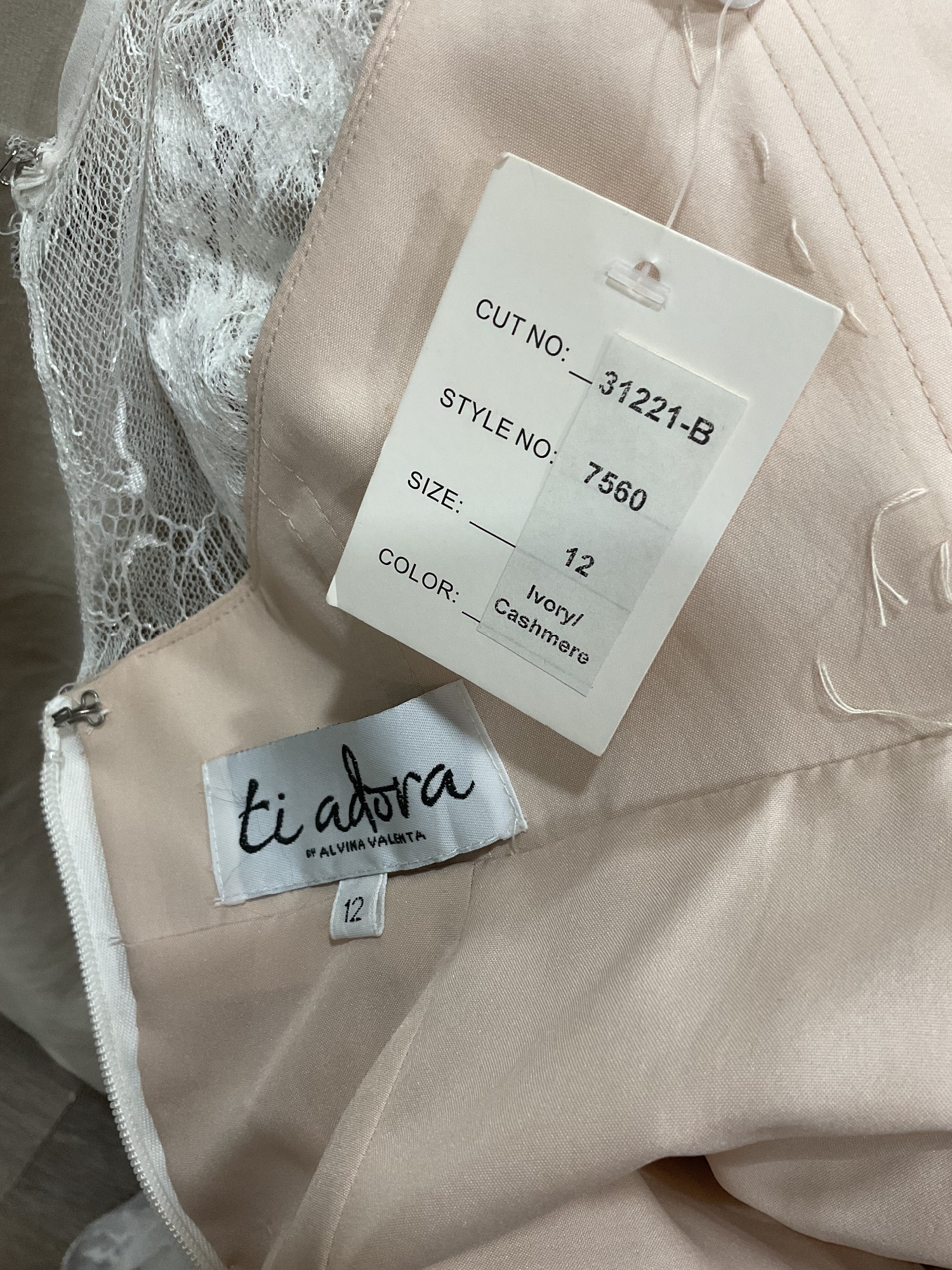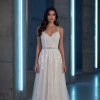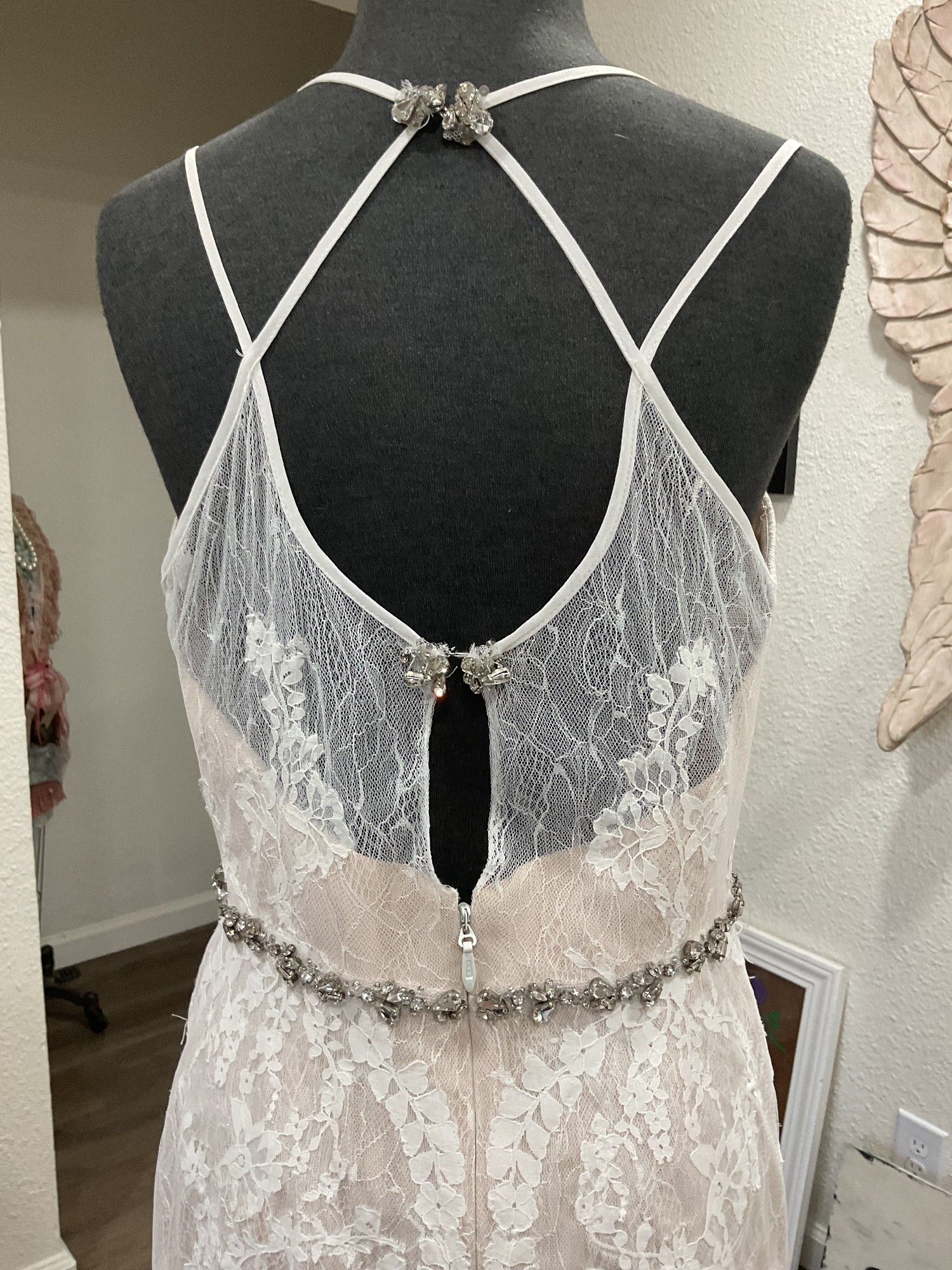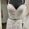 This Ti Adora #7560 gown by Alvina Valenta is a stunning choice for the modern bride seeking elegance with a touch of whimsy. The exquisite ivory fabric drapes beautifully, creating a captivating A-Line silhouette that flatters all body types. The sweetheart neckline adds a romantic flair, while the low back enhances your natural beauty, ensuring you feel confident and radiant as you walk down the aisle. The back is low, has some see through tulle as well as two places the at the neck and at the place between your shoulder blades. Both are connected with hooks and covered in clear crystals. Plus on the lower back is the short zipper. Beautiful design.