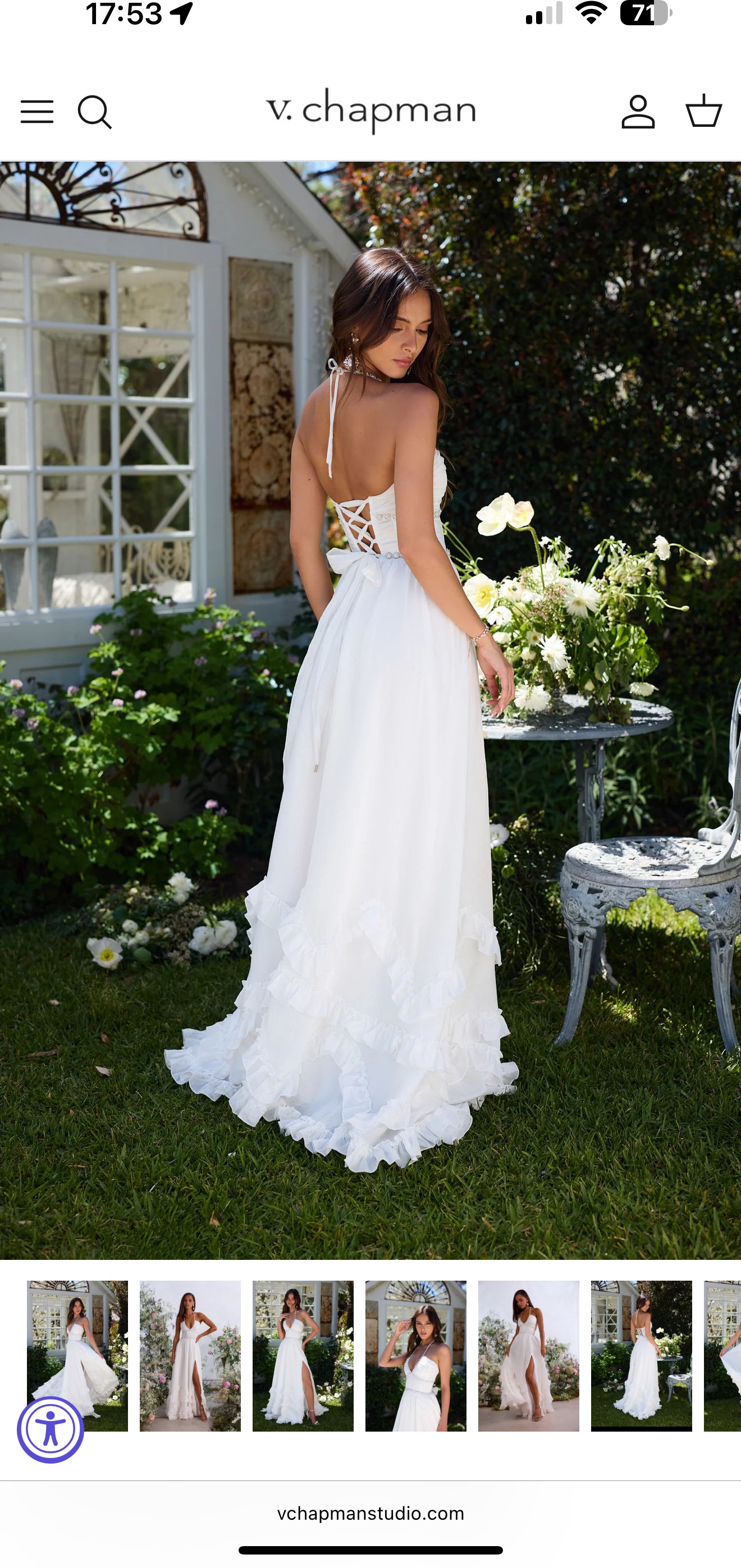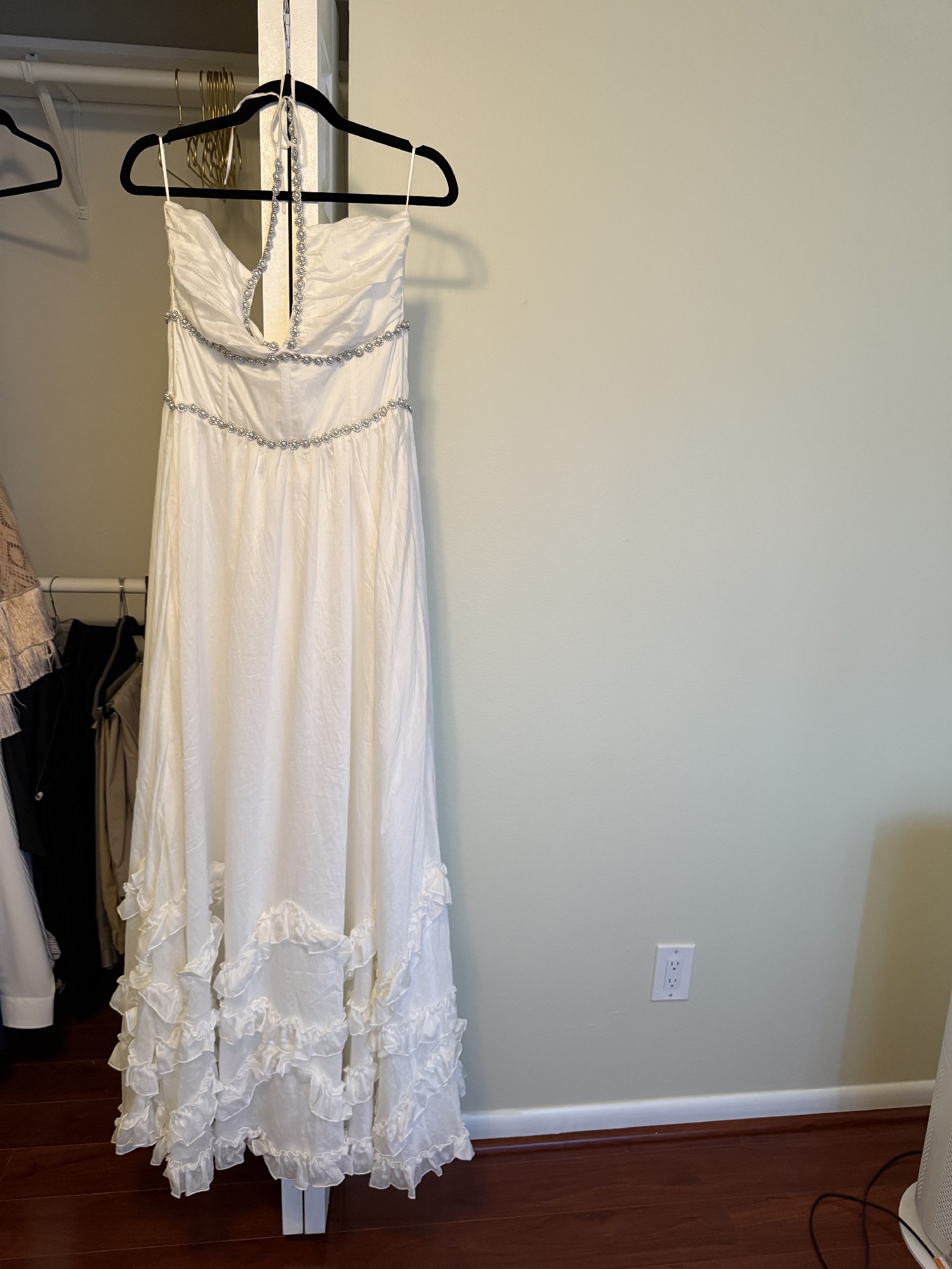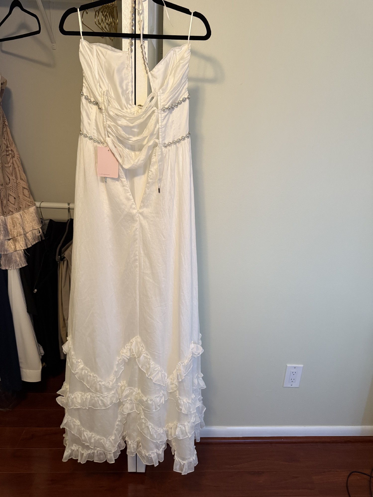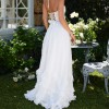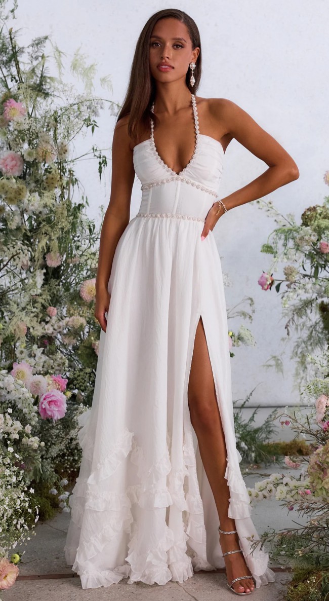 A stunning halter corset gown embellished with dazzling pearl and crystal beaded trim. Finished with dreamy ruffle details, side-front slit, and laced corset back, she'll surely turn heads.