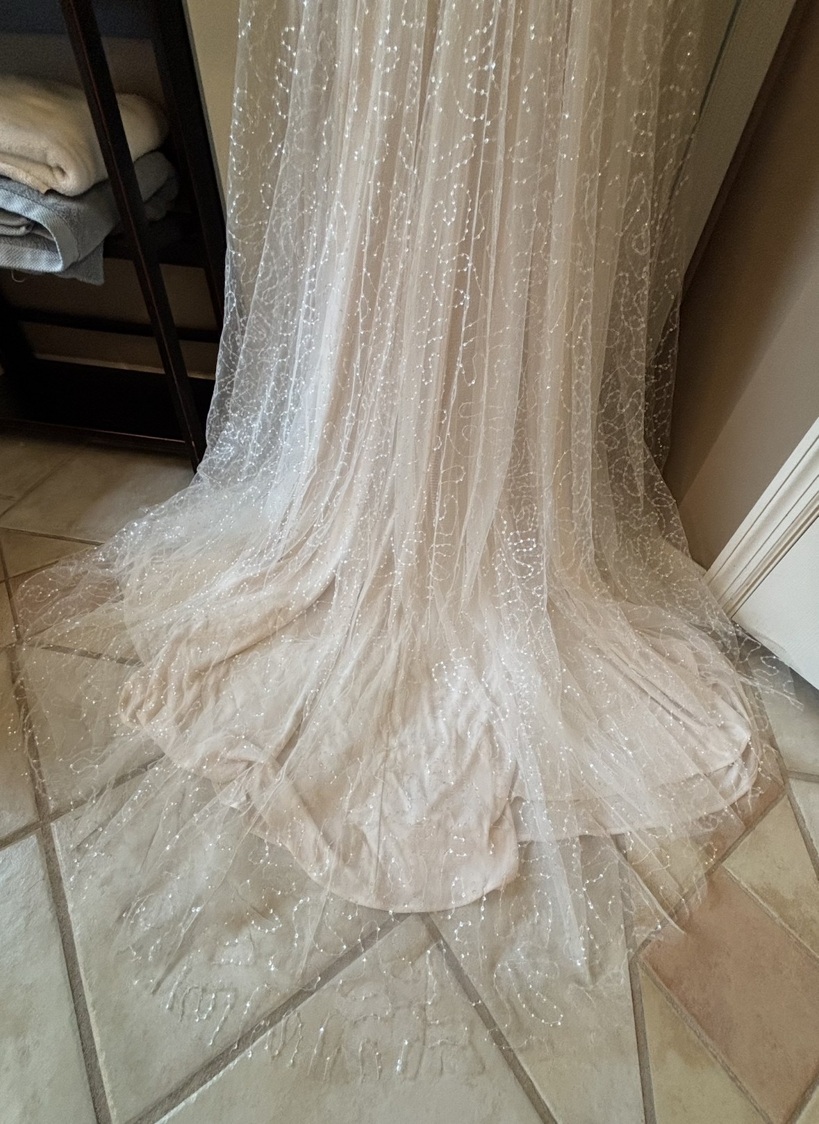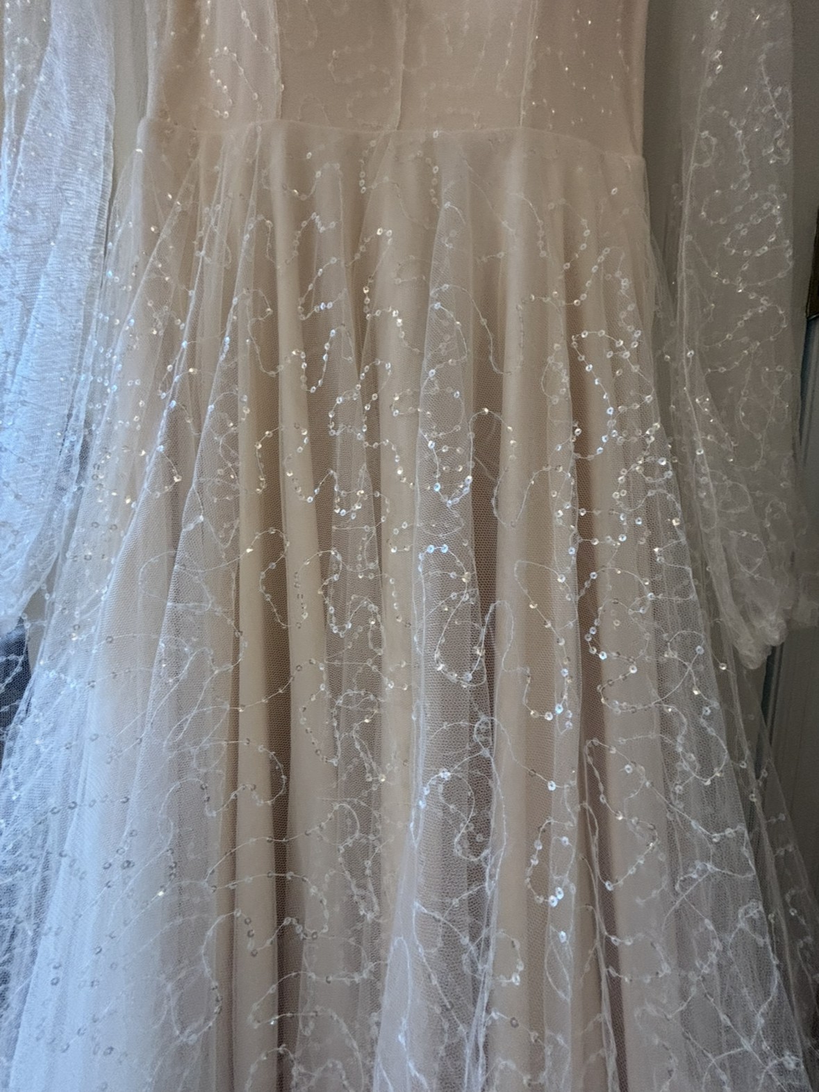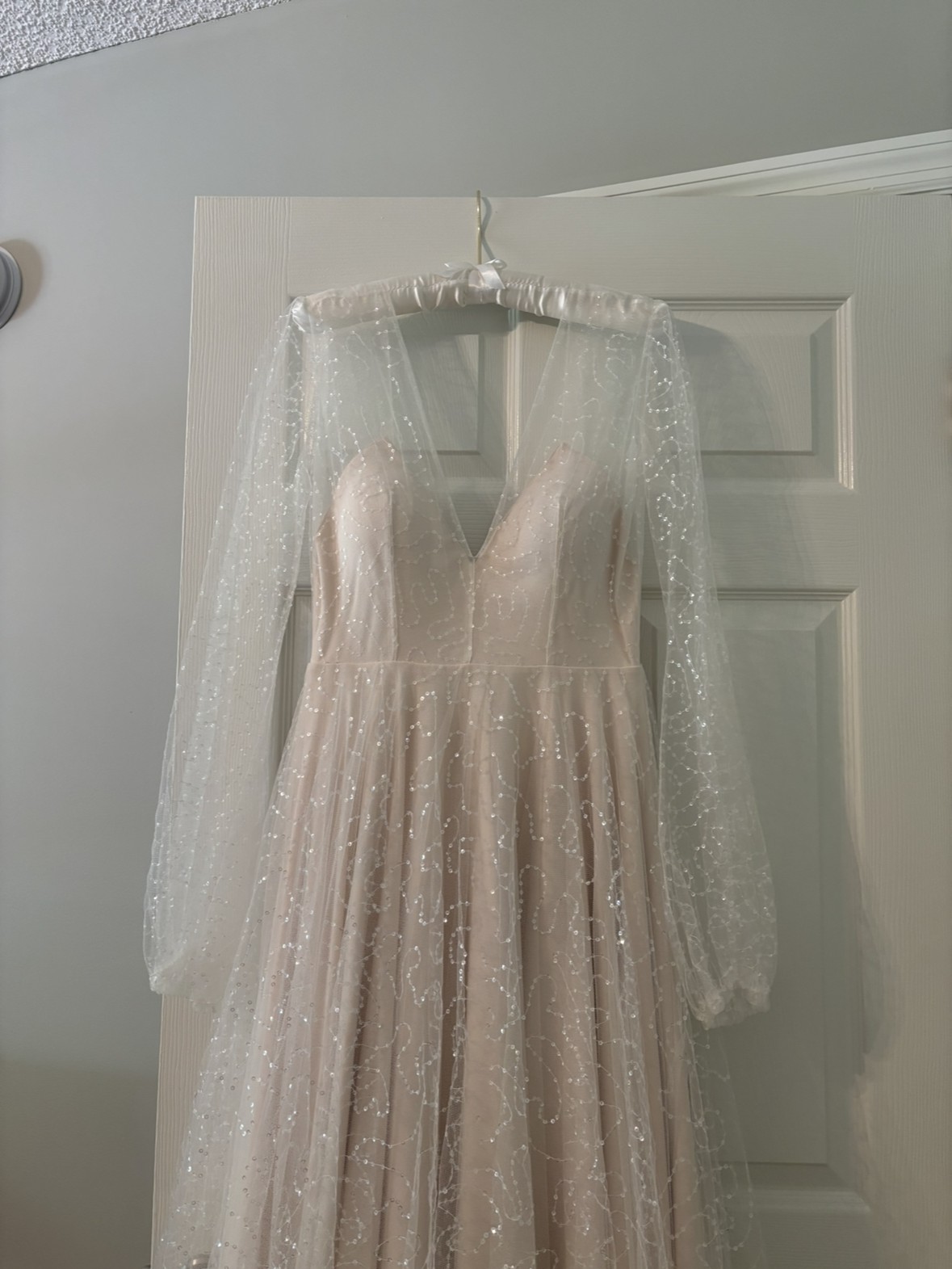 Dye custom wedding dress - never worn, no alterations, and in pristine condition. This gown features a romantic silhouette with sparkling sheer overlay and a soft blush lining that catches the light beautifully.