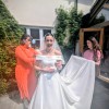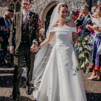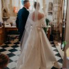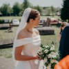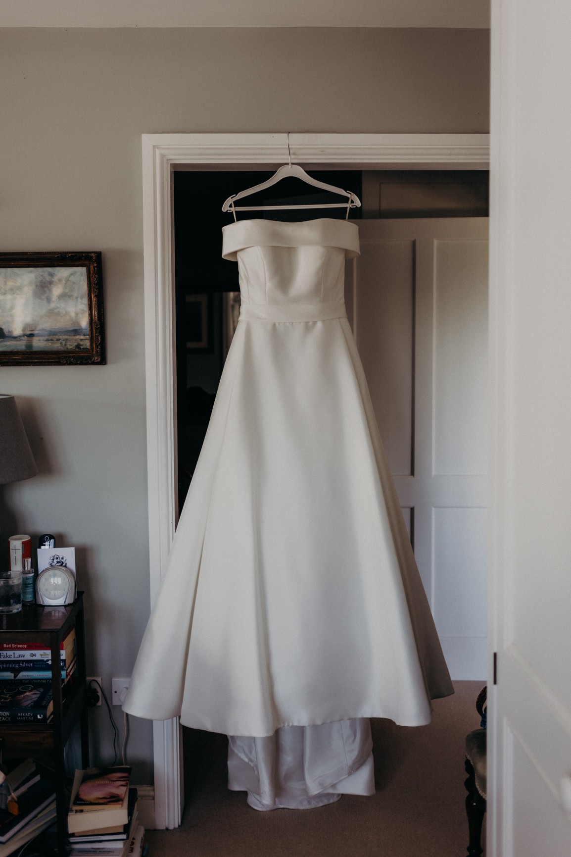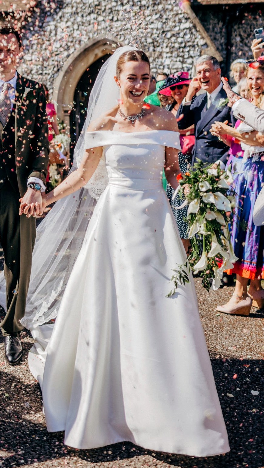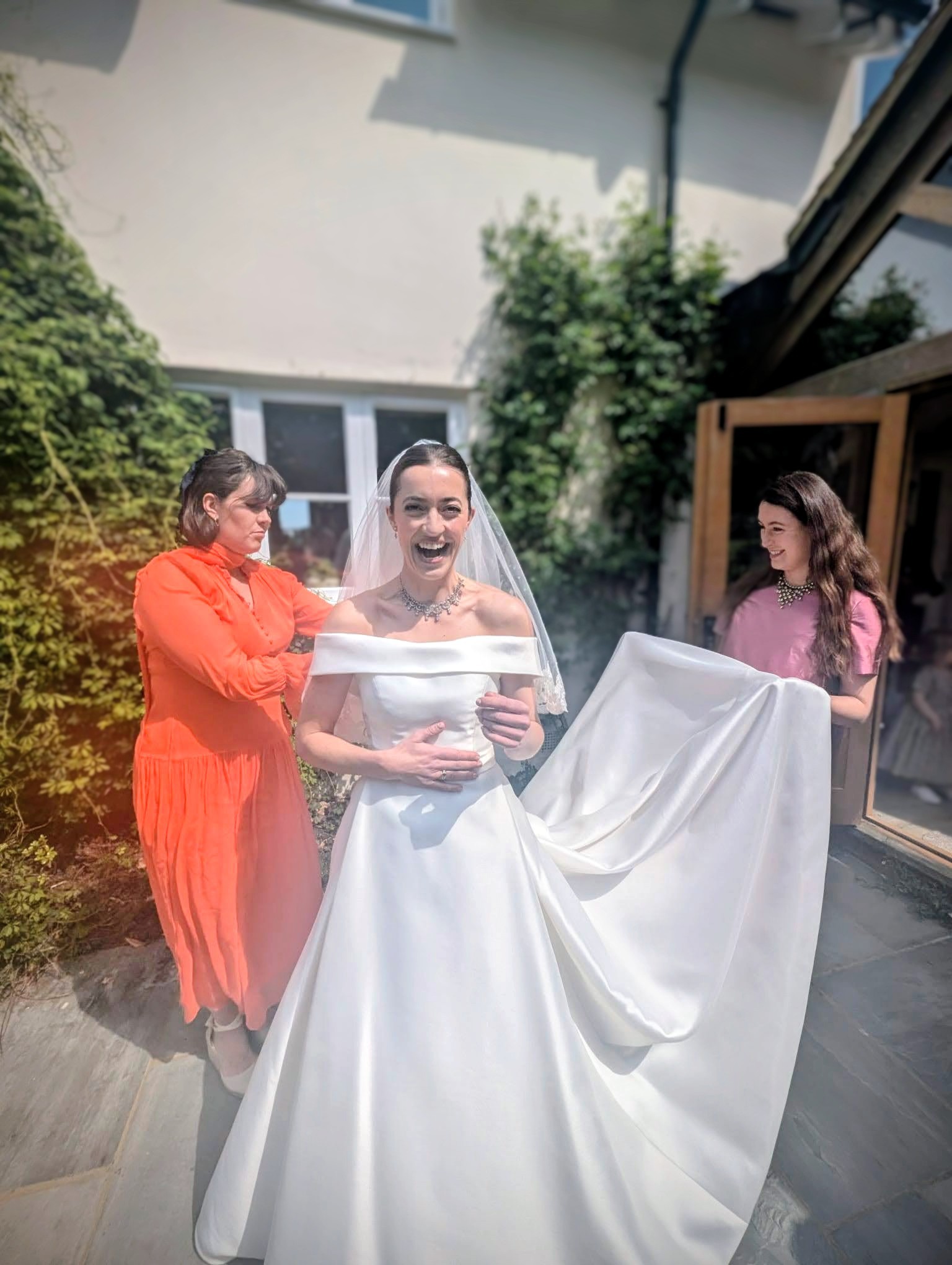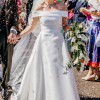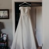 Off the shoulder Mikado A Line dress with Bardot neckline. Incredibly flattering with chest support and corset style back to cinch you in! I loved wearing it and really felt like a 'bride' in it. Offers accepted. I bought this dress as a size 14 and had it altered to fit my measurements. I am chest size 32E with a size 10 waist, and it was hemmed to fit my height of 169cm with low heels.