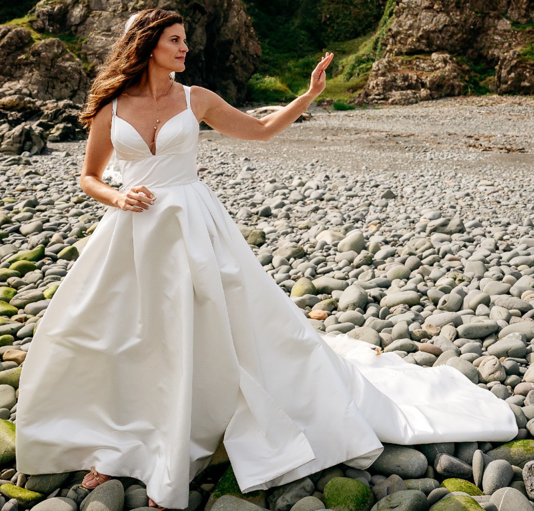 This is a stunning Jane Hill (Australian luxury designer) original dress. I ordered a size 14, but it was altered to about a US reg size 8-10 (measurements listed are post-alteration measures). It is a very comfortable ball gown with a generous slit up the left side. We got married in Scotland at an estate - this gown is a statement piece..fit for a queen! Want to also eat all the great food at your wedding and dance the night away? This dress is for you! It will snatch your waist and lift your bust! It folded into a carry-on suitcase to fly! Steams up beautifully. This is a classic style dress that won't go out of style. THIS IS IN EXCELLENT CONDITION!