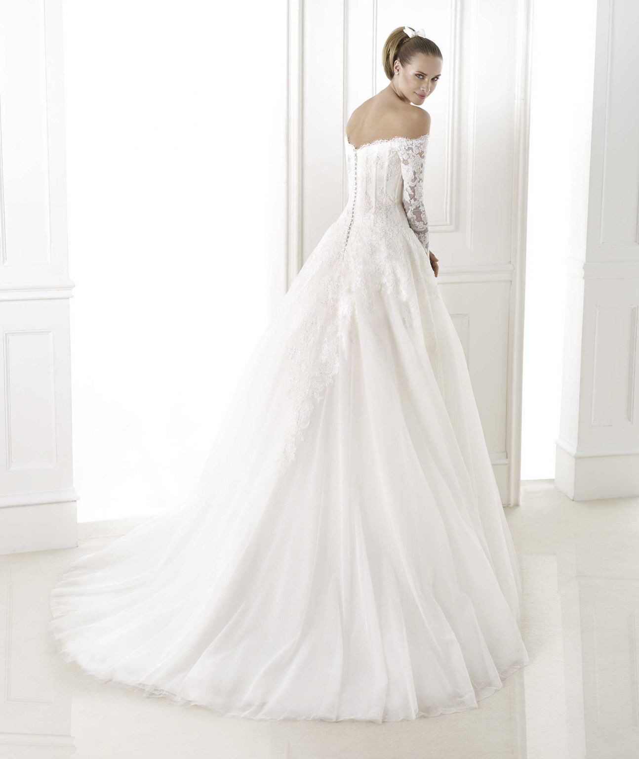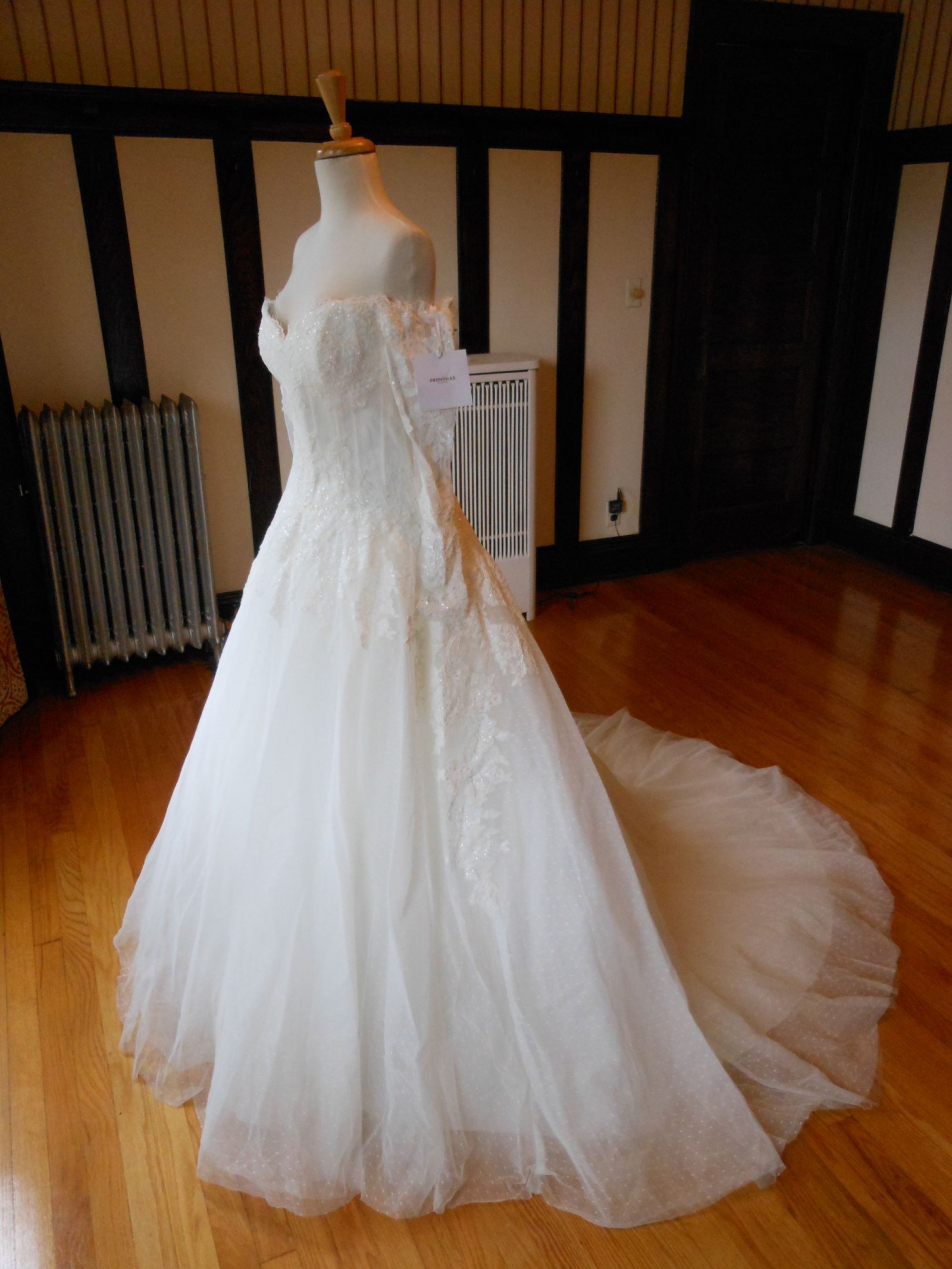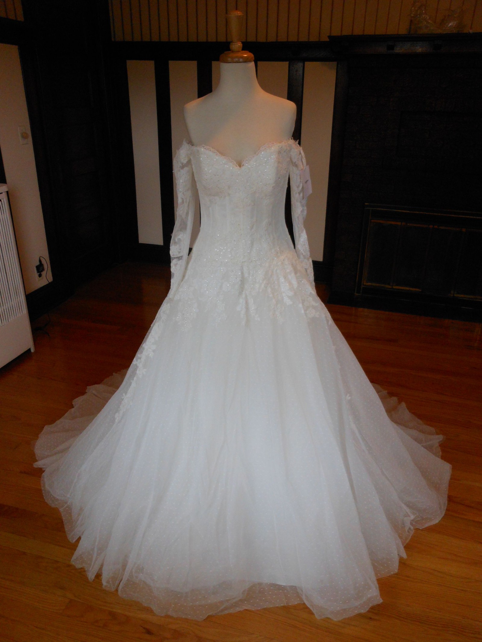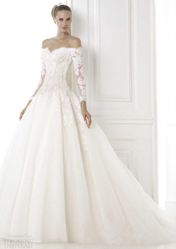 This is an Authentic PRONOVIAS Bridal Wedding Dress Gown. The name of the dress is Bespin. It has a gorgeous off shoulder ball gown style with a fabulous long train. The entire bodice, sleeves and upper skirt are embellished with exquisite floral embroidery, and sparkling beads/sequences on top of the embroidery. The bodice also has boning to build a perfect shape. The skirt is made of high grade tulle with netting petticoat inside to support a very full shape. This dress is brand new in great condition with the original label and tags. It was never worn.