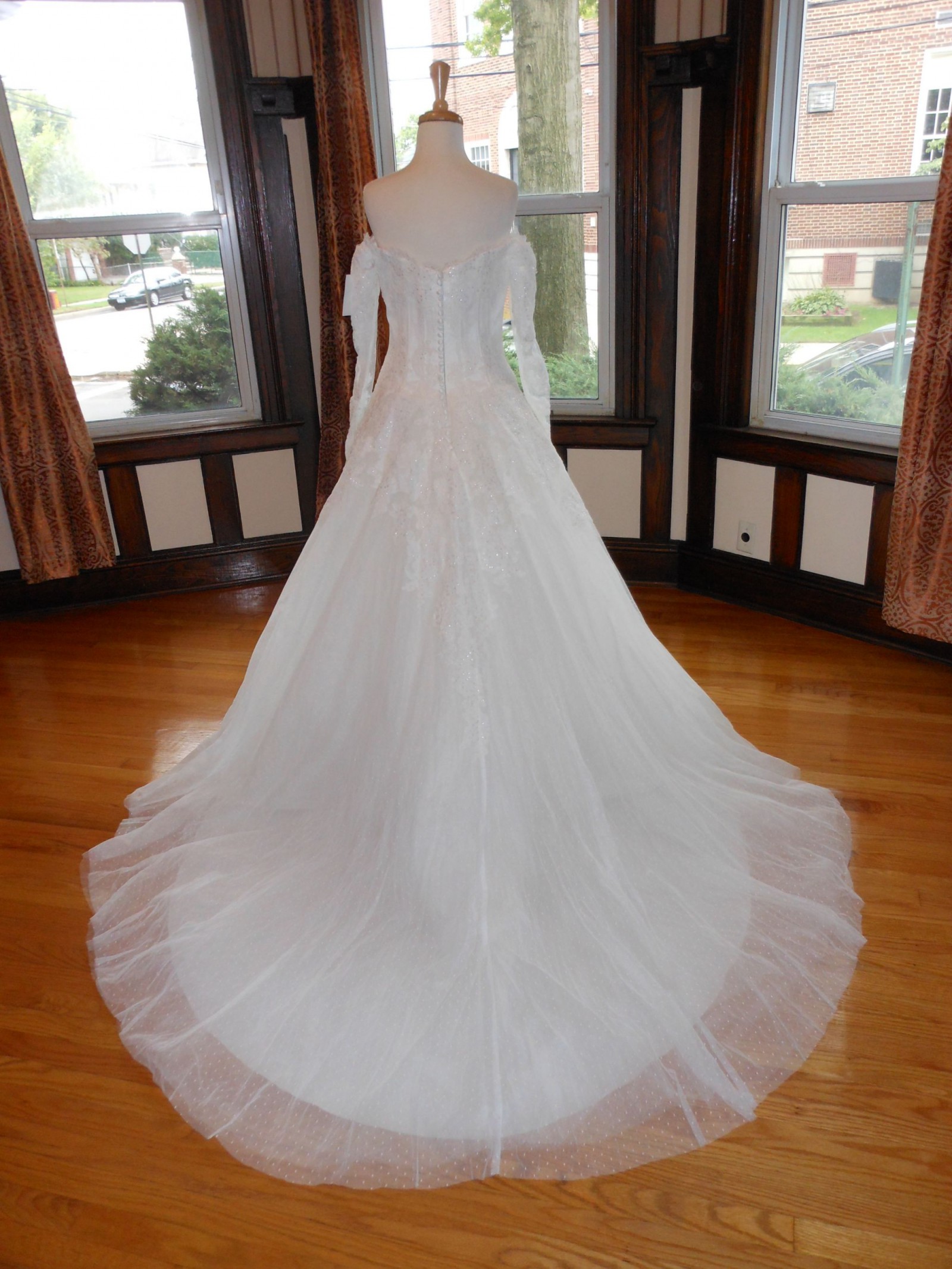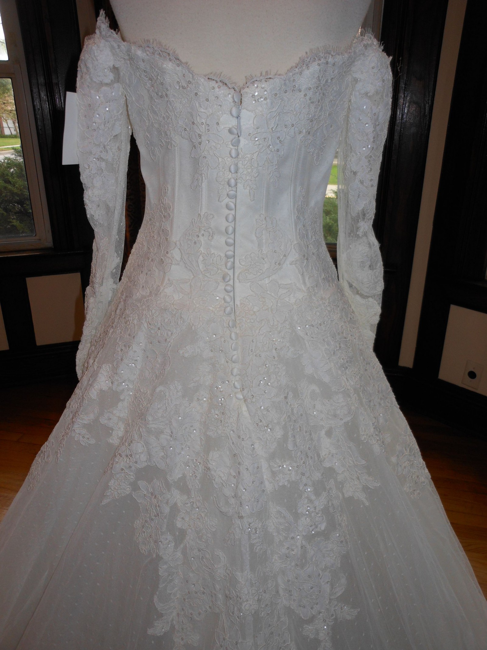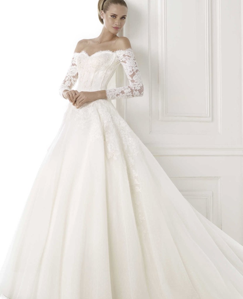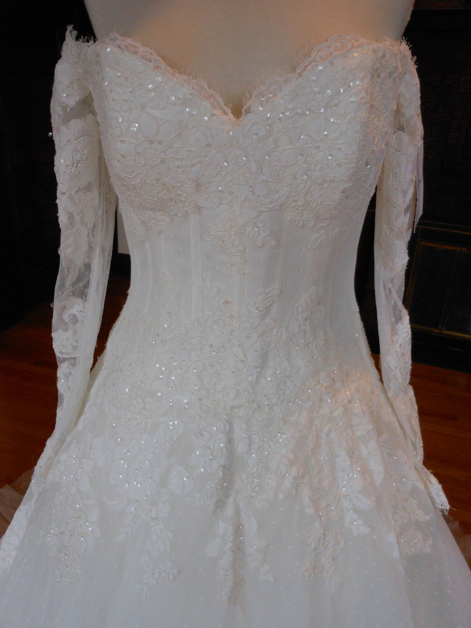 This is an Authentic PRONOVIAS Bridal Wedding Dress Gown. The name of the dress is Bespin. It has a gorgeous off shoulder ball gown style with a fabulous long train. The entire bodice, sleeves and upper skirt are embellished with exquisite floral embroidery, and sparkling beads/sequences on top of the embroidery. The bodice also has boning to build a perfect shape. The skirt is made of high grade tulle with netting petticoat inside to support a very full shape. This dress is brand new in great condition with the original label and tags. It was never worn.
