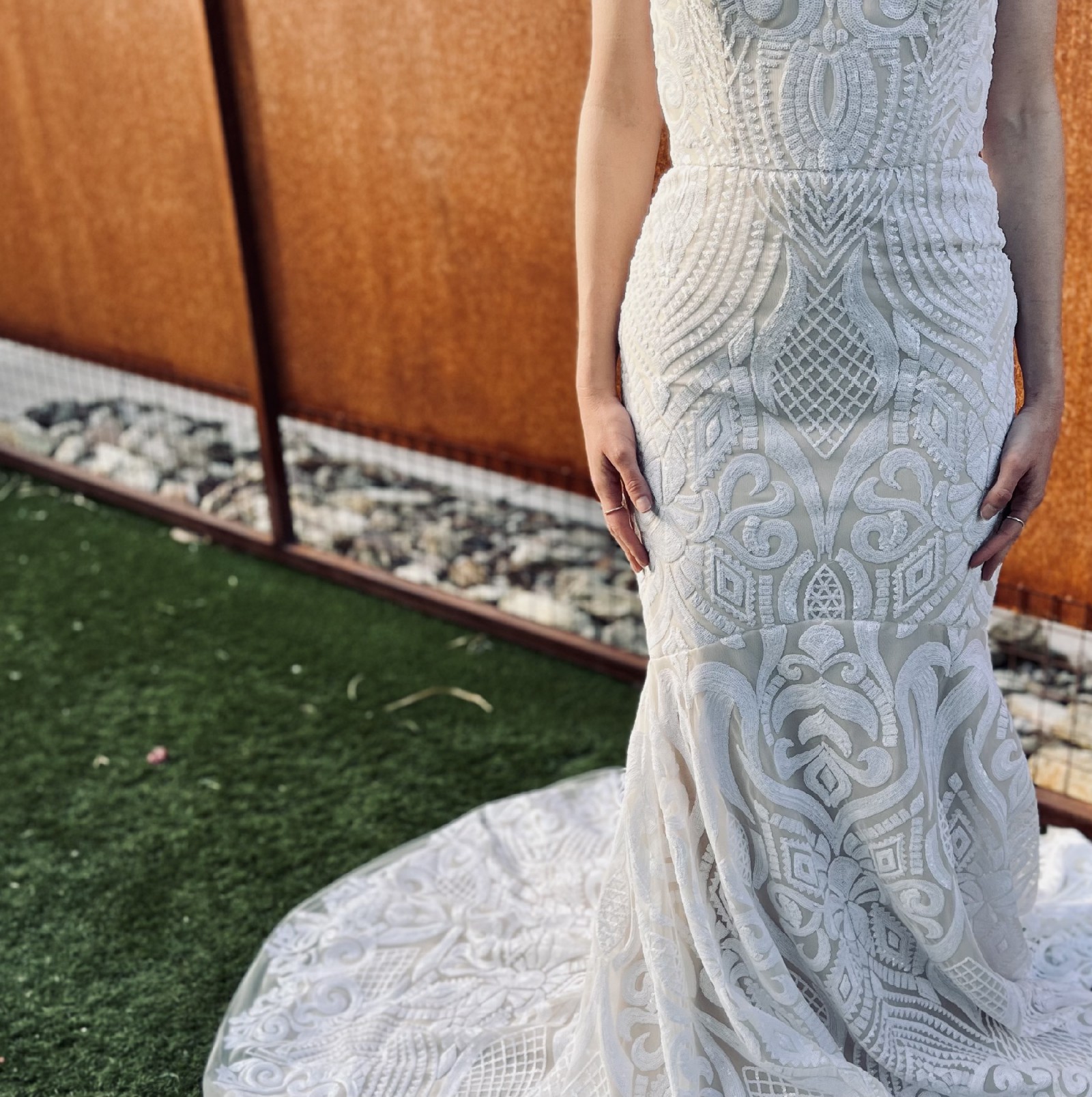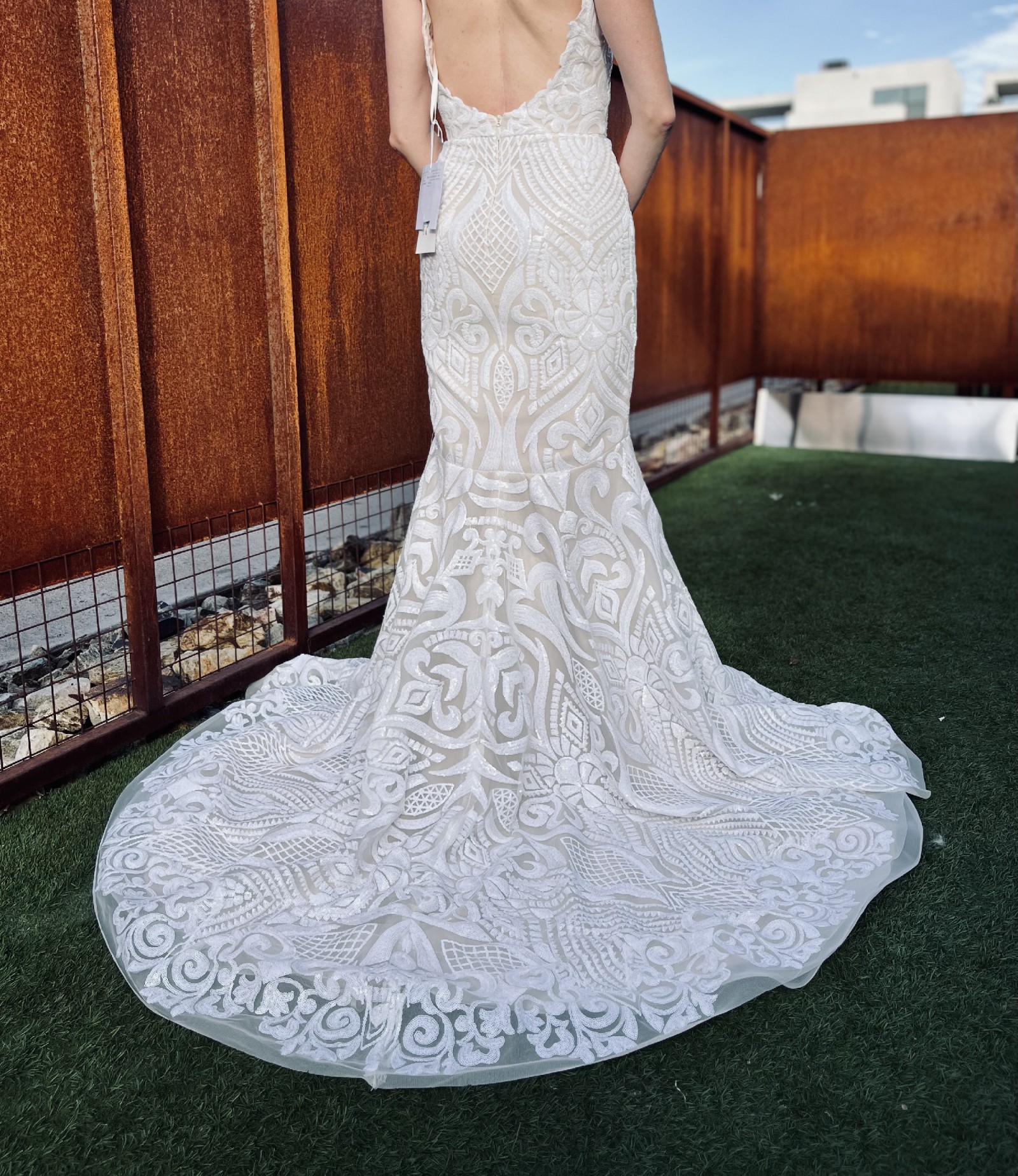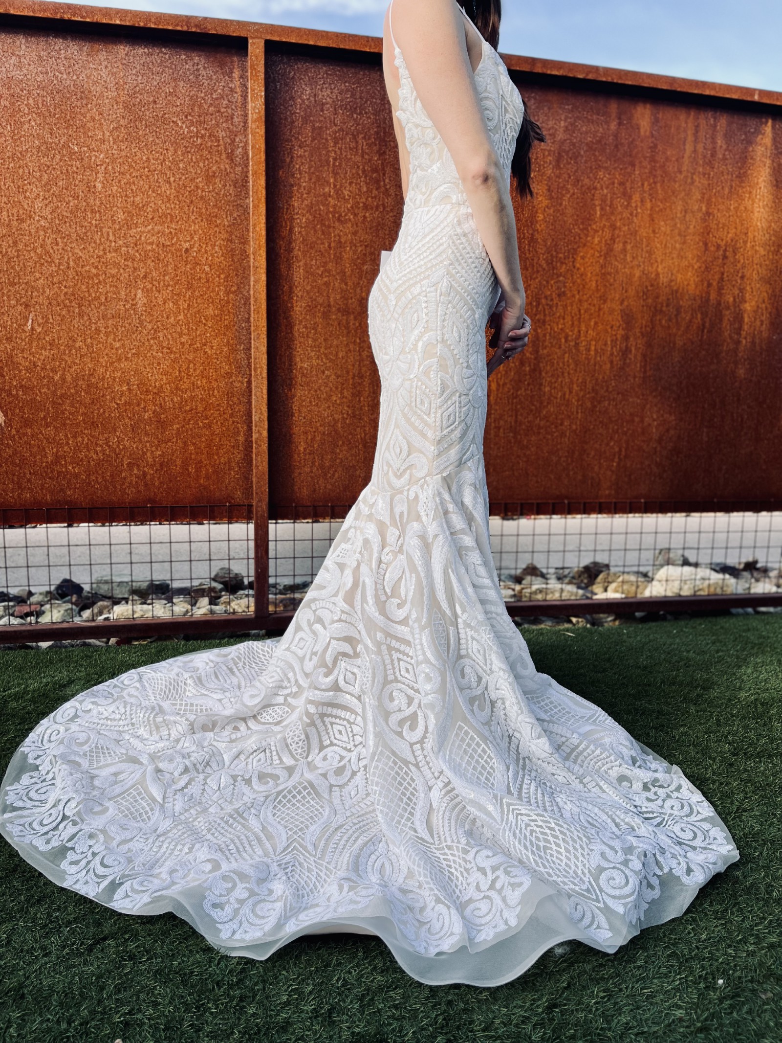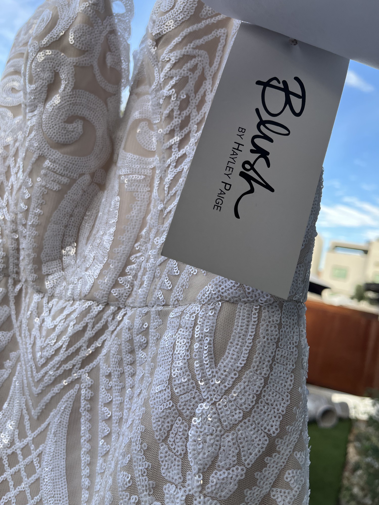 Original Blush by Hayley Paige West dress. This dress is STUNNING and will have you glistening like a goddess! I was so excited to wear it on my big day, but my plans changed. Lucky for you this dress has never been altered, and never been worn (except to take these photos), and the only time it was removed from it's original dress bag was to take photos for this listing. I will also include a white tulle veil (not pictured), for no additional cost ($100 value). The veil has also never been worn. It is between "knee-length" and "waltz-length", and simple with no embellishments, so the dress can take center stage.
