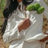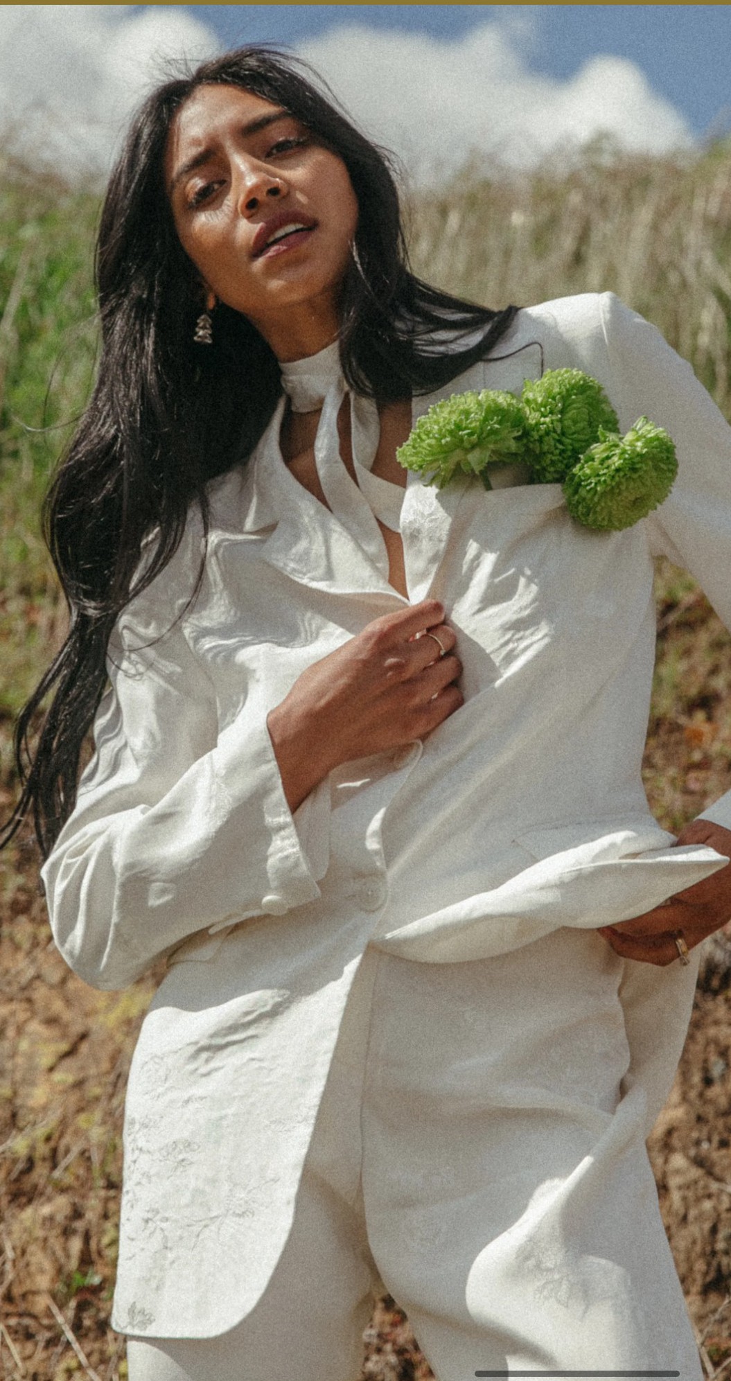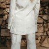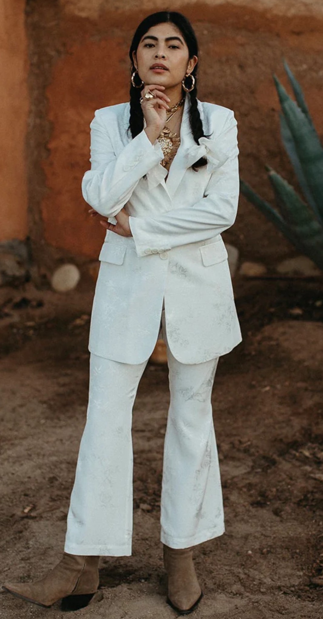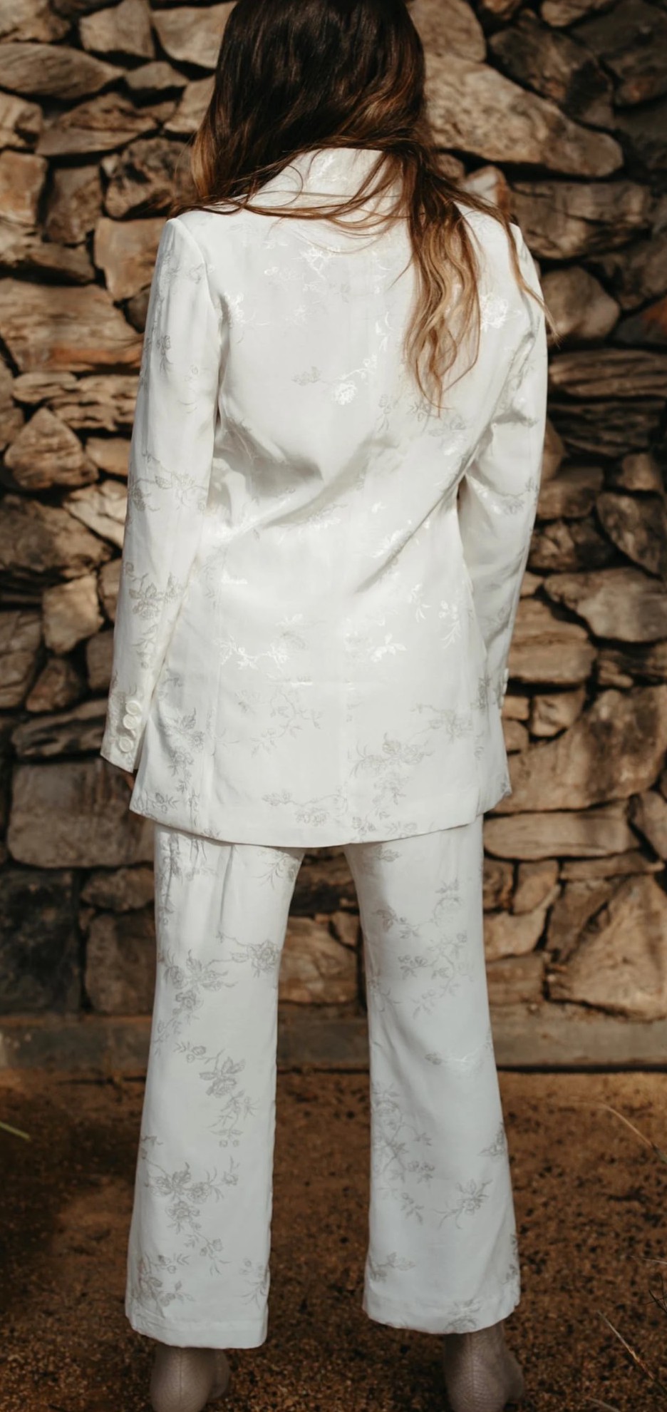 This elegant bridal pant suit by Daughters of Simone features a lapel collar blazer with long sleeves, front flap pockets, and a double back vent. The blazer has a front button closure, while the mid-rise, cropped pants are lined with ivory satin and secured with a zipper and button. The floral jacquard fabric adds a romantic, bohemian touch, offering a chic and modern alternative to traditional bridal wear.