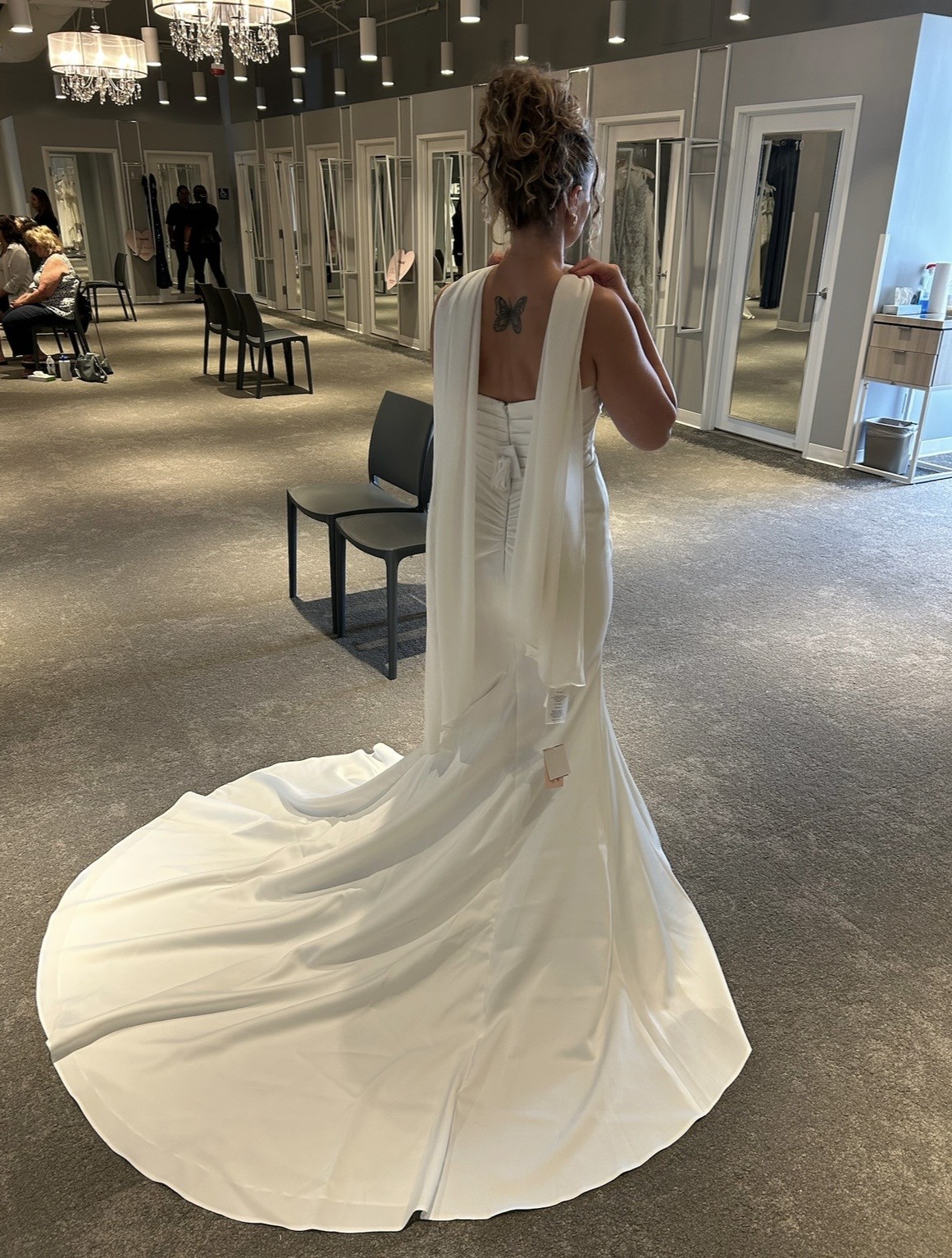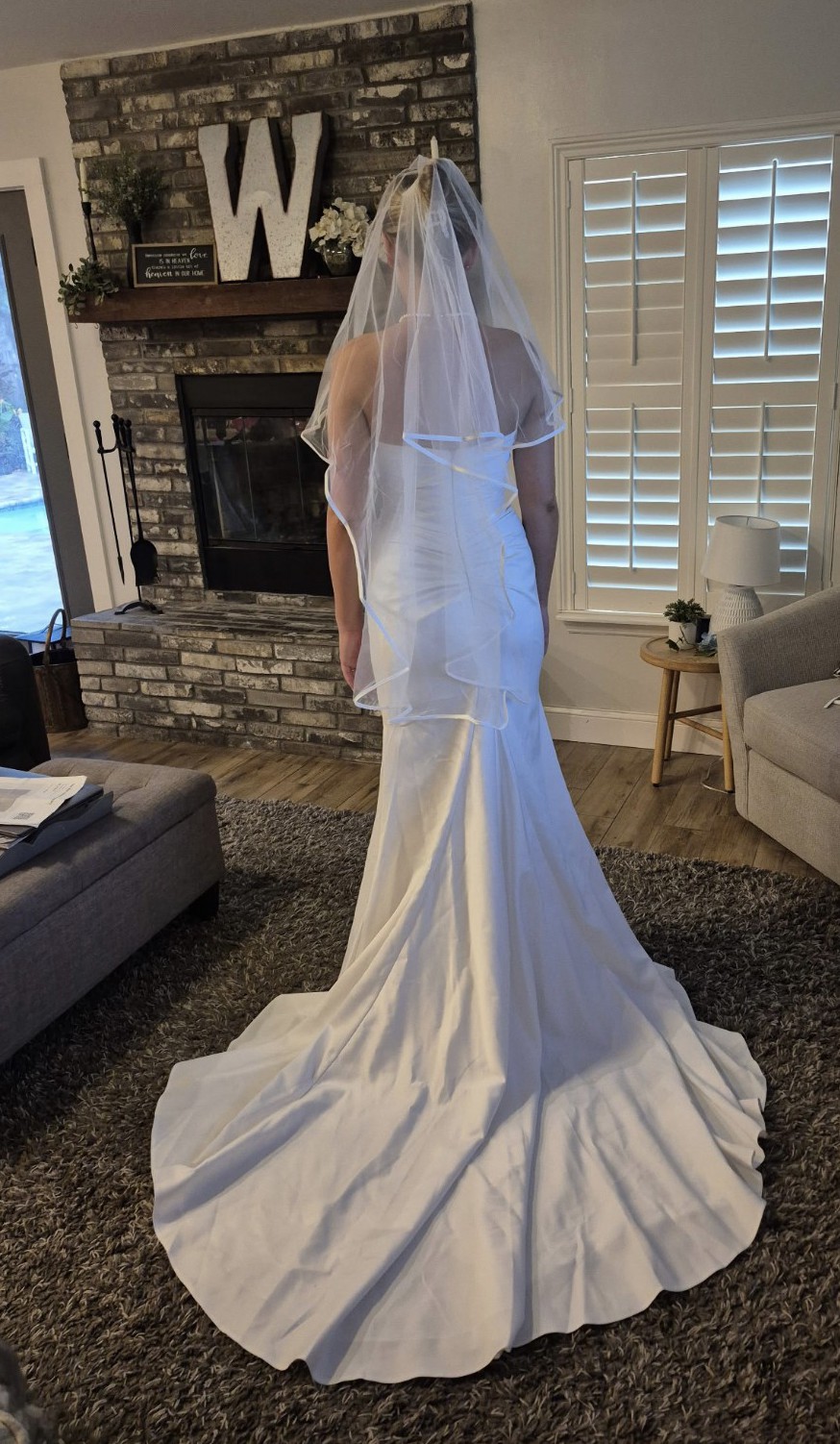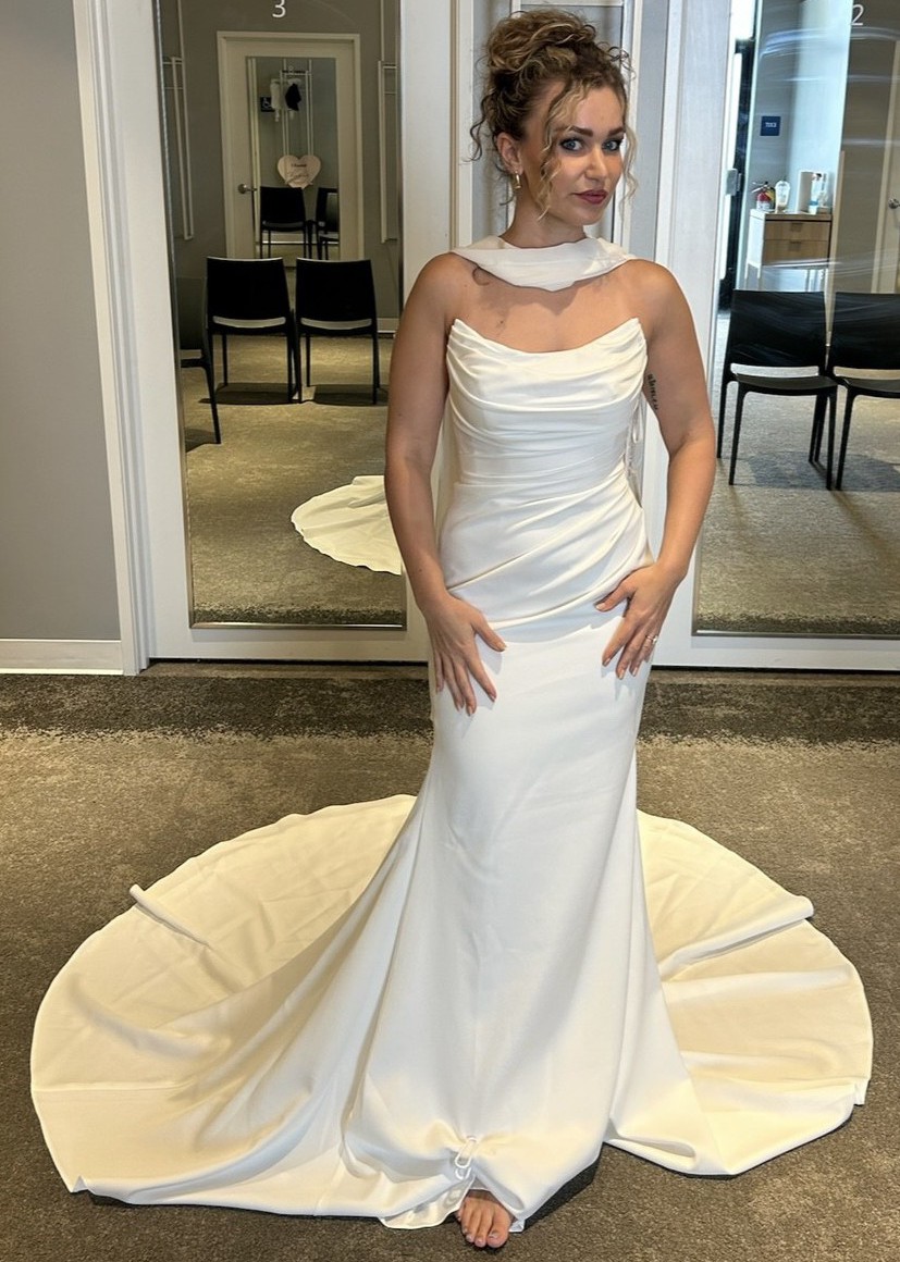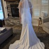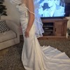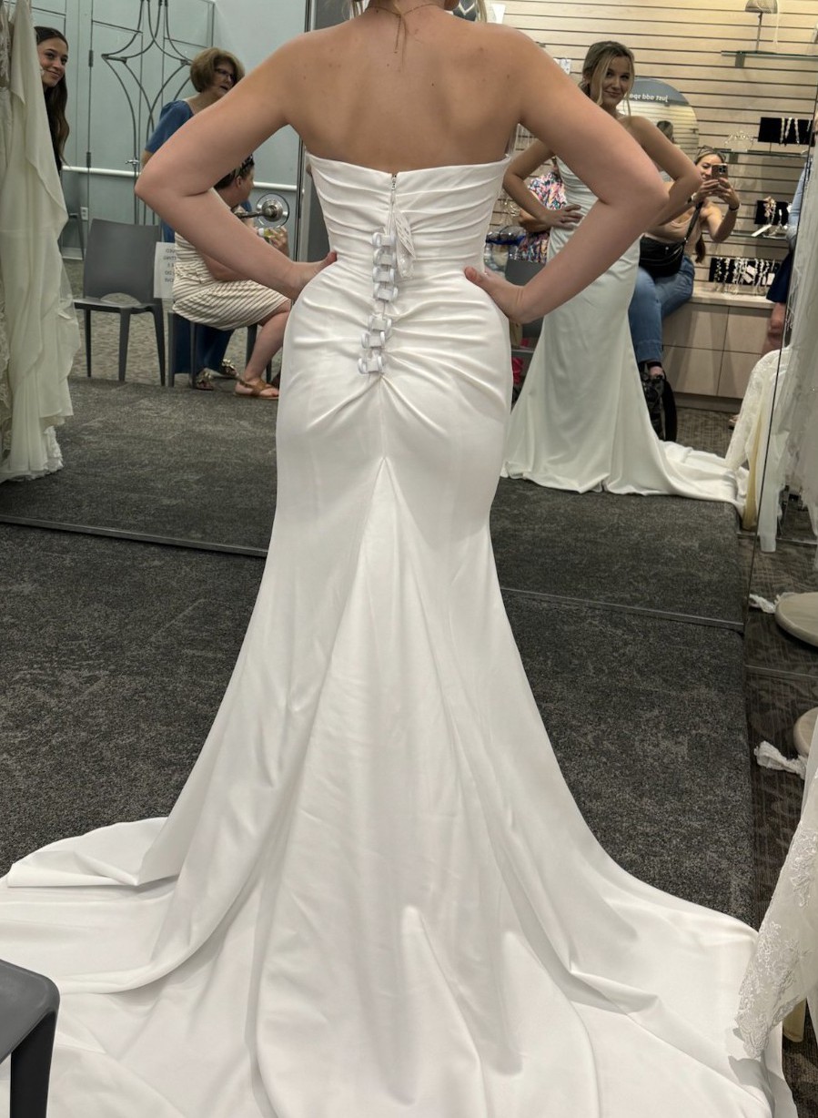 Gorgeous, elegant and classy! Unaltered, never worn, brand new wedding dress. I changed my mind on the style I wanted because I found out I am pregnant. Has a little bit of stretch to it so it’s comfortable and very flattering on the body! I am including 2 veils with purchase price. One as shown in pictures with blusher and a cathedral length with pearls. Message me with any questions, price includes shipping! Open to offers! First pics are sample in store and the others are the one time I tried on in my living room so not steamed or altered.