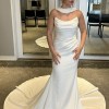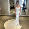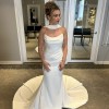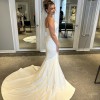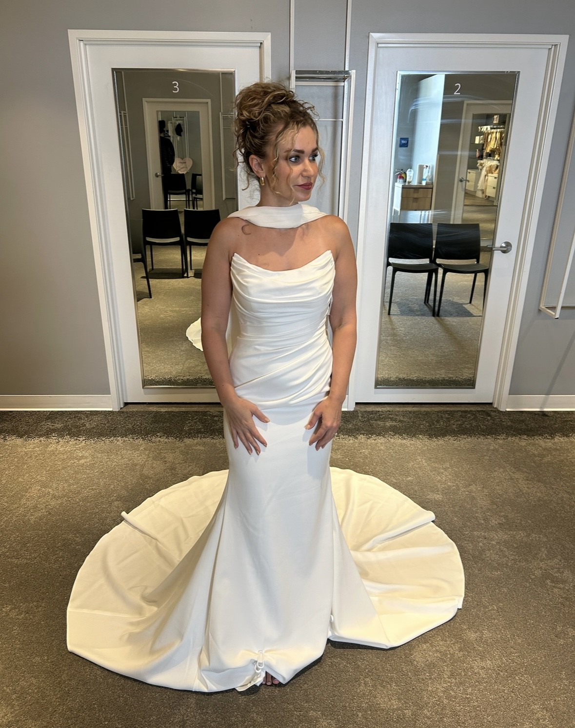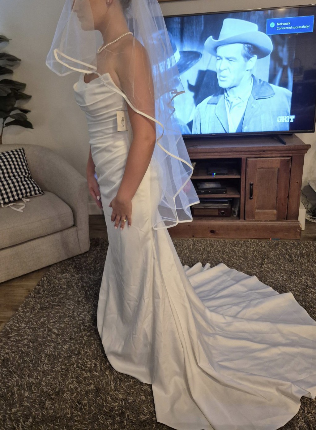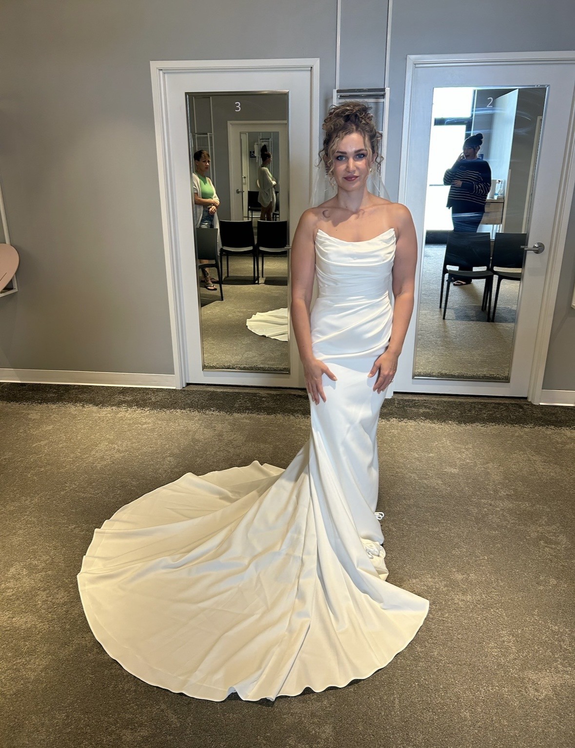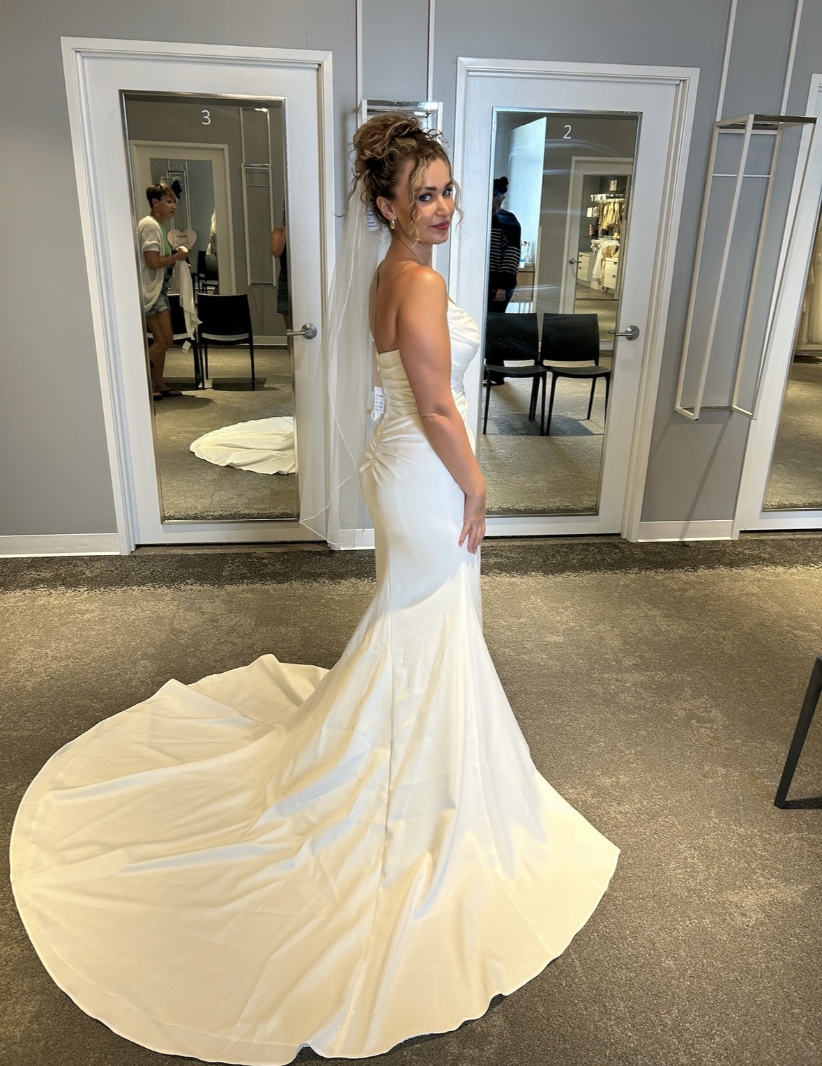 Gorgeous, elegant and classy! Unaltered, never worn, brand new wedding dress. I changed my mind on the style I wanted because I found out I am pregnant. Has a little bit of stretch to it so it’s comfortable and very flattering on the body! I am including 2 veils with purchase price. One as shown in pictures with blusher and a cathedral length with pearls. Message me with any questions, price includes shipping! Open to offers! First pics are sample in store and the others are the one time I tried on in my living room so not steamed or altered.