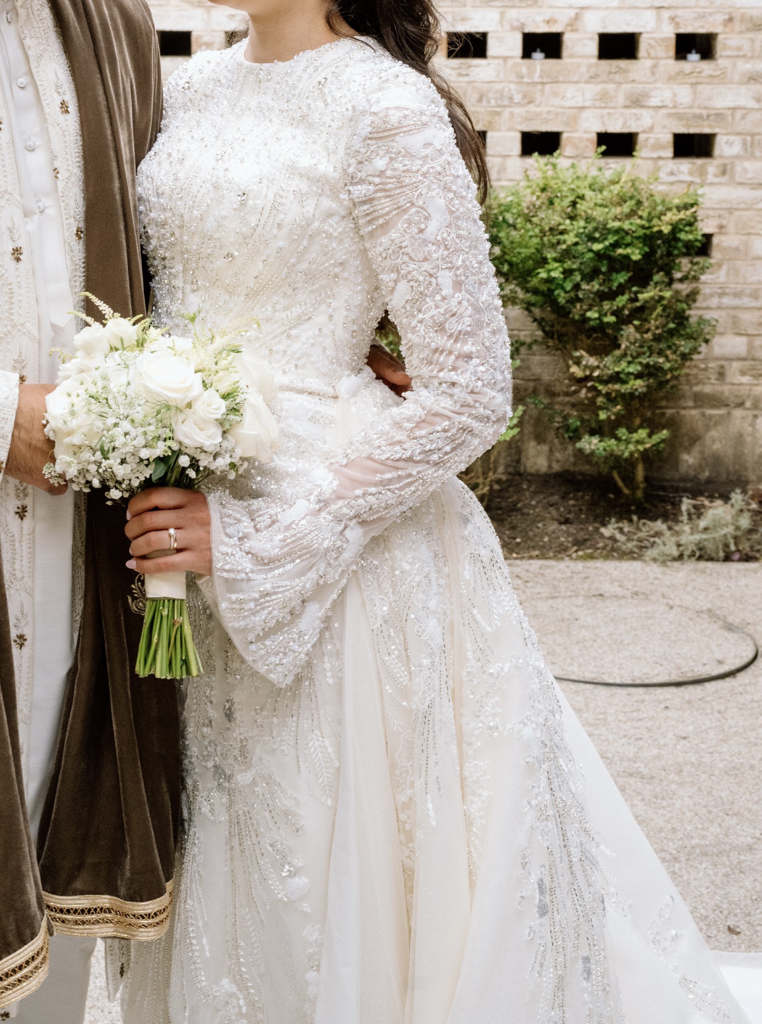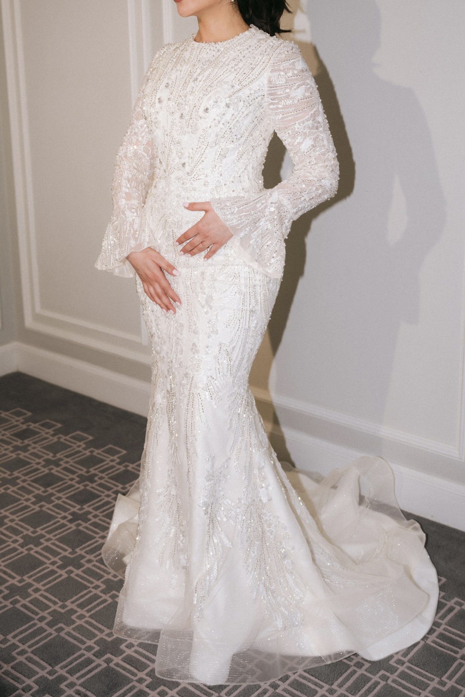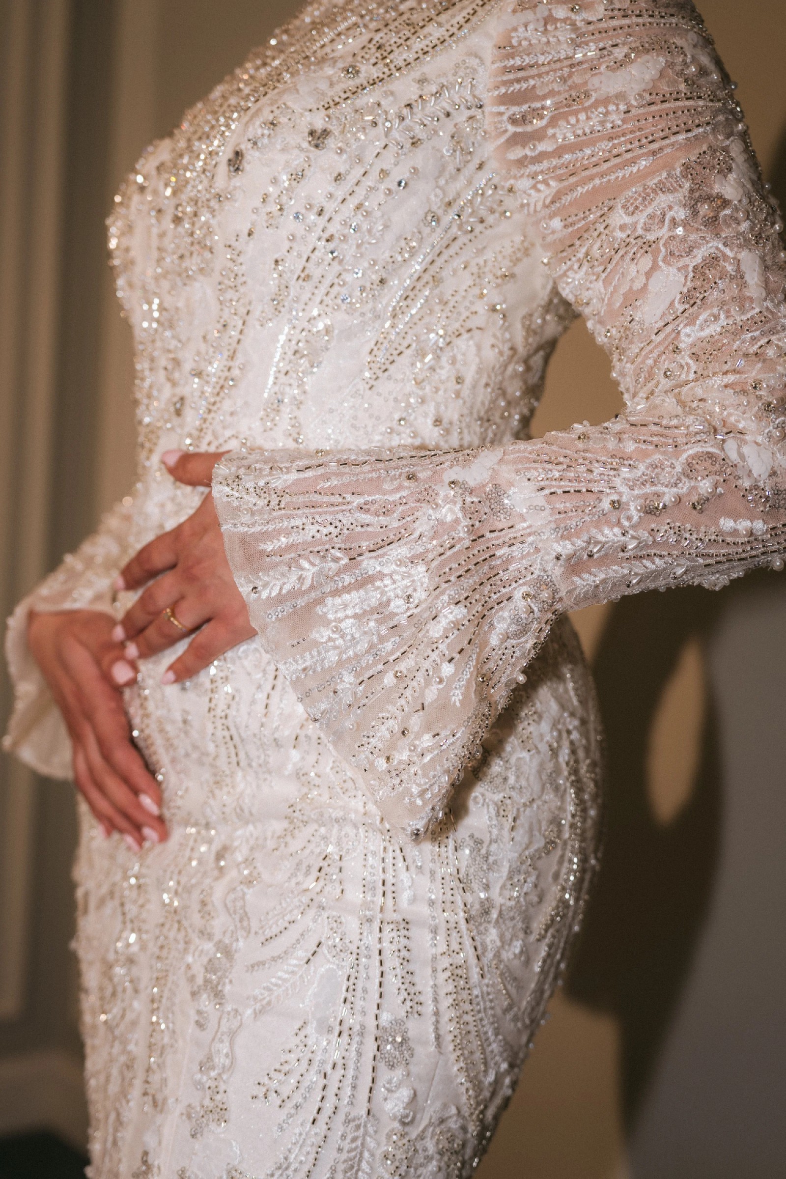 This gown features intricate hand-beaded detailing in soft ivory with silver and white embellishment that catches the light beautifully in photos while still feeling elegant and refined. The fitted mermaid silhouette is balanced with a high neckline and delicate flute sleeves, giving the gown a timeless, modest and romantic feel.