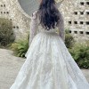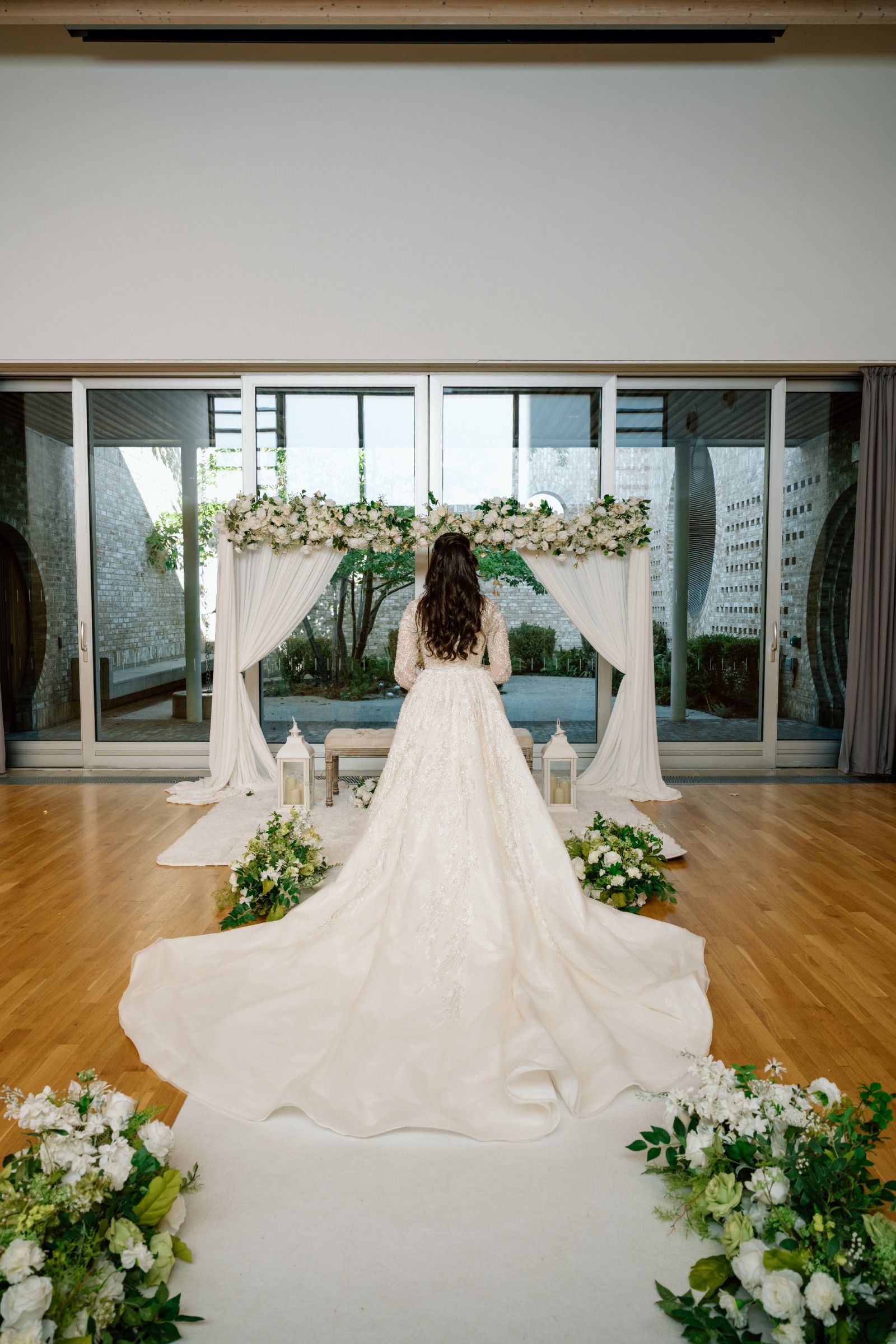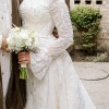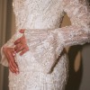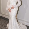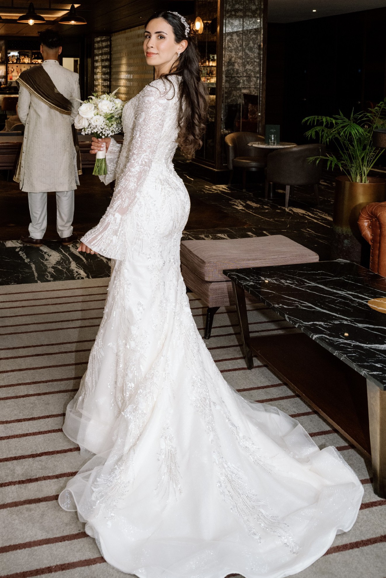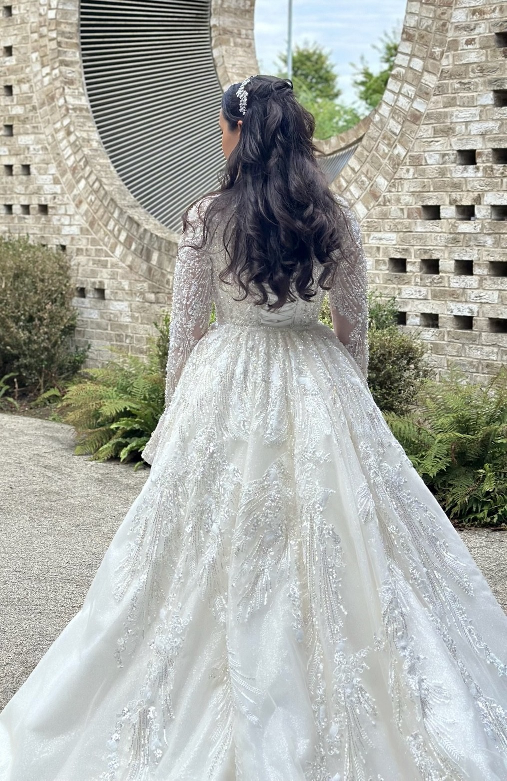 This gown features intricate hand-beaded detailing in soft ivory with silver and white embellishment that catches the light beautifully in photos while still feeling elegant and refined. The fitted mermaid silhouette is balanced with a high neckline and delicate flute sleeves, giving the gown a timeless, modest and romantic feel.