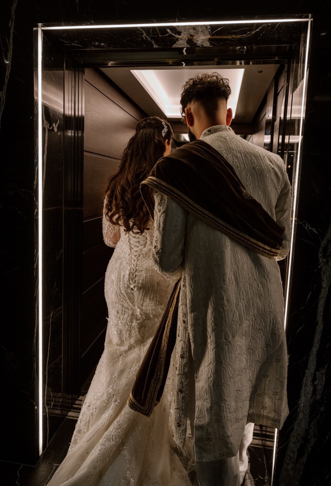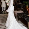 One of the standout features is the detachable overskirt, which allows for two looks in one dress. The overskirt creates a dramatic, full silhouette for the ceremony and photos, and can then be removed to reveal the sleek mermaid gown underneath for the evening.