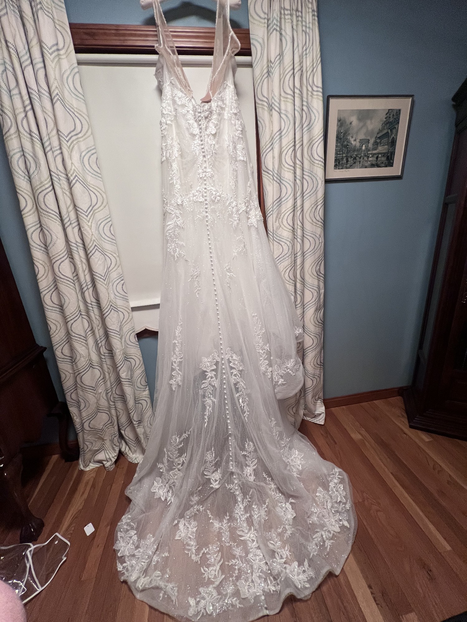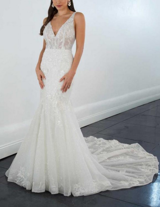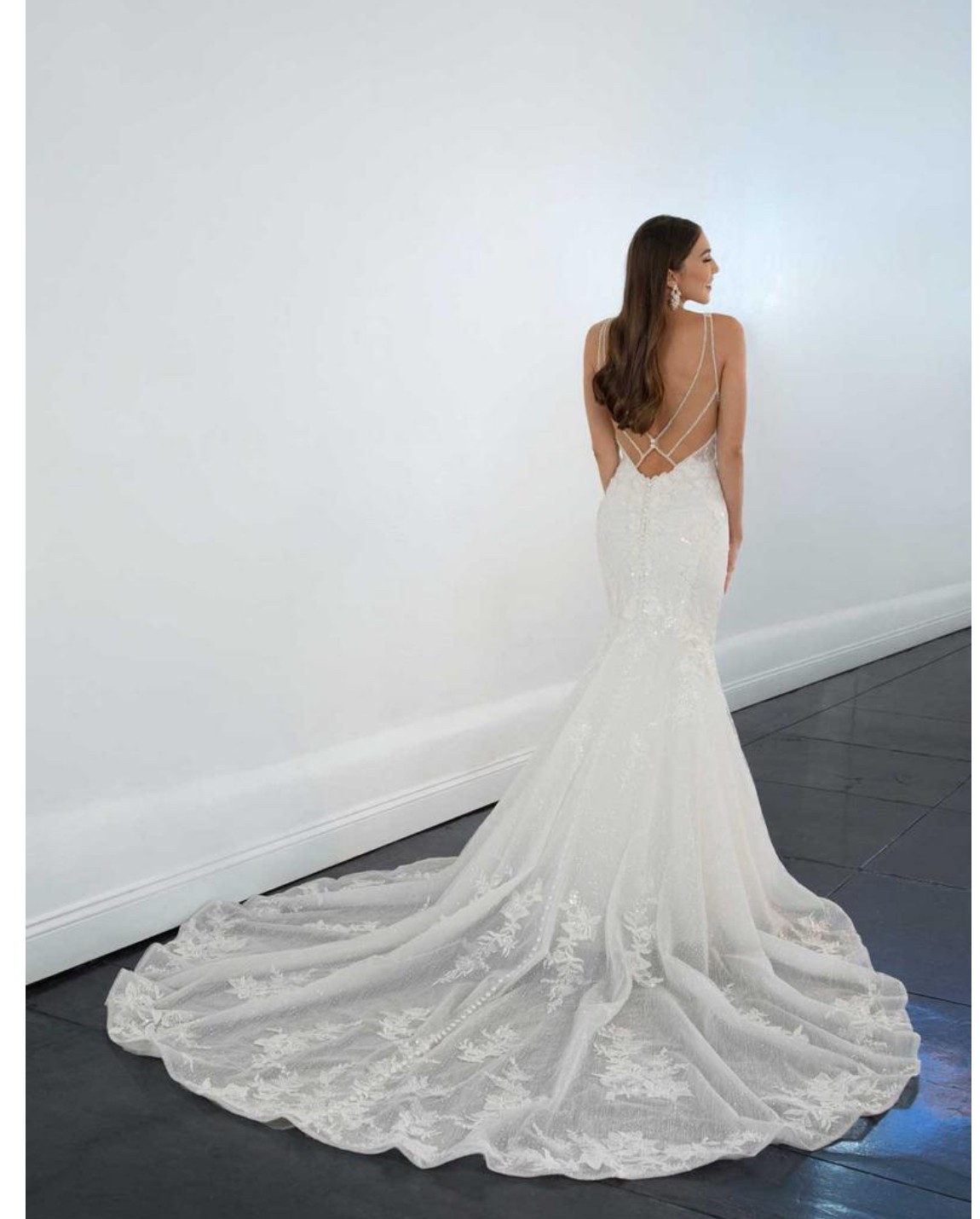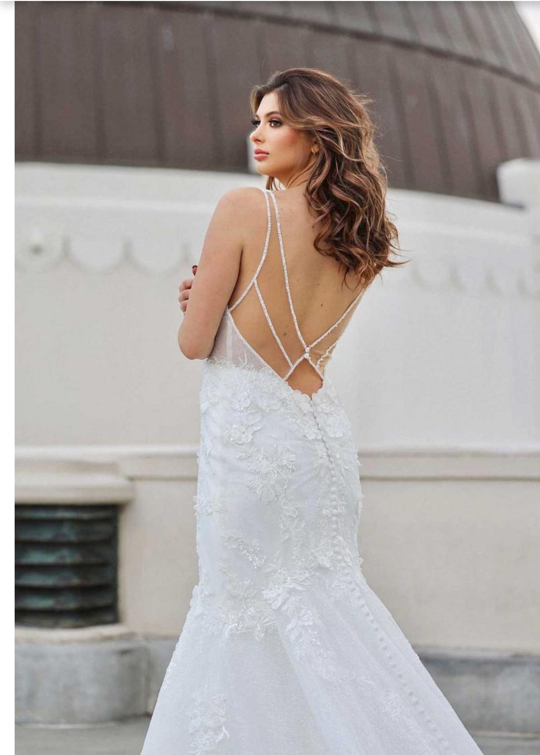 This dress isIncredible condition and waiting for a new home. STORE SAMPLE Sparkling in luxurious 3D florals, beads and sequined floral lace, Style 1547 catches every eye and every beam of light as it glides down the aisle. The stunning fit-and-flare silhouette begins at the impeccably-fitted sheer bodice with chic shoulder straps and a deep plunging V-neckline. A low back with shimmering strappy details adds a seductive touch to meet the shimmering form-fitting skirt embellished in floral designer details. Flaring past the hips into a glamorous mermaid skirt and long train, this sexy couture wedding gown is sure to make a statement down the aisle.