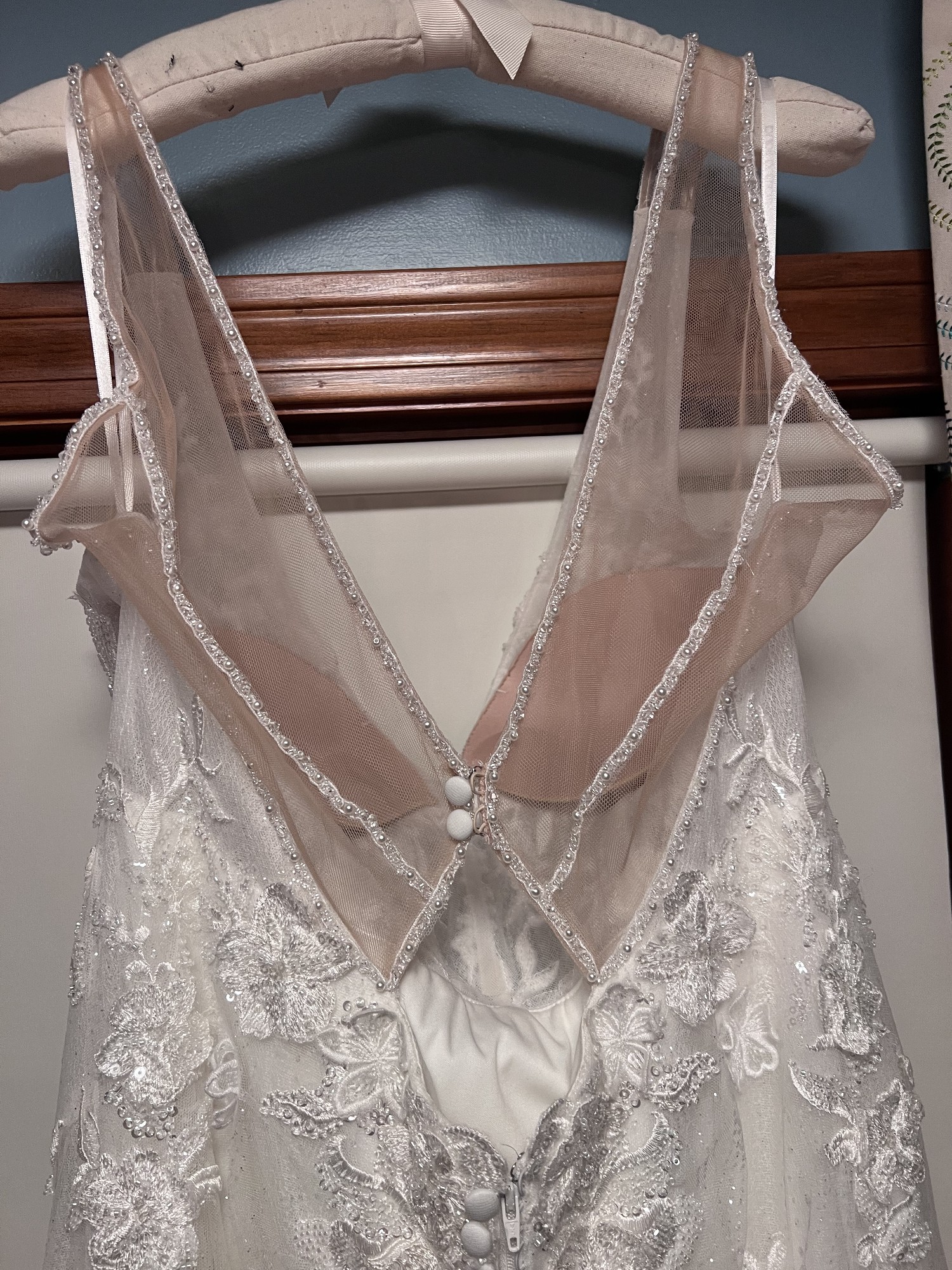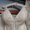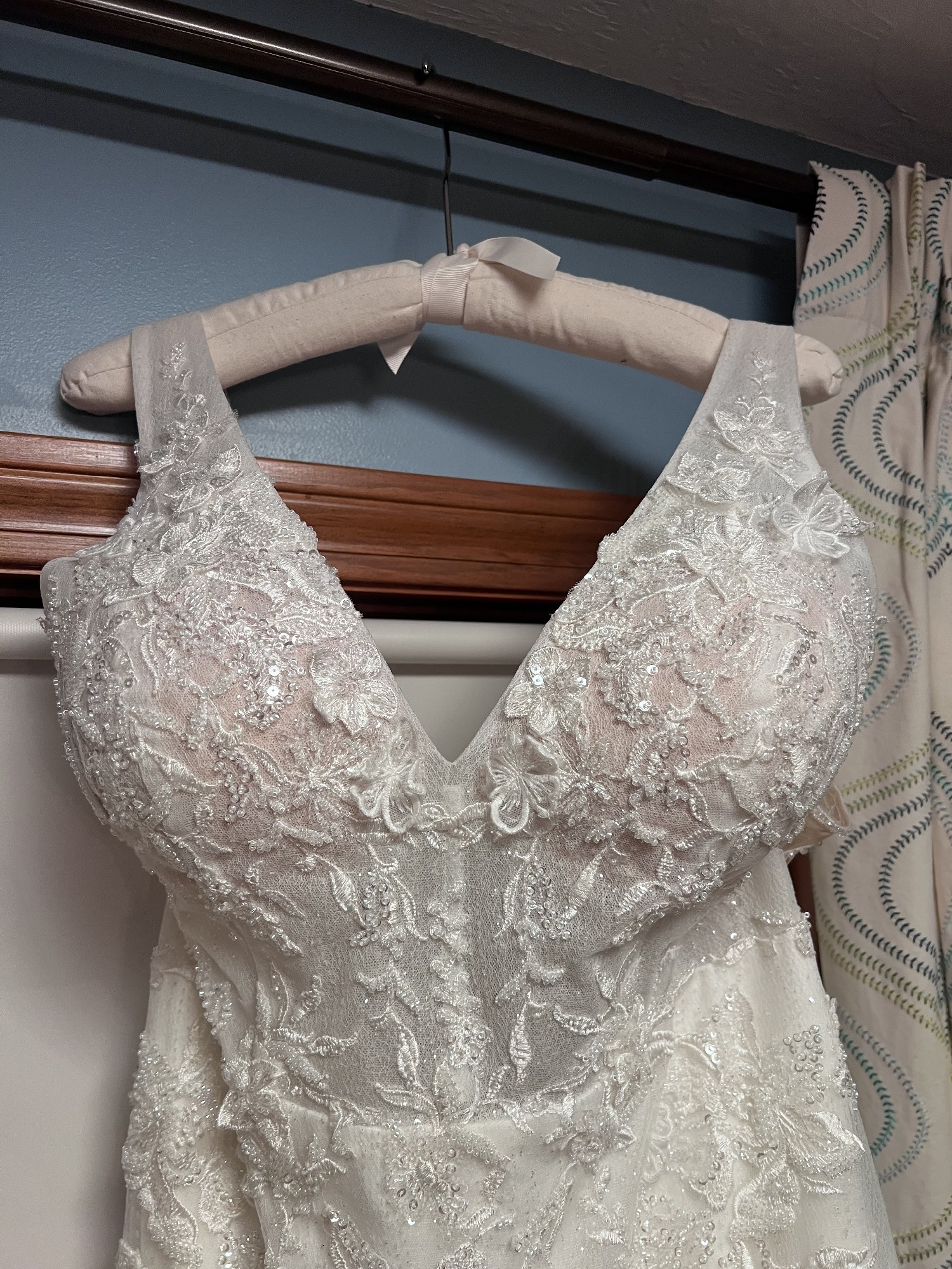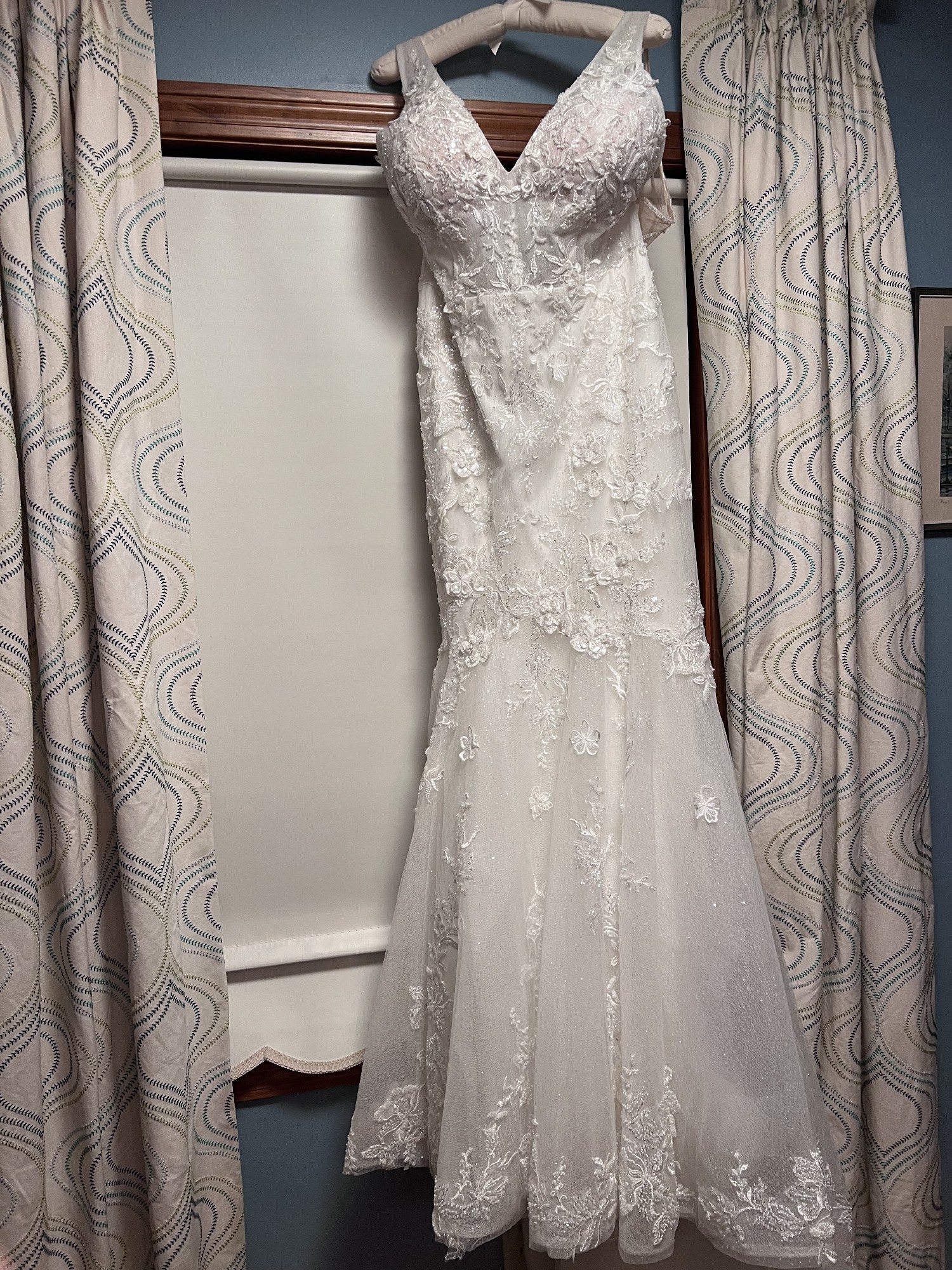 This dress isIncredible condition and waiting for a new home. STORE SAMPLE Sparkling in luxurious 3D florals, beads and sequined floral lace, Style 1547 catches every eye and every beam of light as it glides down the aisle. The stunning fit-and-flare silhouette begins at the impeccably-fitted sheer bodice with chic shoulder straps and a deep plunging V-neckline. A low back with shimmering strappy details adds a seductive touch to meet the shimmering form-fitting skirt embellished in floral designer details. Flaring past the hips into a glamorous mermaid skirt and long train, this sexy couture wedding gown is sure to make a statement down the aisle.