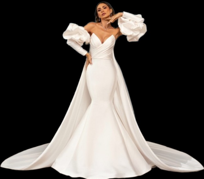 Say 'I do' in style and let your personality shine through in this elegant and timeless dress. With its classic silhouette, this is the perfect wedding dress for the stylish bride to be.Elevate your bridal look with the Primrose All Over Mikado Dress by Kitty Chen Couture. Make a grand entrance with this sophisticated off-shoulder wedding dress. Featuring dramatic puff sleeves and a flowing train, this cream gown is perfect for your special day. This mermaid gown features a strapless design and a vintage off-the-shoulder neckline in a timeless ivory hue. The solid pattern creates a sleek silhouette, accented by a sophisticated button closure.