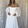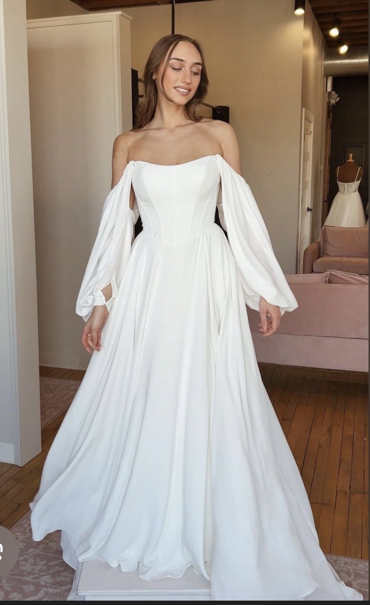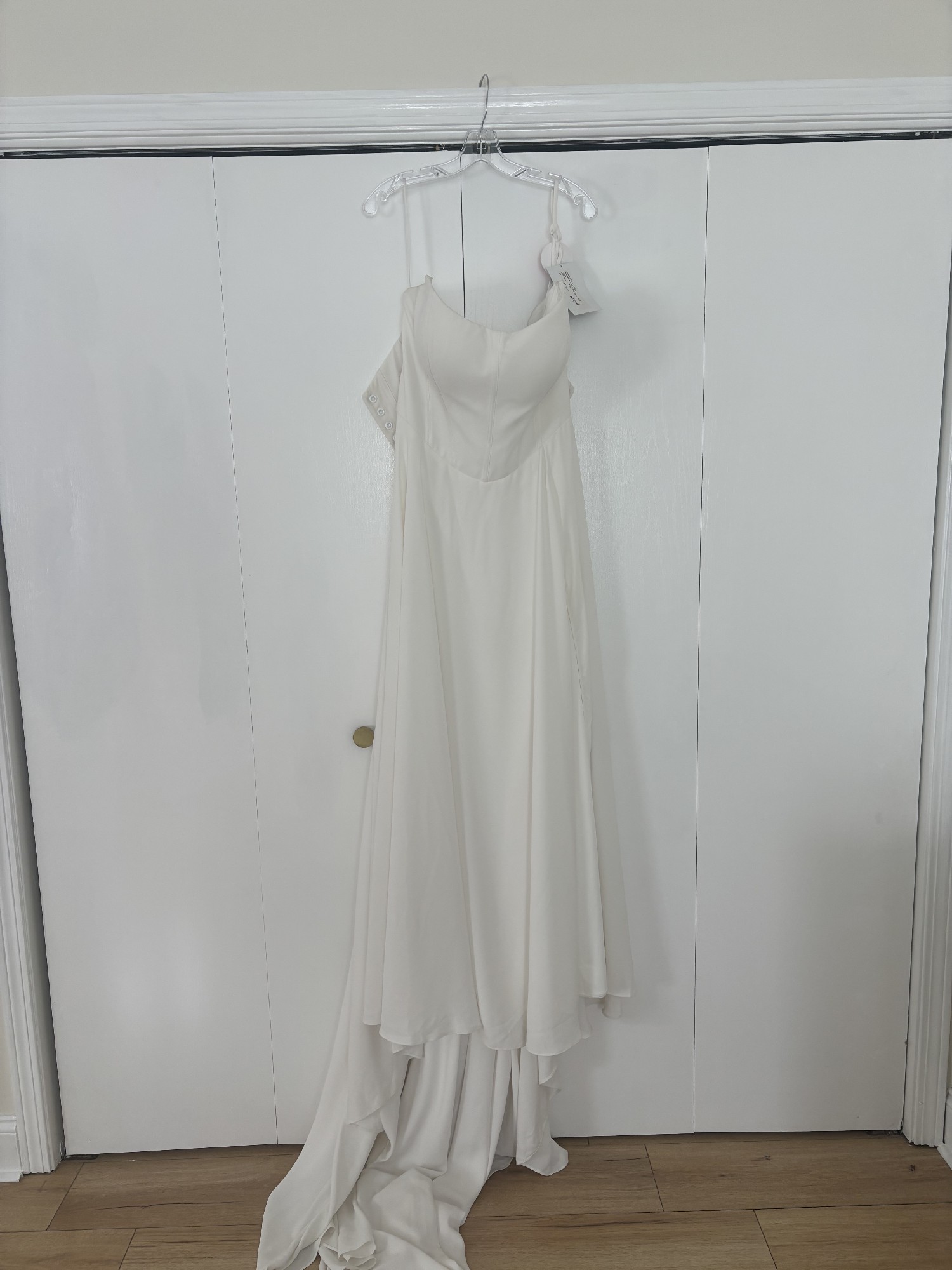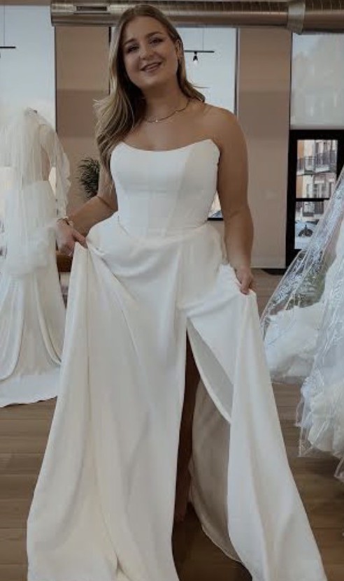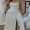 Crafted for brides who appreciate both style and sophistication, the strapless design highlights the shoulders and collarbone, allowing for a timeless and captivating look. The corset back adds an element of allure, providing a customizable fit that ensures you feel confident throughout your special day. The lush fabric drapes beautifully, enhancing your figure while offering a classic yet contemporary feel.