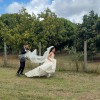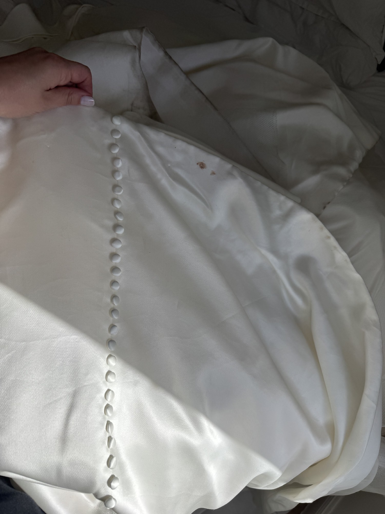 Price flexible! Selling this gorgeous Ines Di Santo Quice wedding gown! Timeless yet chic and sexy yet classy. Made from luxurious ivory satin (I paid extra for the extra ~fancy~ fabric). It’s surprisingly lightweight for it being a ballgown. It has a classic line of buttons that runs down the train and mesh cutouts on the sides, as well as a gorgeous slit. IT HAS HUGE POCKETS!!! Purchased as a size 8 but Ines Di Santo runs very large. Tailored to about a size 2. I am 5’4” and wore 3” heels. I wore it for my wedding (obviously) and the bottom got pretty stained because it was raining. I got it dry-cleaned post-wedding and they couldn’t remove the stains so I’m sure you would need to get it hemmed a bit (perfect for short brides), or send it to a wedding dress restoration cleaner since regular dry cleaners usually don’t try some cleaning techniques because they prioritize being gentle. I recently also wore it for an outdoor photoshoot and it got a bit dirty again (the marks in the front/body of the dress) but those are fresh and I’m sure will come right out if dry cleaned again. During the photoshoot, a little tiny tear also happened in the front mesh between the boobs (pictured) which can easily be repaired by your tailor if necessary but you can hardly see it. One of the buttons at the waist popped off when I wore it for the photoshoot too but I have the button and I’m sure a tailor can pop it back on. Priced accordingly!