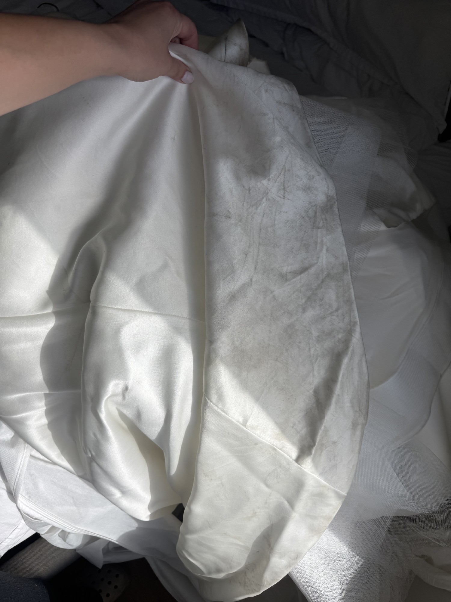 - Stains at the hem that didn’t come out after dry cleaning (it rained at my wedding)