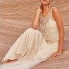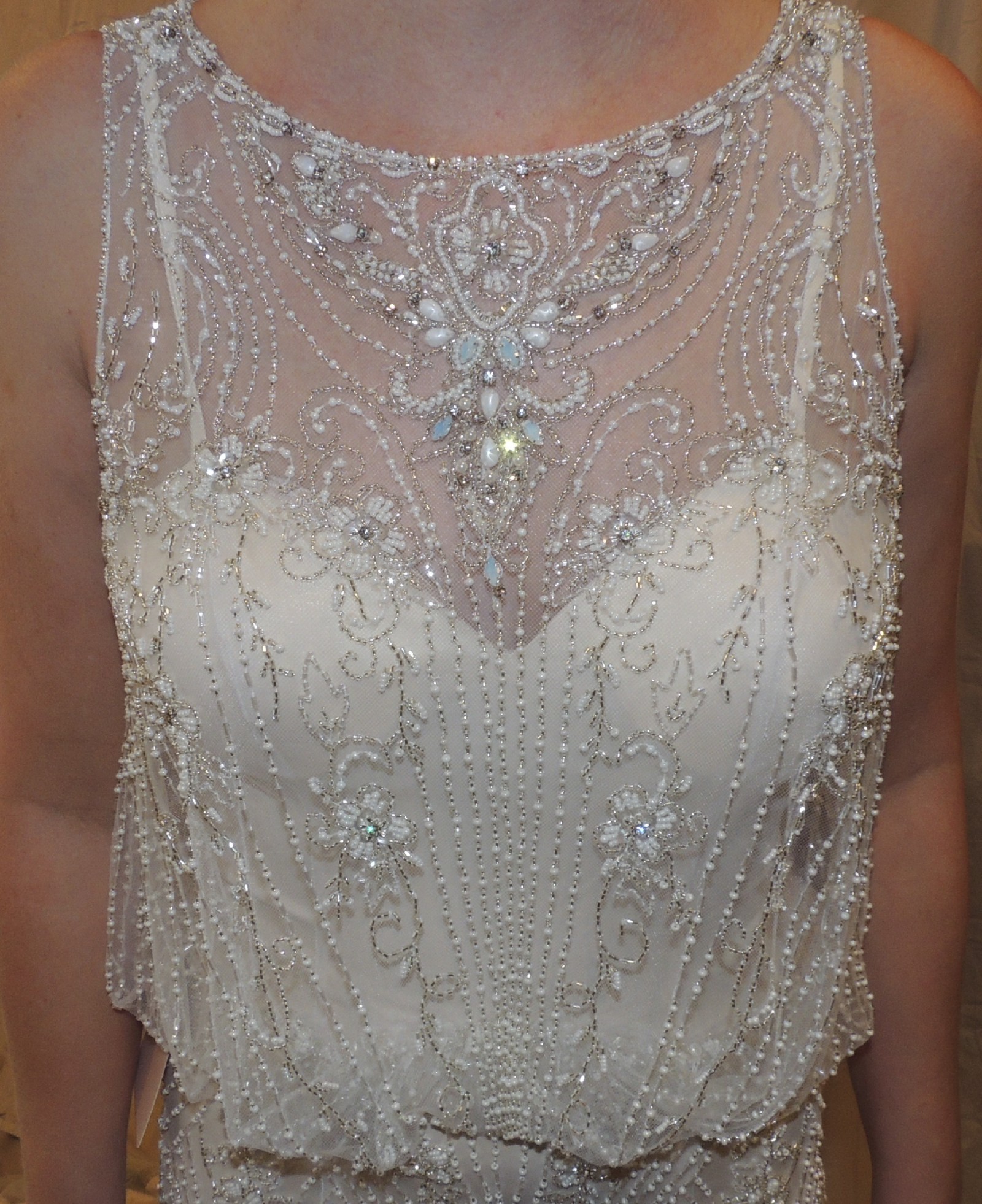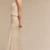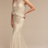 The BHLDN Jacinda gown is glamorous Art Deco-style gown covered in delicate beading to make you feel like a 1920s movie star. Take a step back into the glamourous Art Deco period in this exquisite blouson gown. One-of-a-kind beading bejewels the illusion neckline, cascading over the tulle overlay. Covered buttons run up the back for a feminine accent.