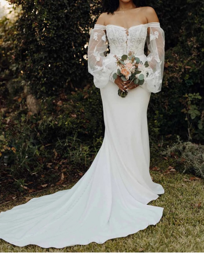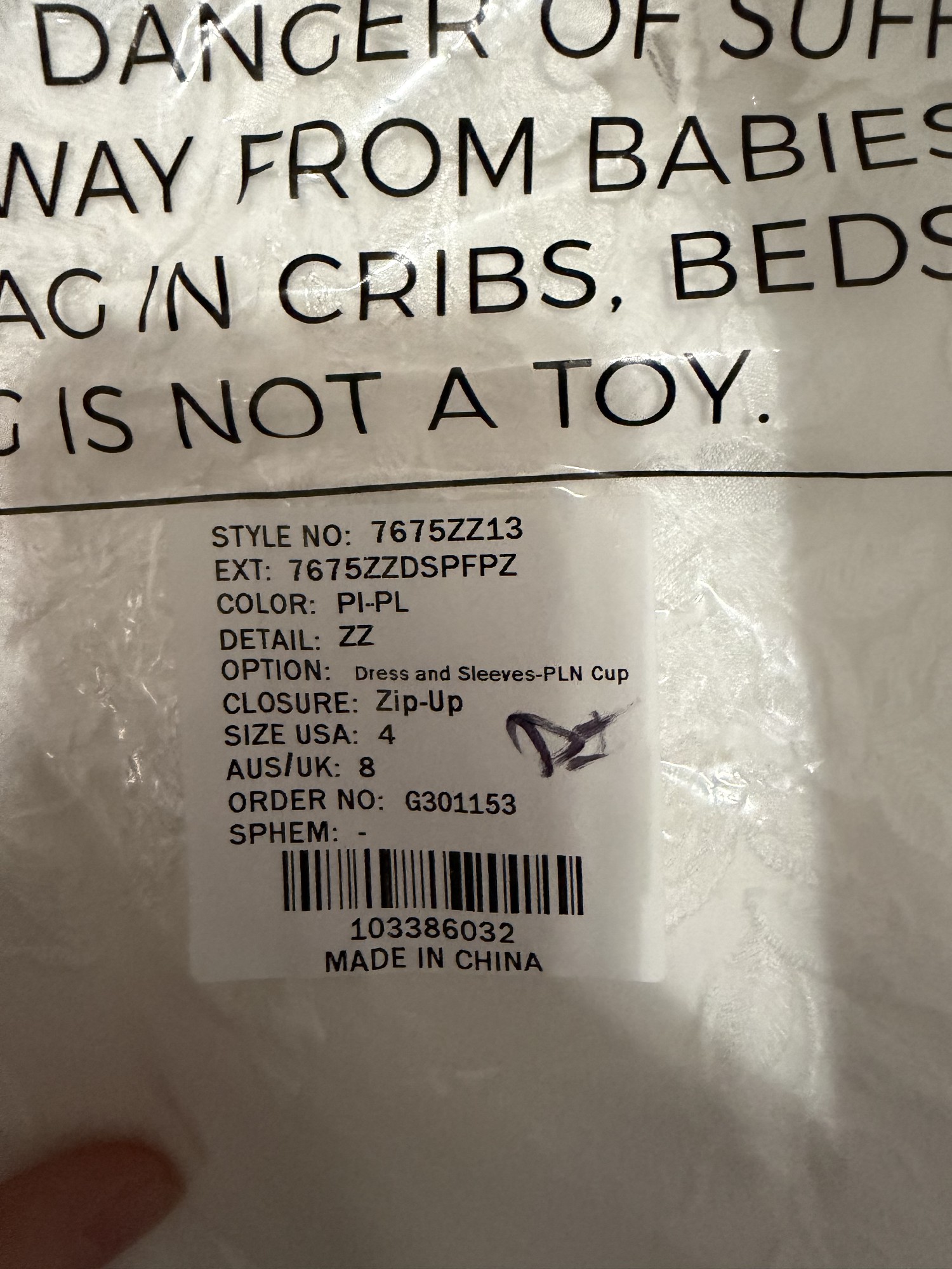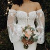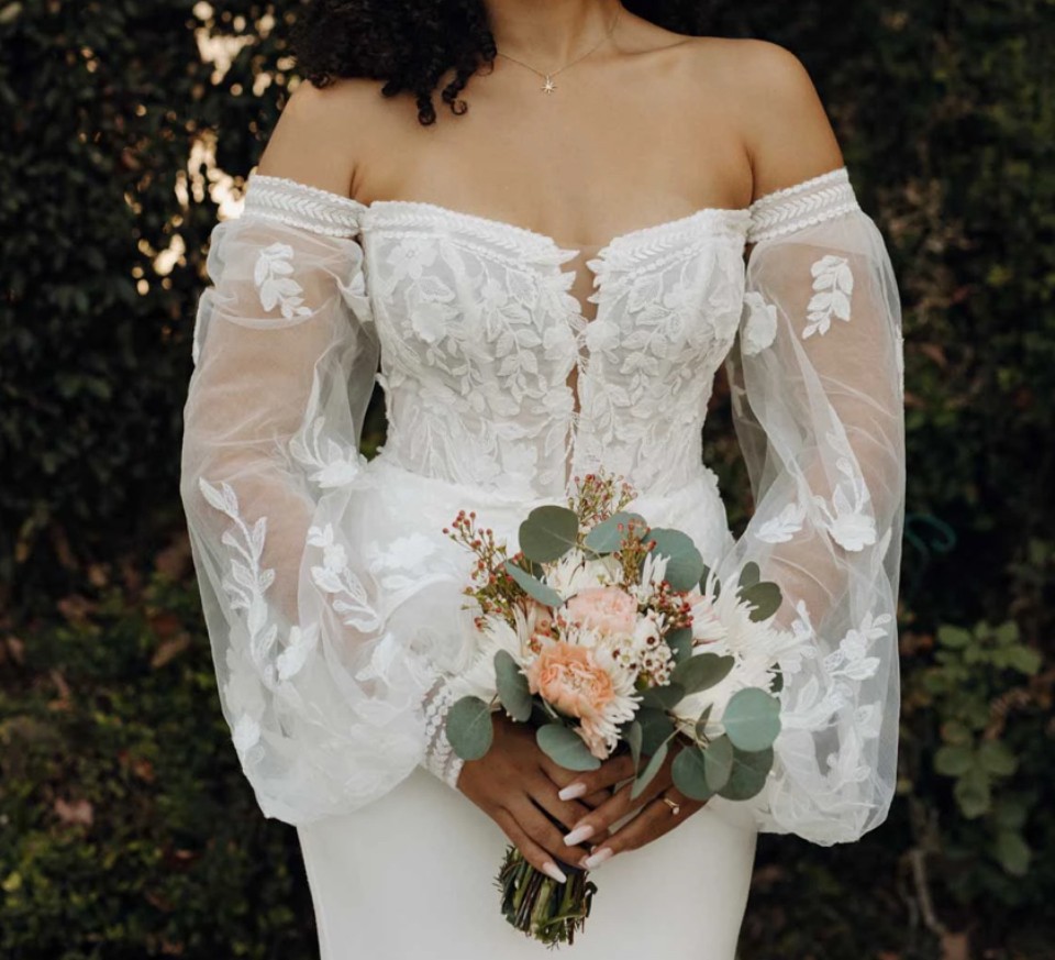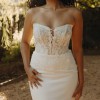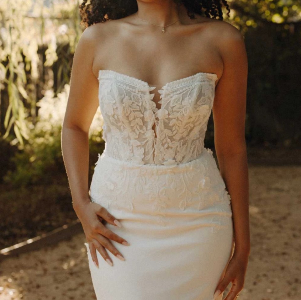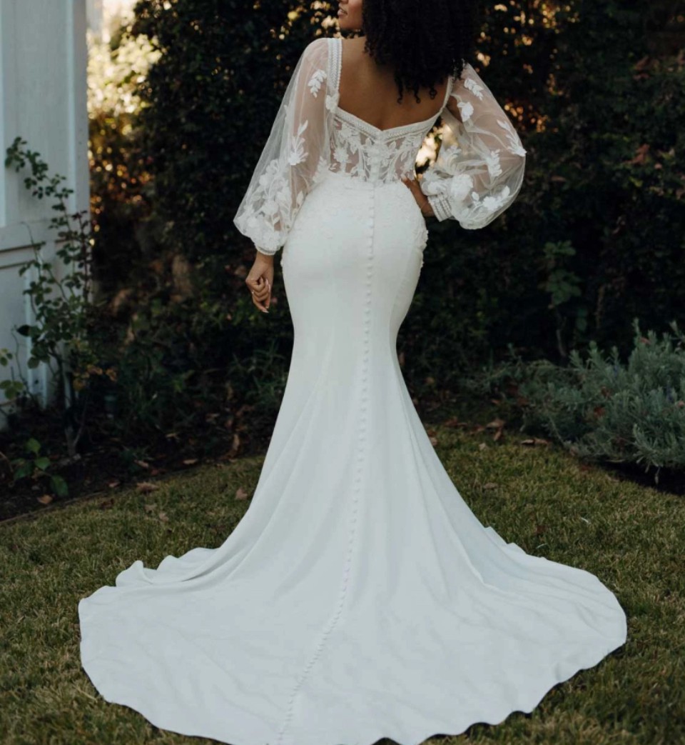 What sets this dress apart are the detachable sleeves, offering versatility for your bridal look. Whether you desire a classic or more contemporary appearance, you can easily transform your gown throughout the day. From the heartfelt ceremony to the lively reception, this Stella York creation will make you look and feel unforgettable. Indulge in the magic of your special day in this exquisite wedding dress that reflects love and joy in every detail.