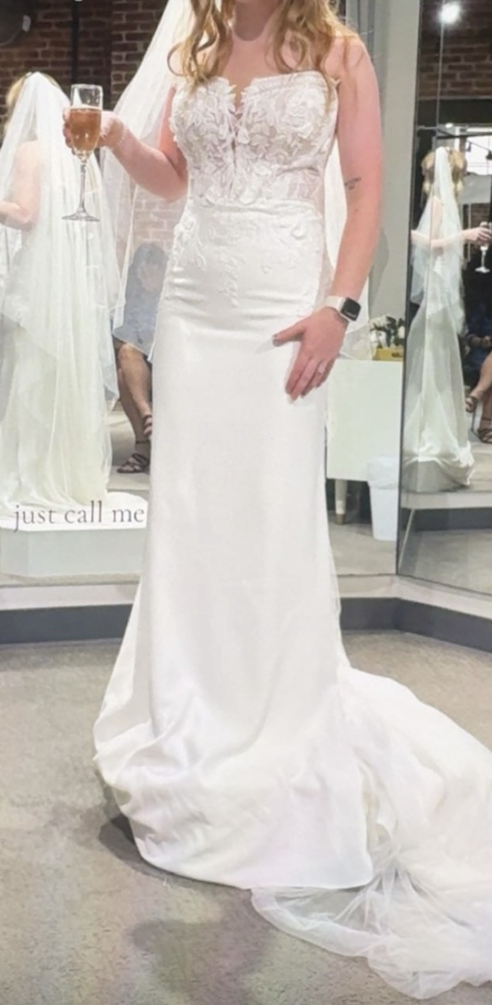 This stunning Stella York wedding dress is a true masterpiece that embodies elegance and romance. Featuring a captivating fit and flare silhouette, it beautifully accentuates your figure while allowing for graceful movement. The sheer white fabric catches the light, creating a breathtaking look that is perfect for any bride envisioning her dream day.