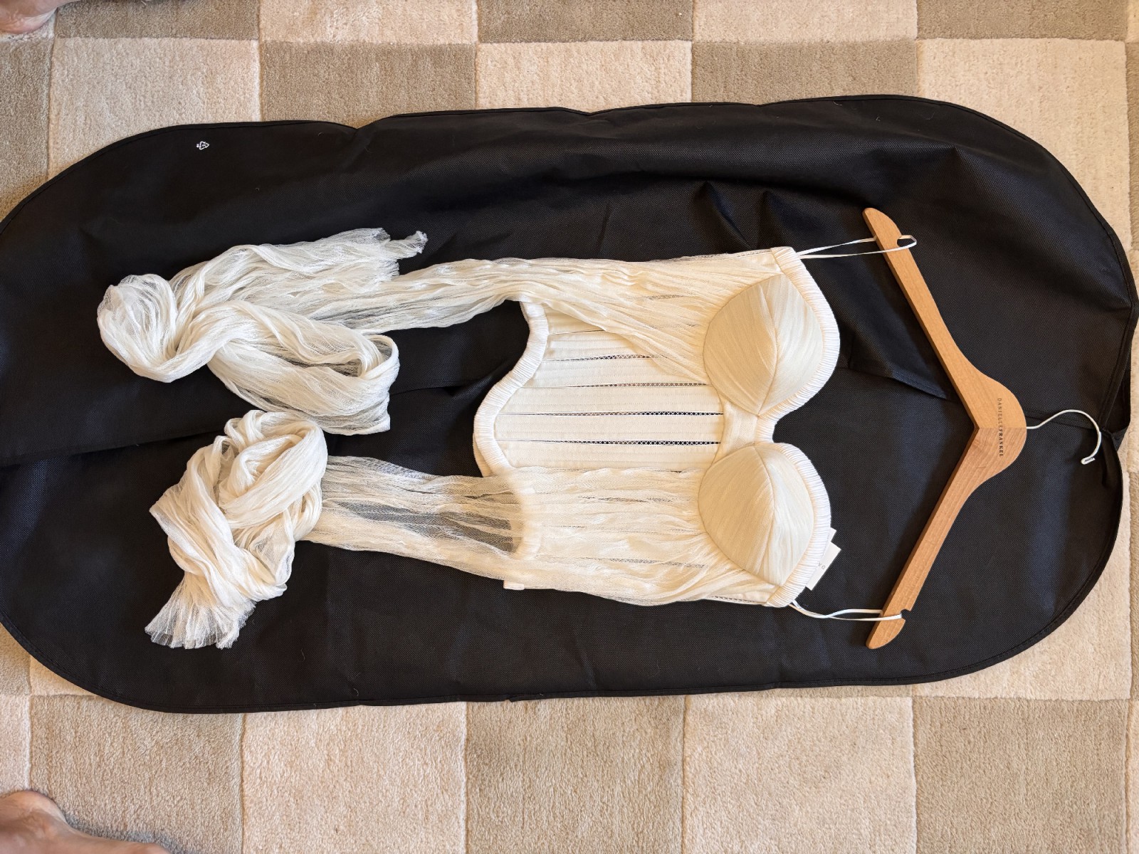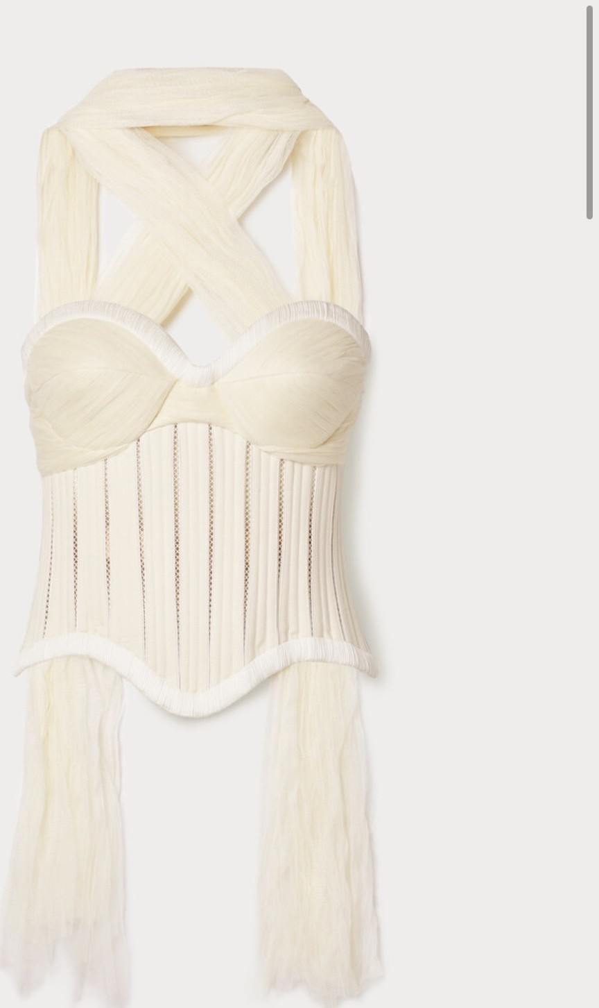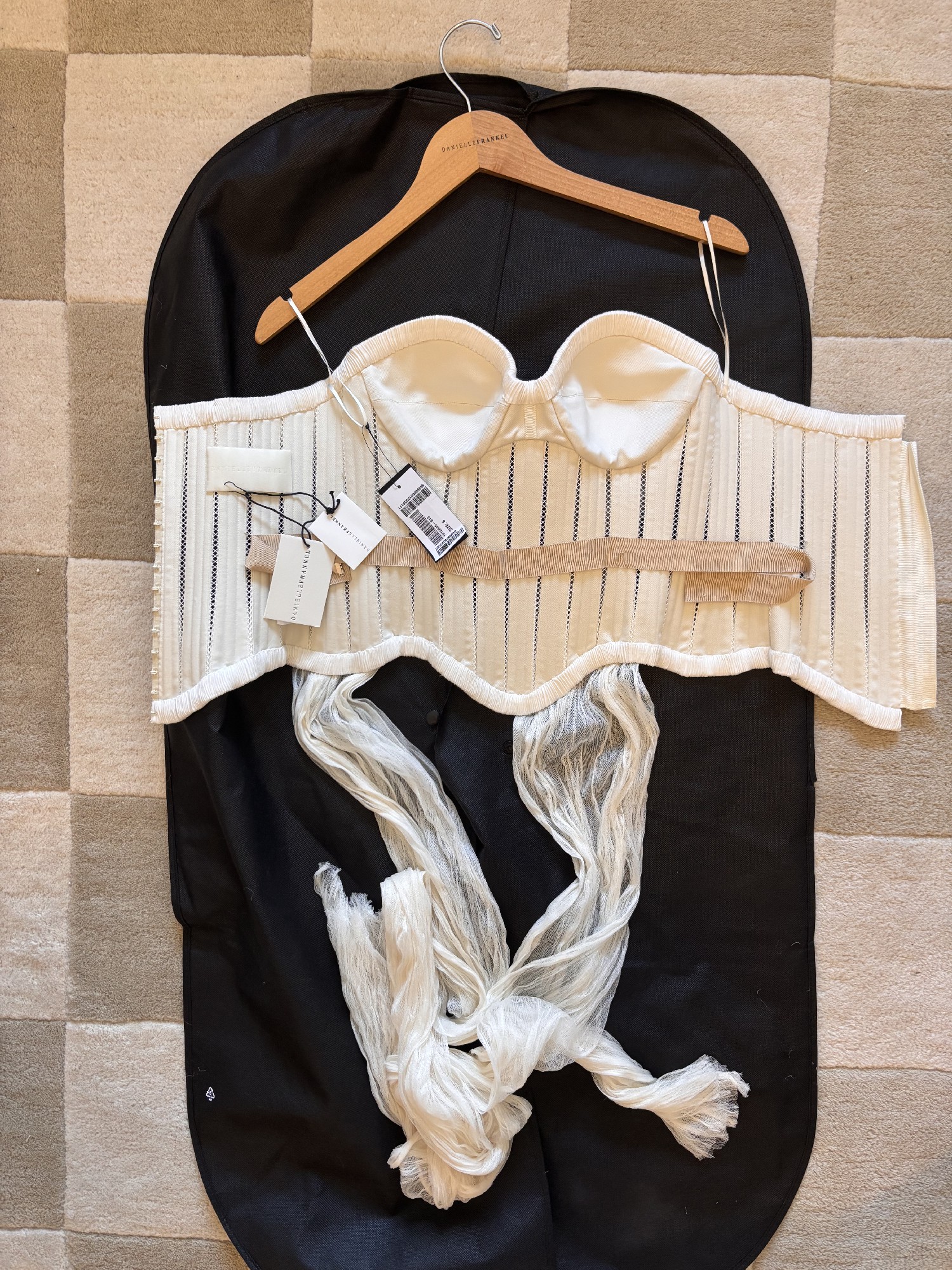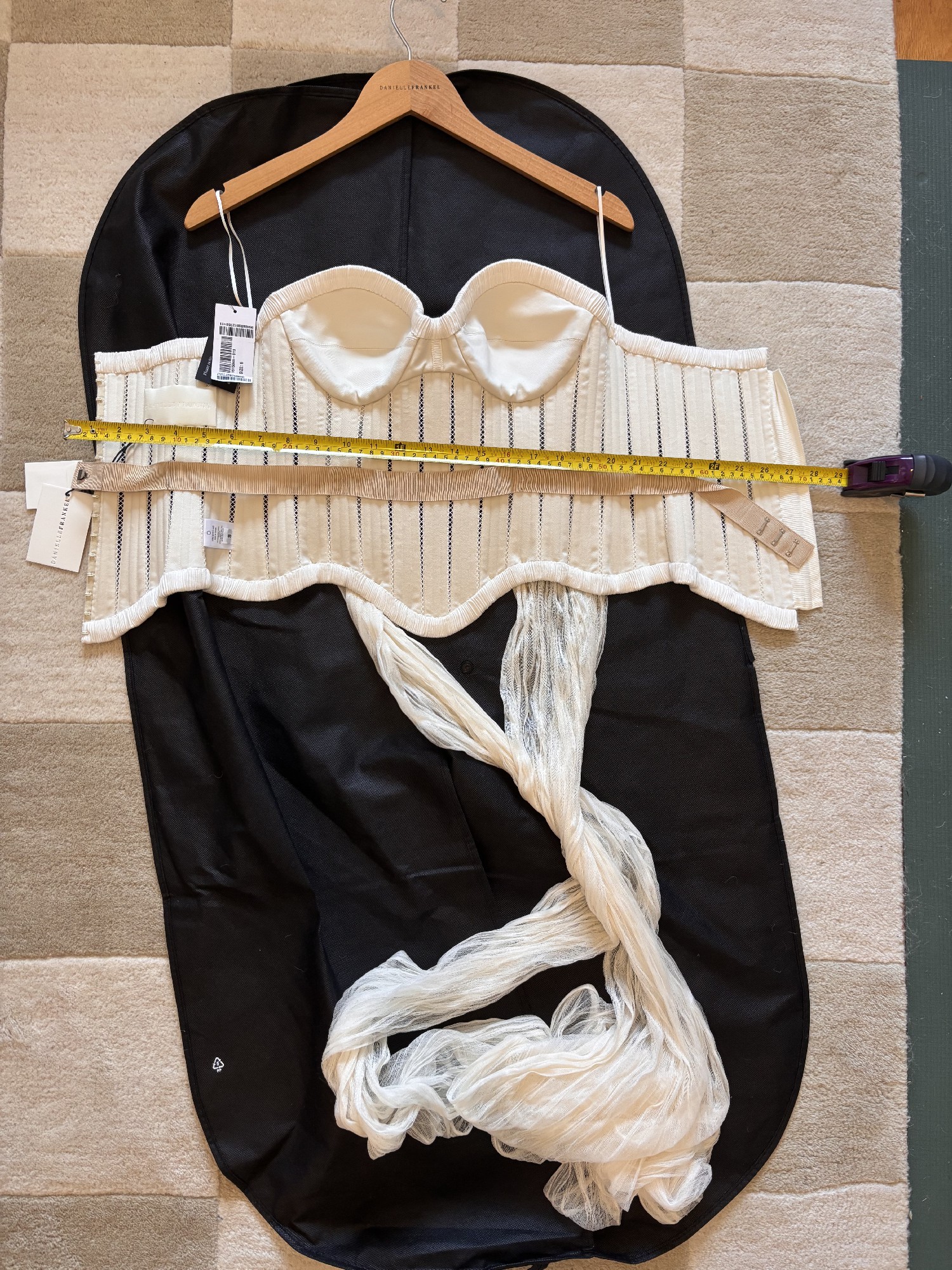 NEW WITH TAGS: I purchased two sizes because I wasn’t sure which size I was. The Anika top is beautiful on its own or with the Georgia skirt from Danielle Frankel. Lace and piped cotton twill basque waisted bodice. Exaggerated soft tulle, pleated streamers at bust and full hook and eye closure at back.
