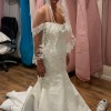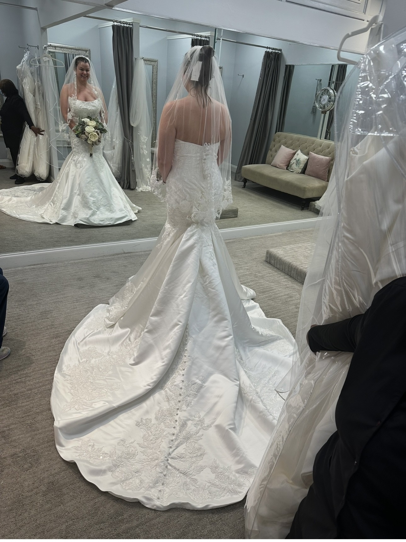 This stunning Maggie Sottero Ruth dress was the perfect addition to my wedding day, and now I’m excited to pass it on to another bride who will feel as beautiful as I did. Crafted in luxurious ivory satin, its fit and flare silhouette beautifully hugged my curves, creating a striking and timeless look. The strapless design showcases a chic low back, bringing an alluring elegance that garnered compliments from everyone.