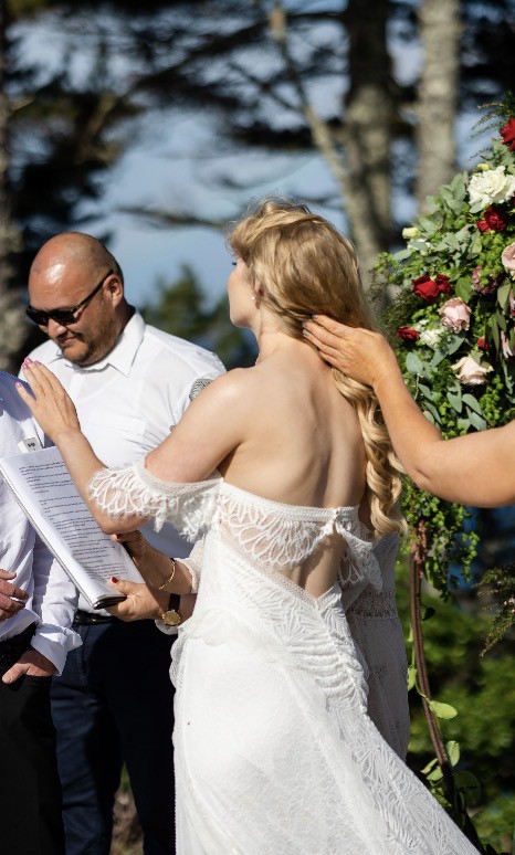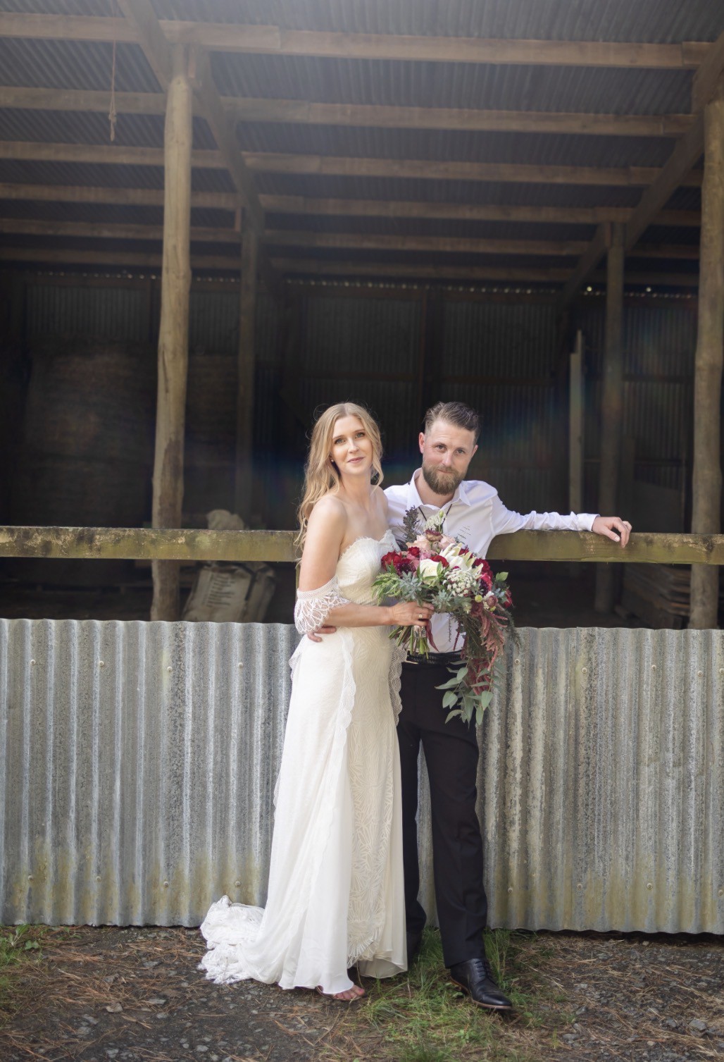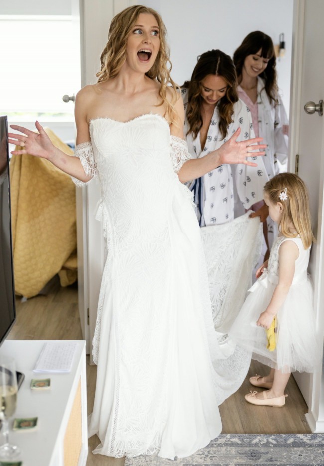 This lace wedding dress is effortlessly balanced and detailed with off-the-shoulder scalloped edge armbands and back strap, bringing to life a bohemian feel.